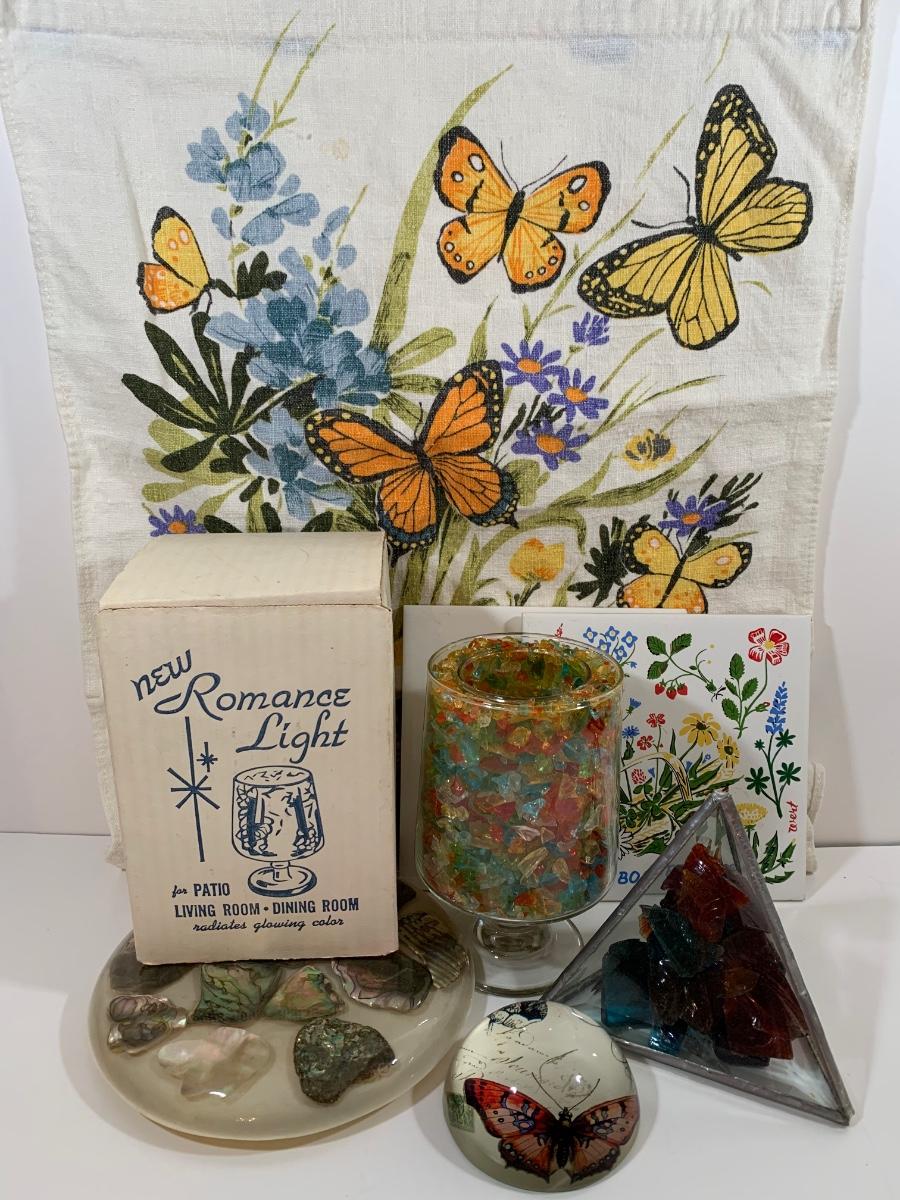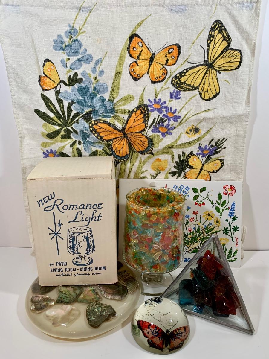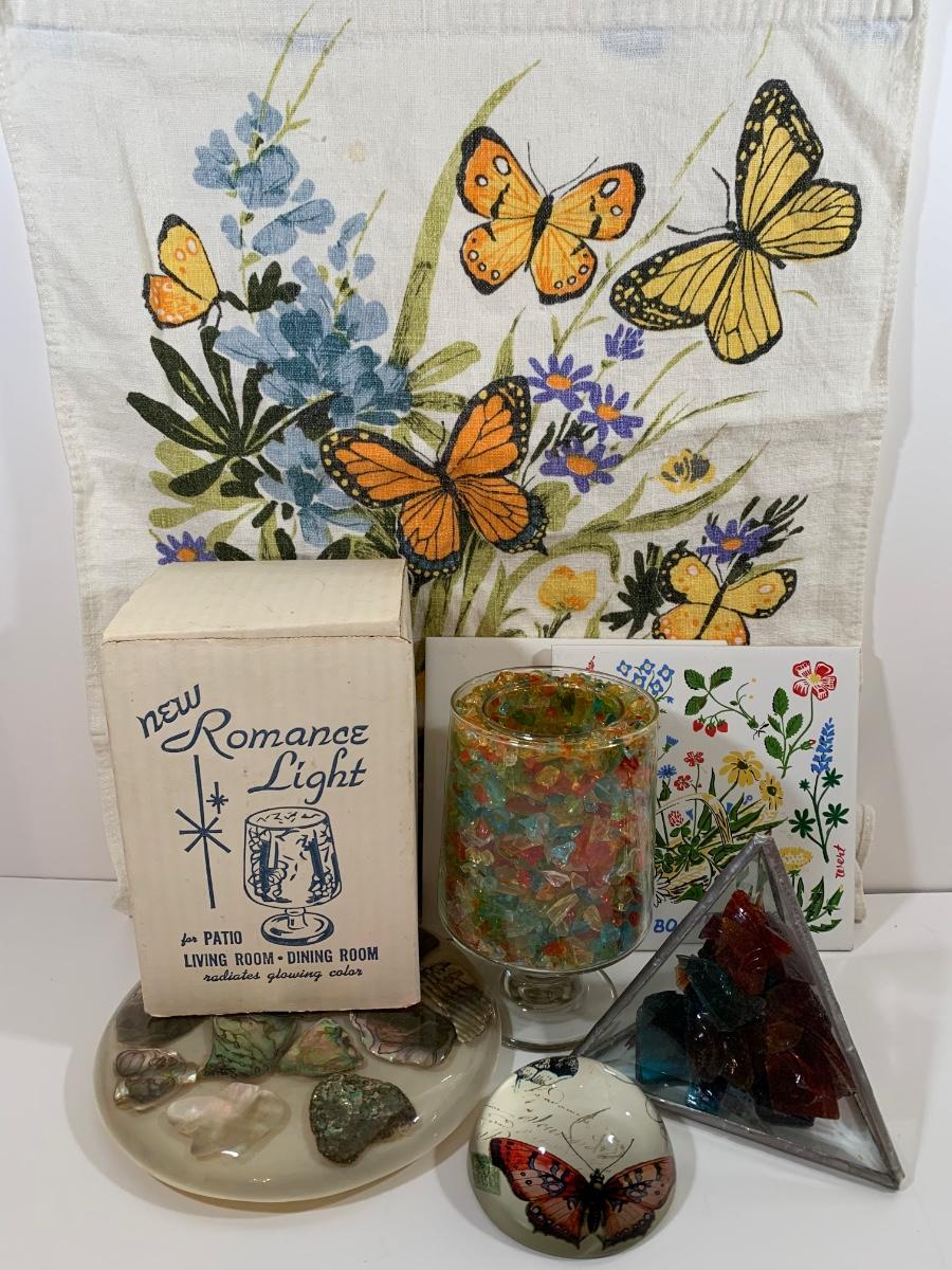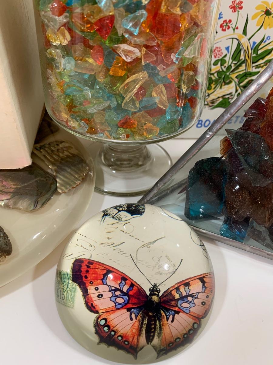 Butterfly and glass collection: candle holder w/box, Stained glass triangle filled with glass pieces to create a prism of lights when placed in the sun, trivets along with a butterfly paper weight and "tea towel"