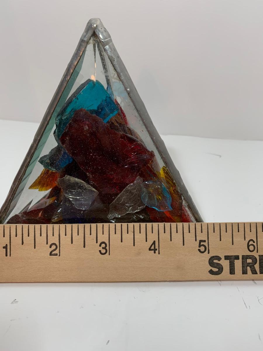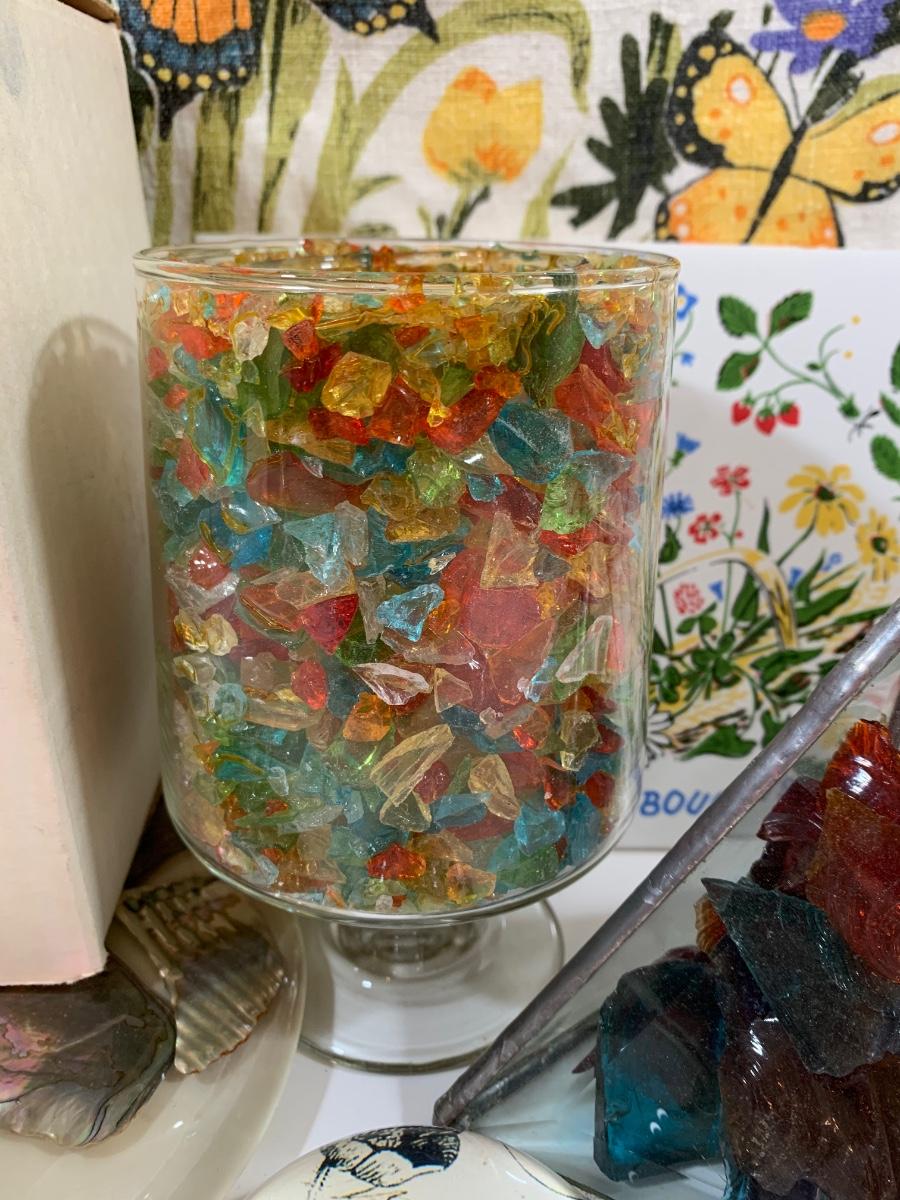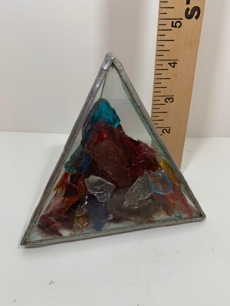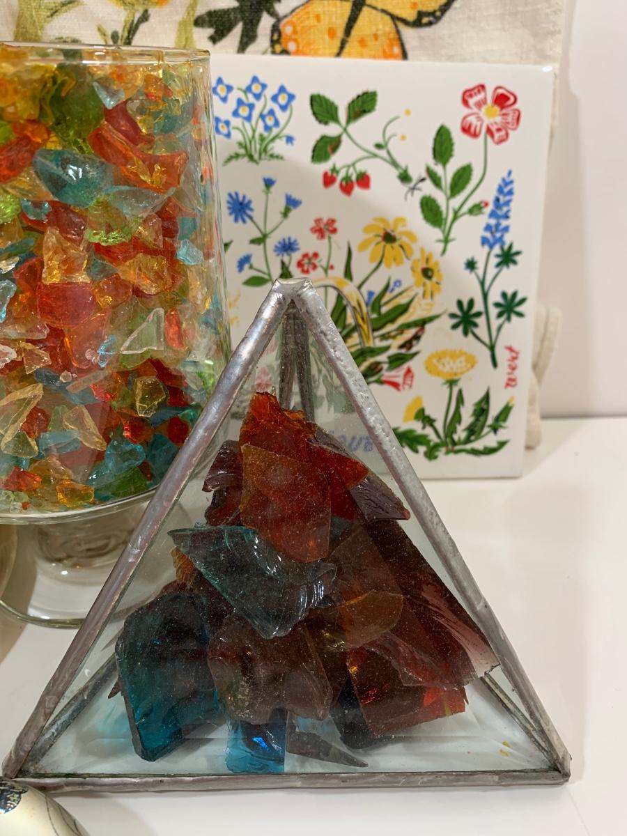 Butterfly and glass collection: candle holder w/box, Stained glass triangle filled with glass pieces to create a prism of lights when placed in the sun, trivets along with a butterfly paper weight and "tea towel"