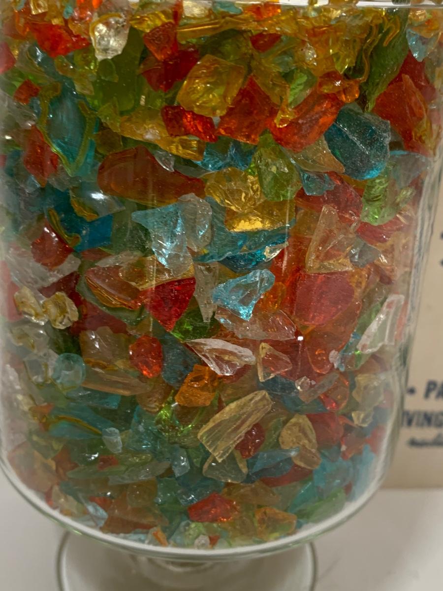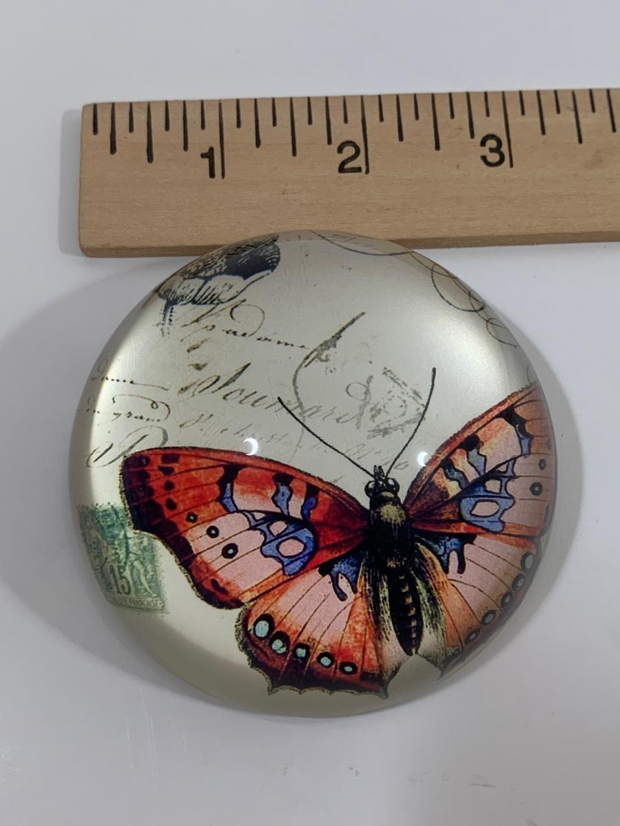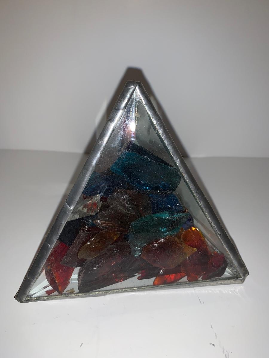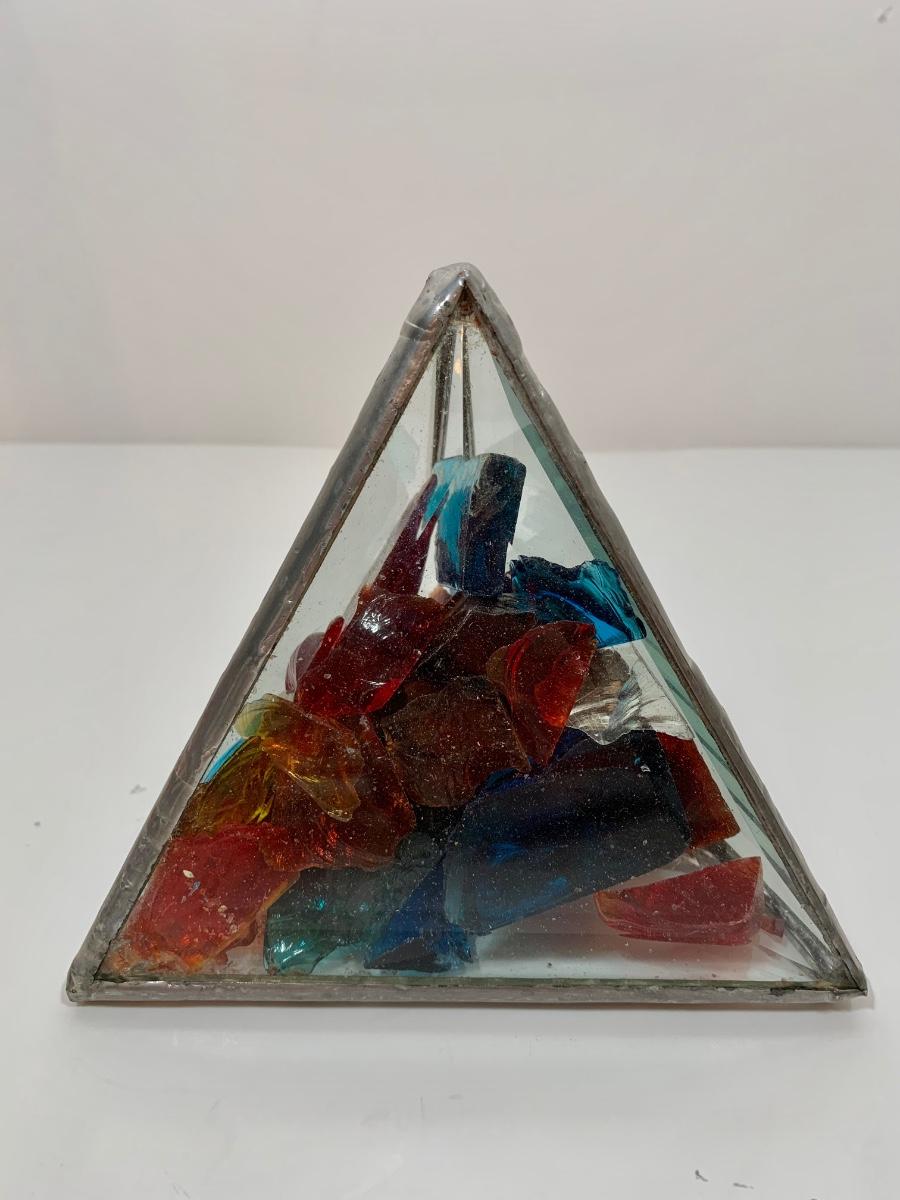Butterfly and glass collection: candle holder w/box, Stained glass triangle filled with glass pieces to create a prism of lights when placed in the sun, trivets along with a butterfly paper weight and "tea towel"