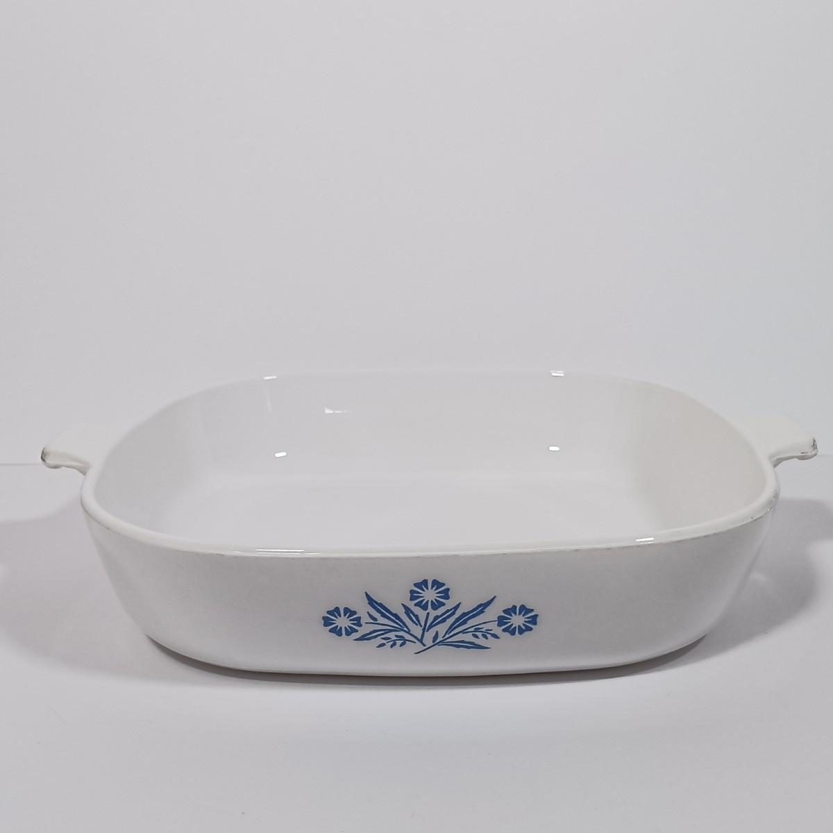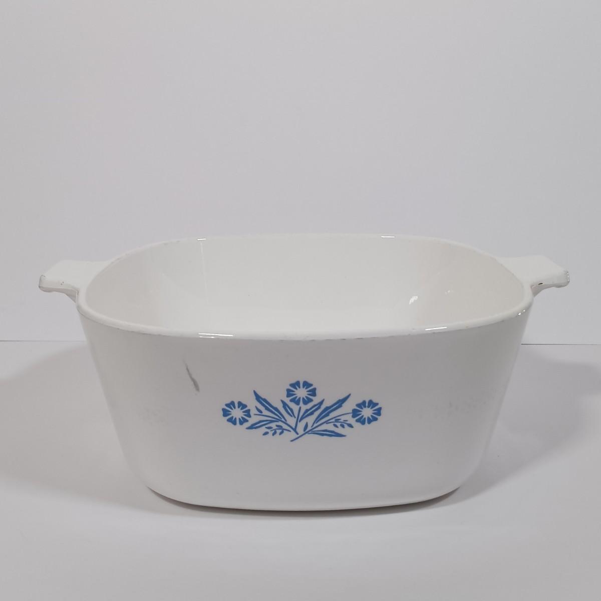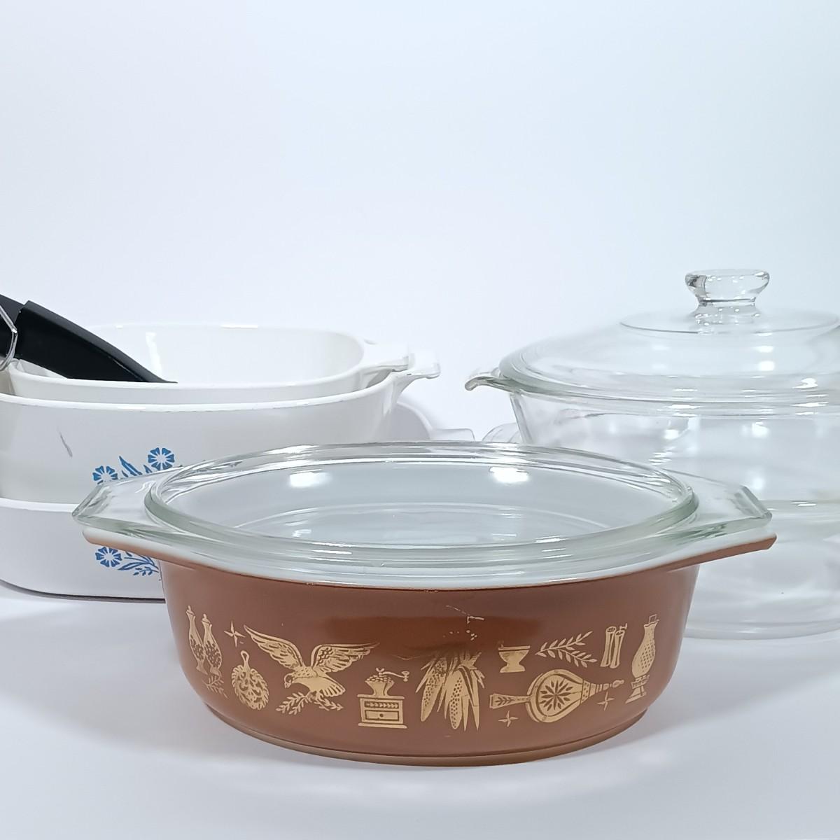 LOT 126L: Pyrex Early American Covered Casserole Dish, Corningware Cornflower Blue Casserole Dishes & More