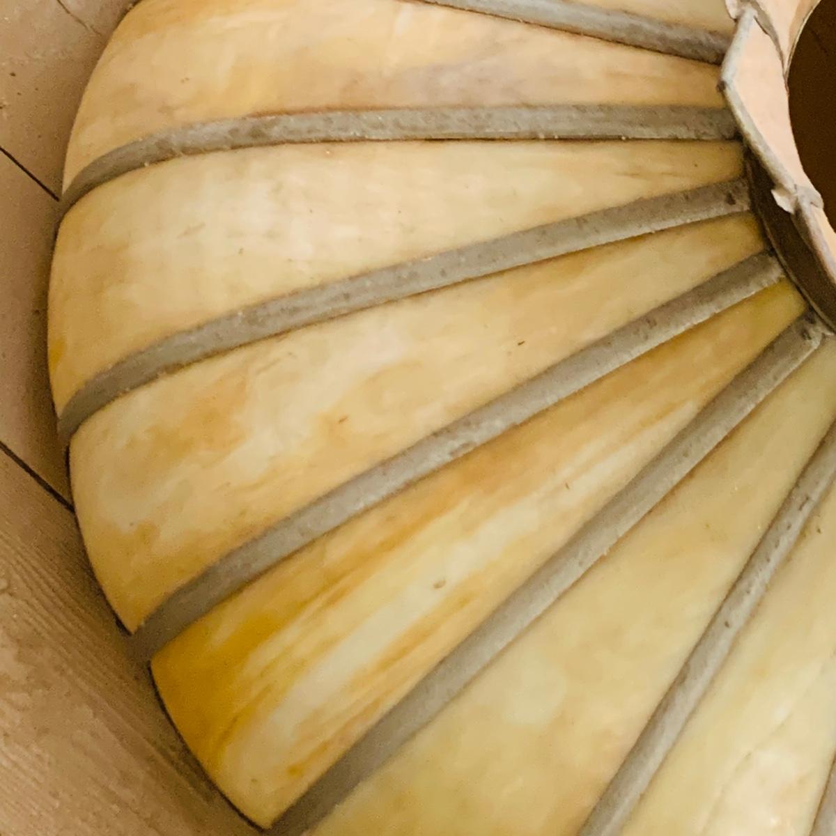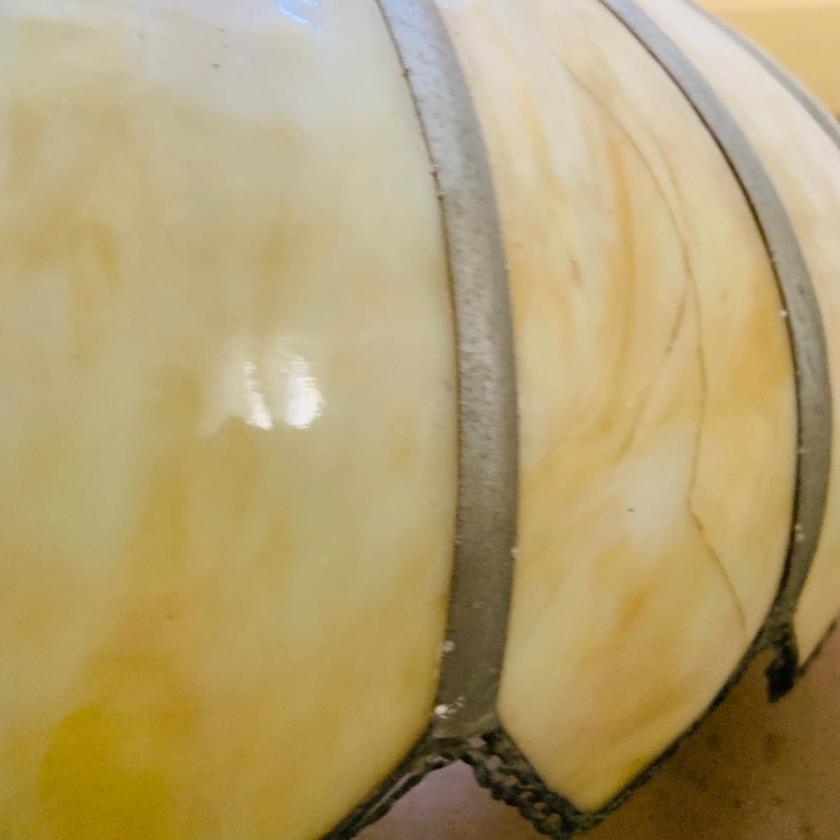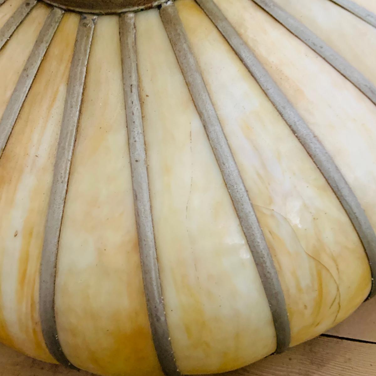 The glass has a cracks and the lamp needs wiring. The shade is 23" wide.