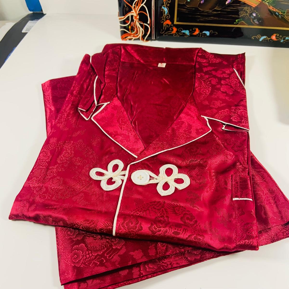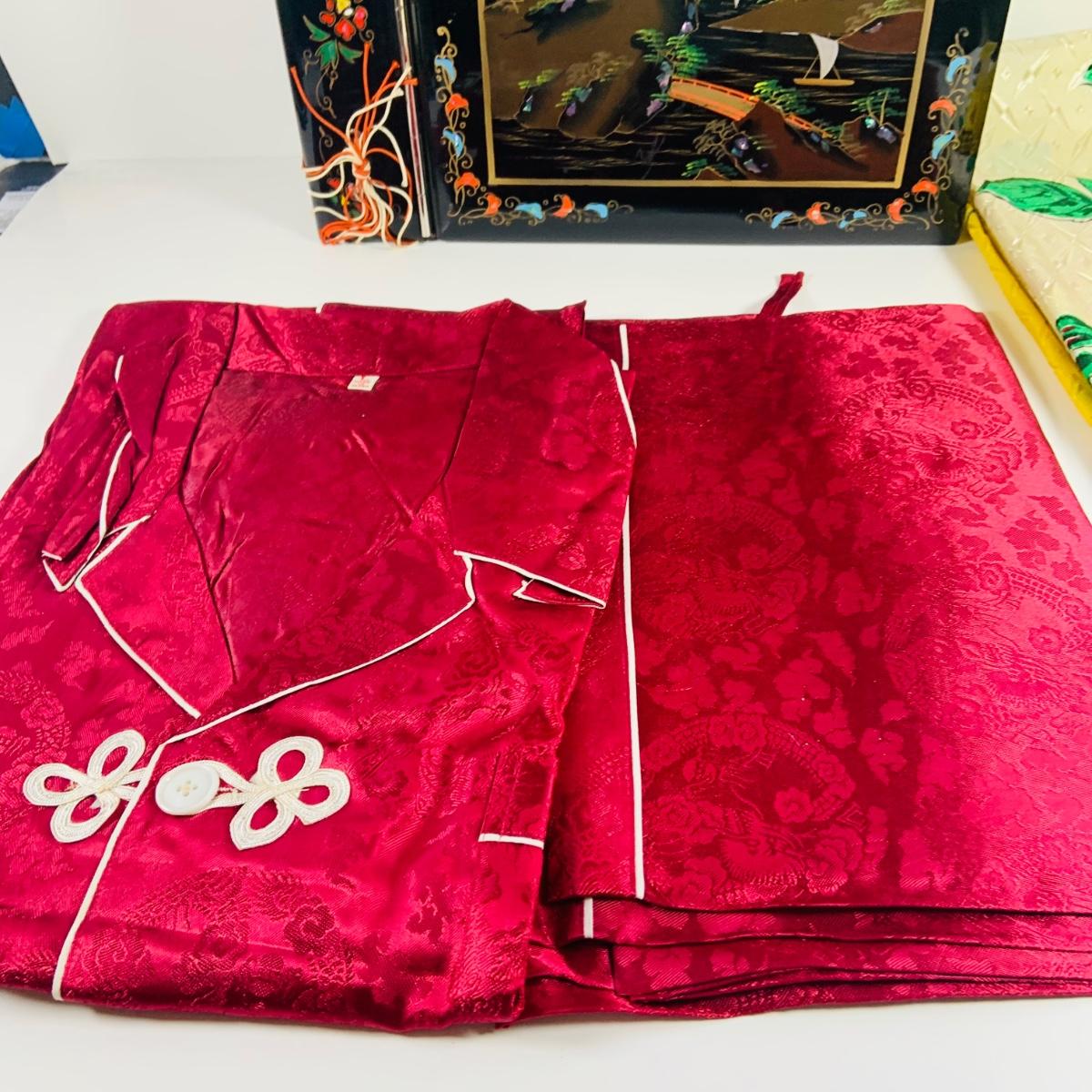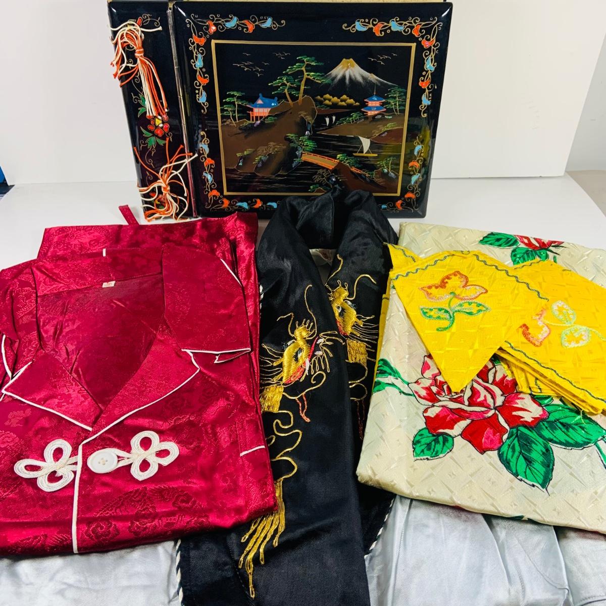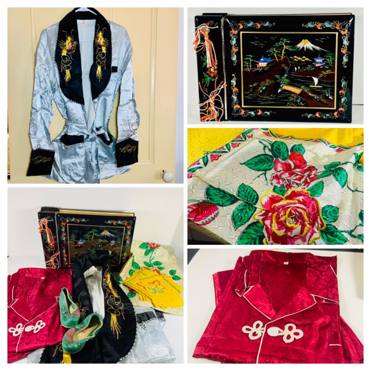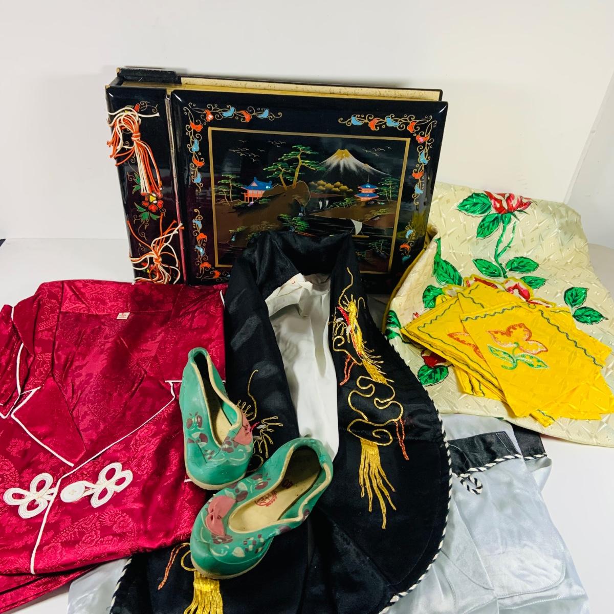 LOT 511: Beautiful Vintage Japanese Silk Robe, Pajamas, Table Linens and a Lacquer Photo Album and Child/Very Small Leather Slippers
