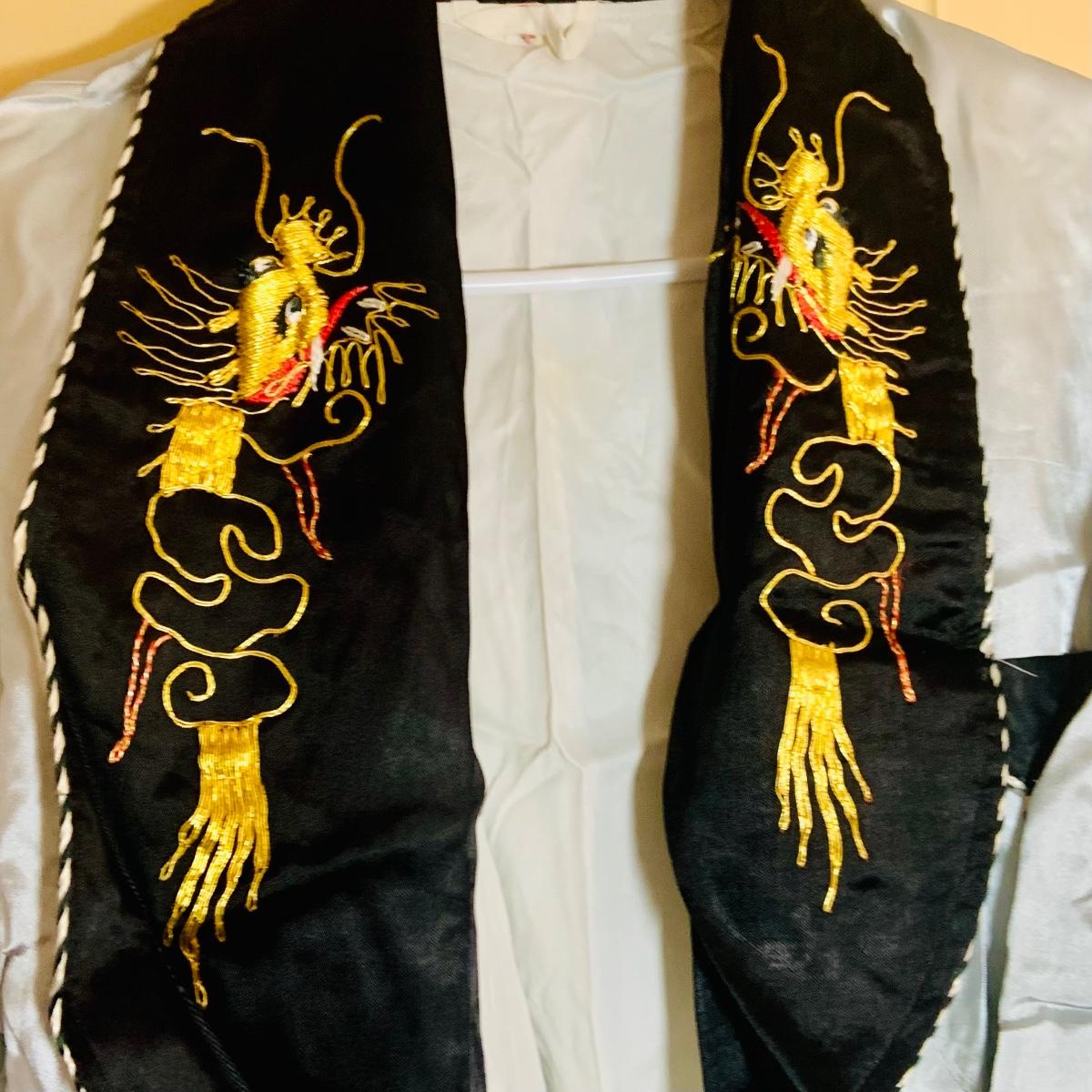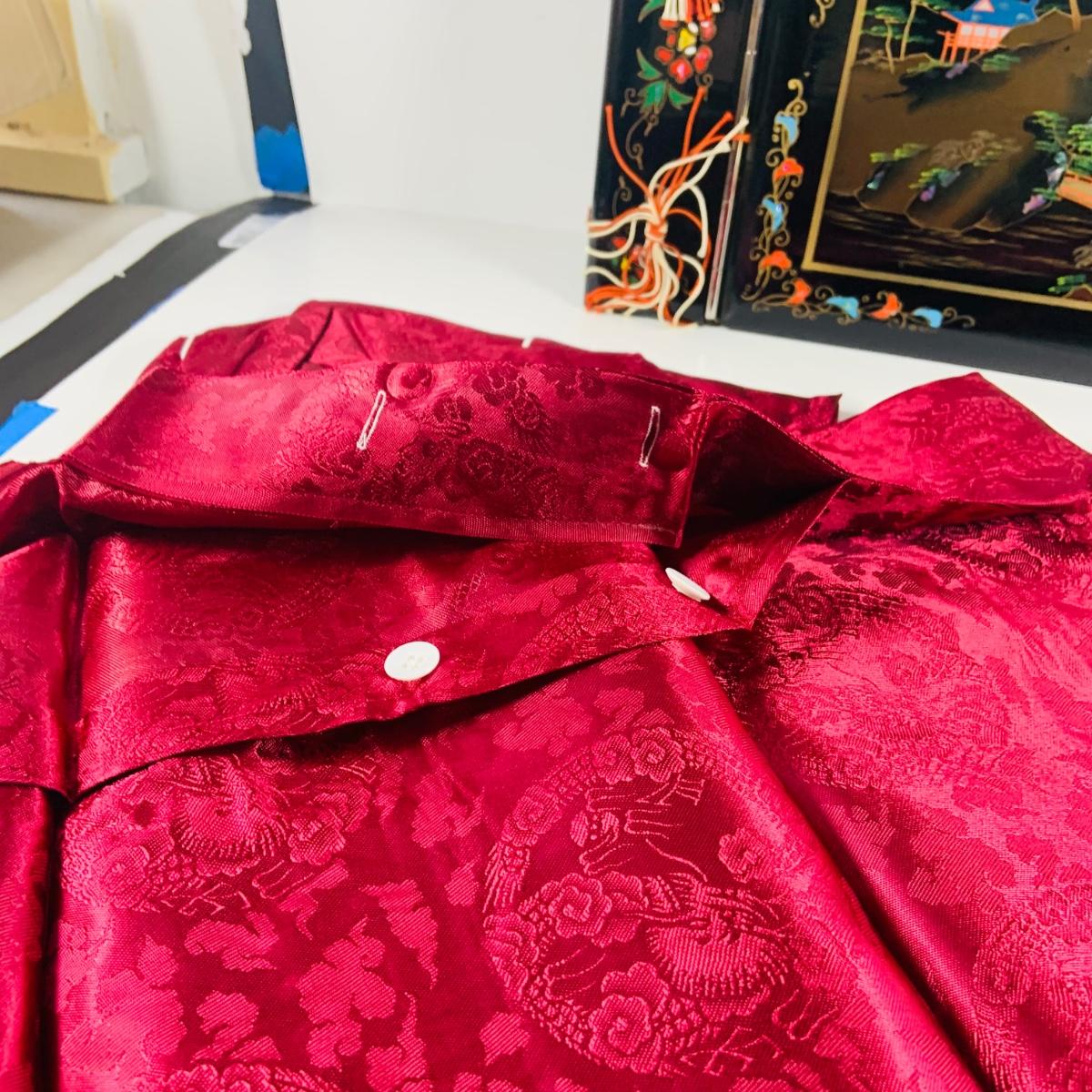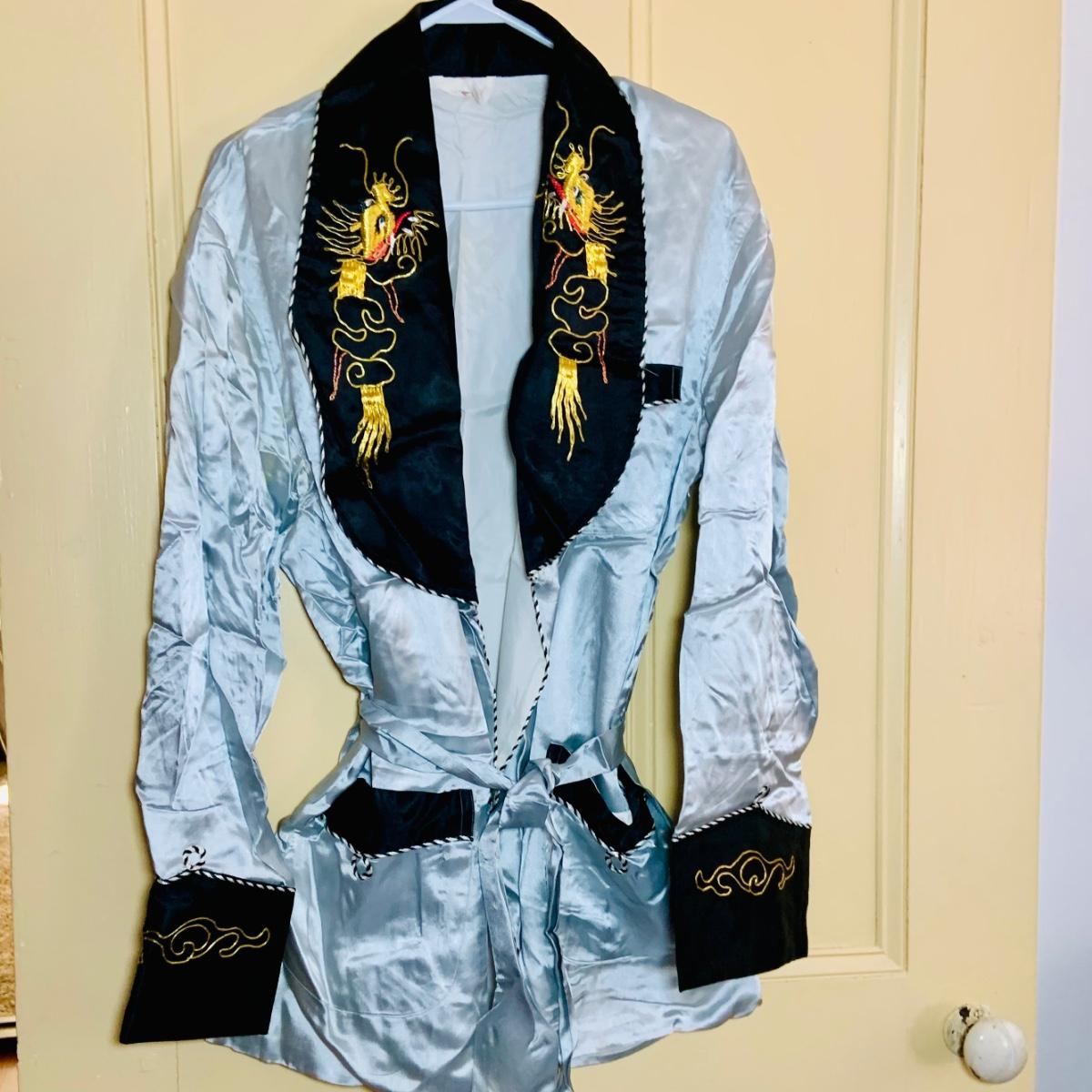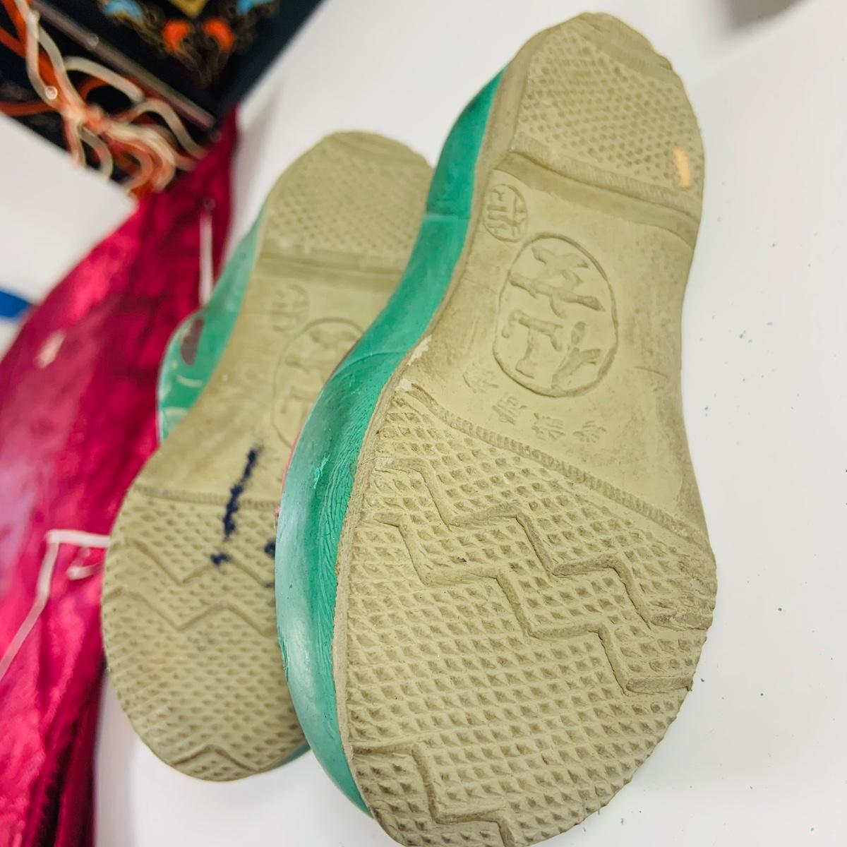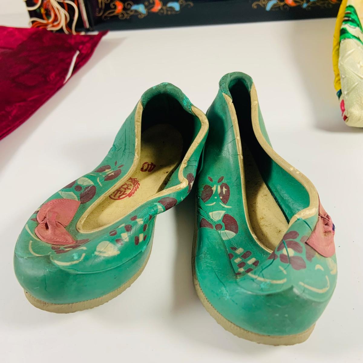 LOT 511: Beautiful Vintage Japanese Silk Robe, Pajamas, Table Linens and a Lacquer Photo Album and Child/Very Small Leather Slippers
