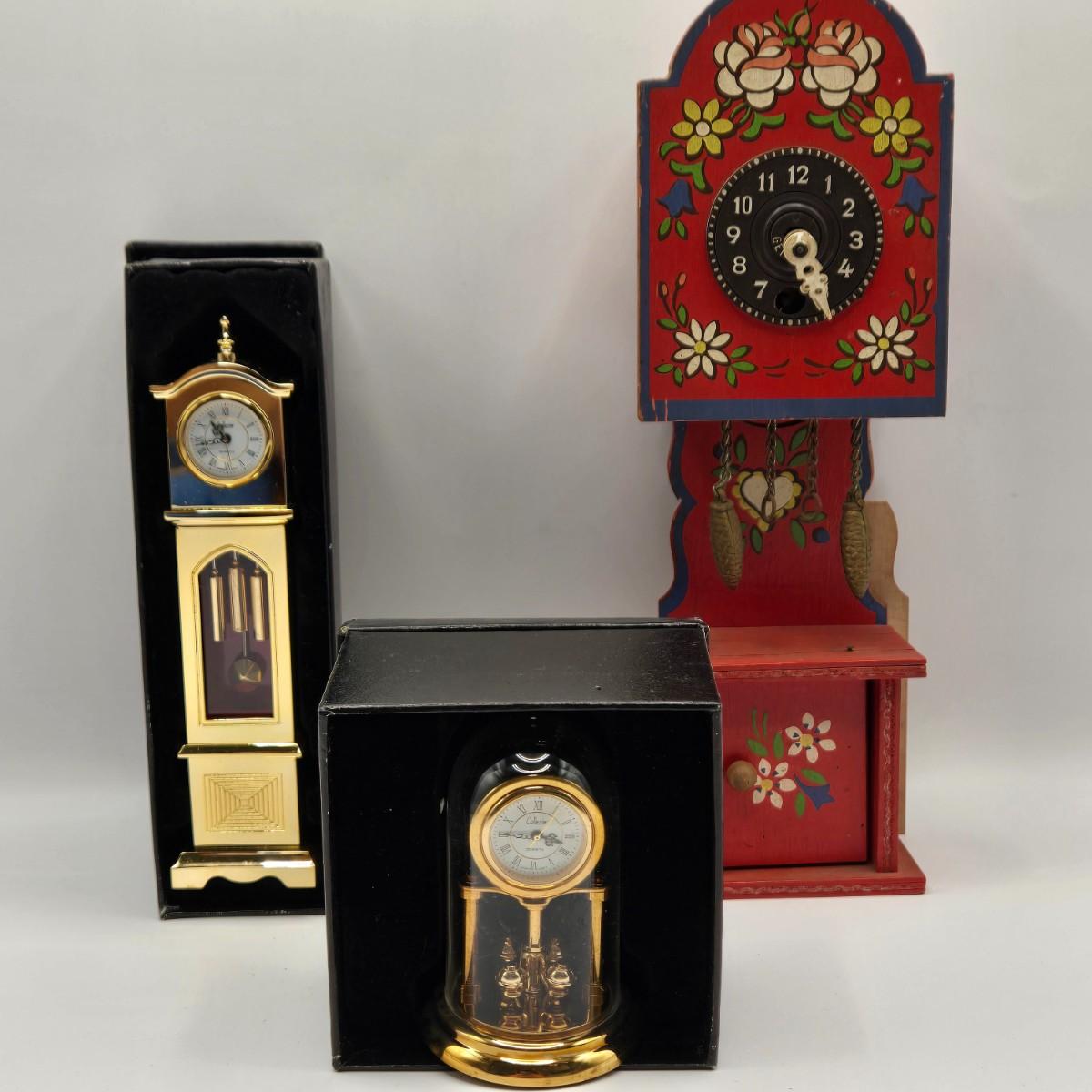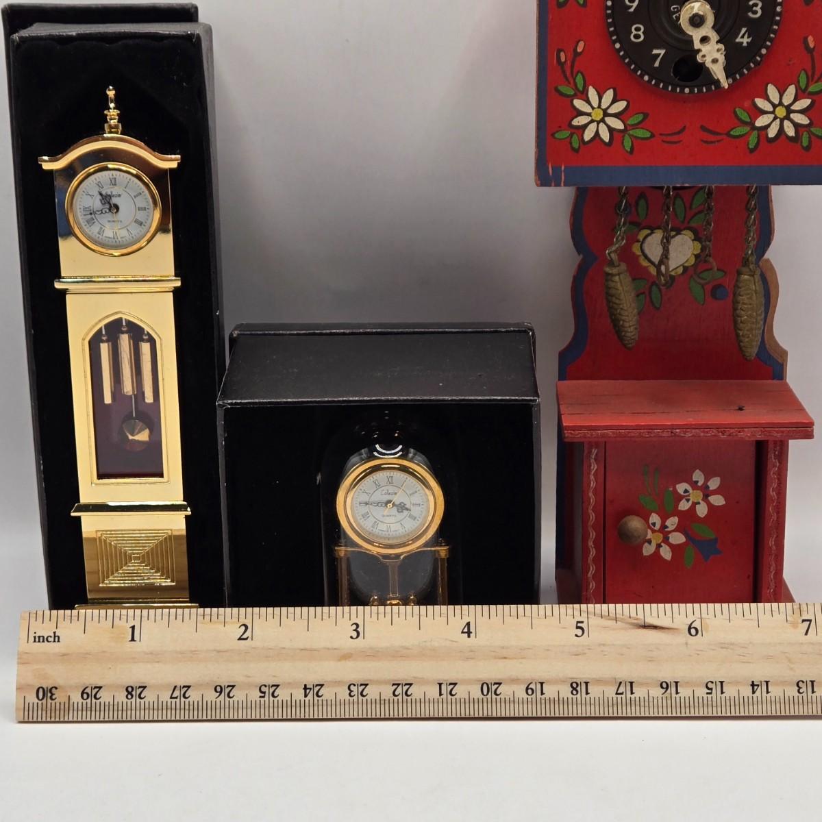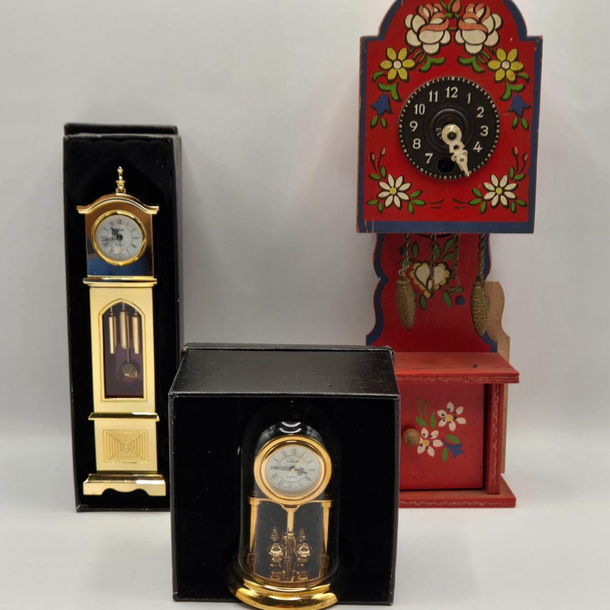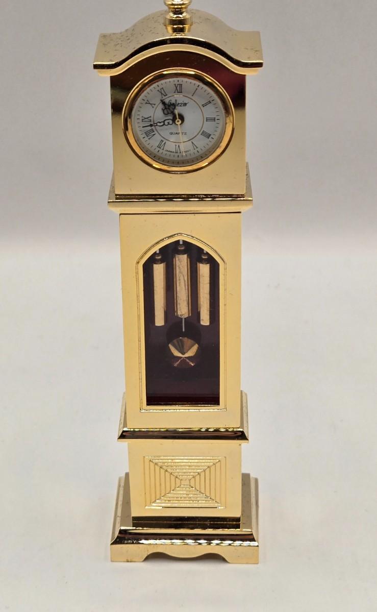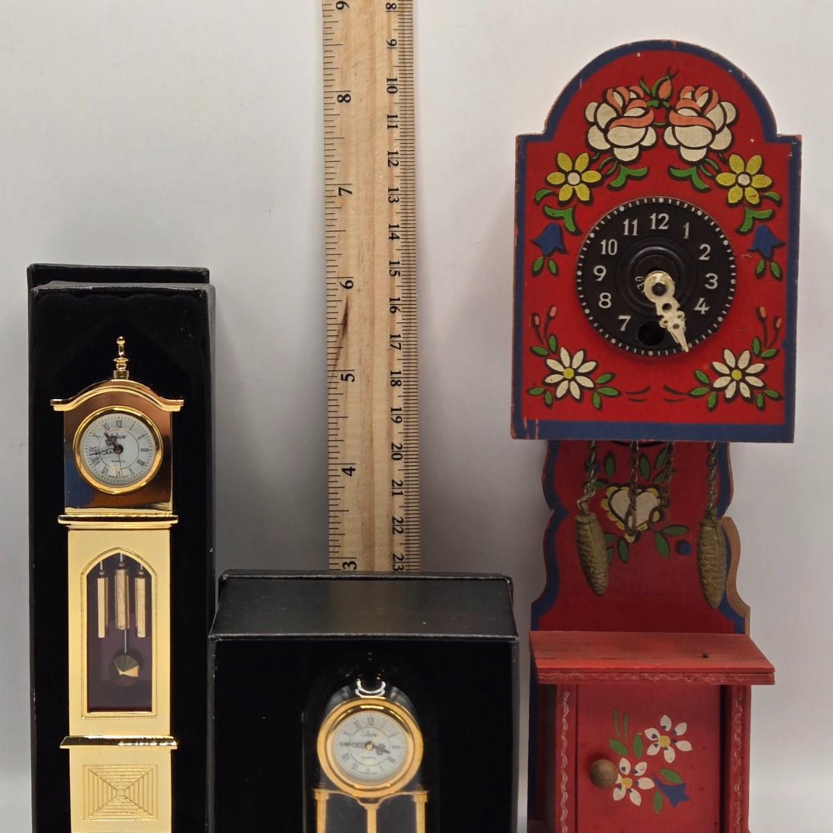 LOT 546: Vintage German Wooden Miniature Grandfather Clock, Miniature Gold Tone Grandfather Clock, & Miniature Gold Tone Mantle Clock