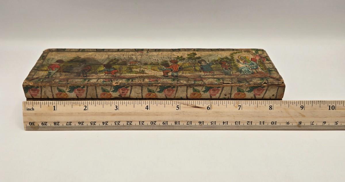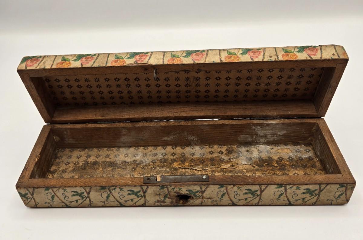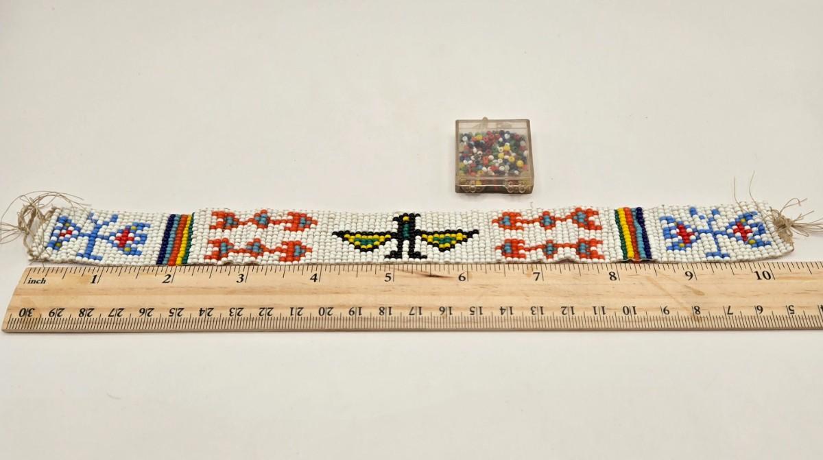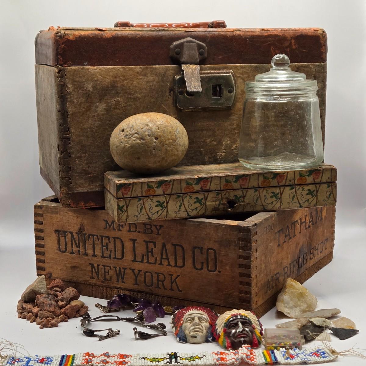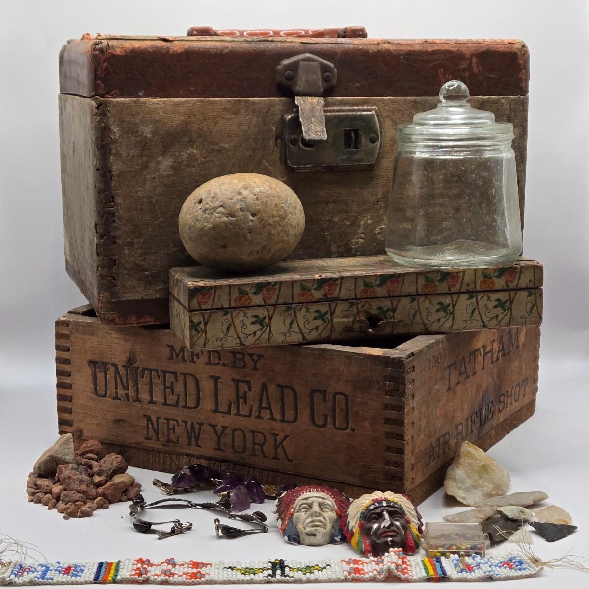 LOT 551: United Lead Co. Wooden Box, Small Train Case, Glass Jar, Victorian Pencil Box, Beaded American Indian Band, With Box of Extra Beads, Carved arrow Shaped Rocks, Neckerchief Slides, & More