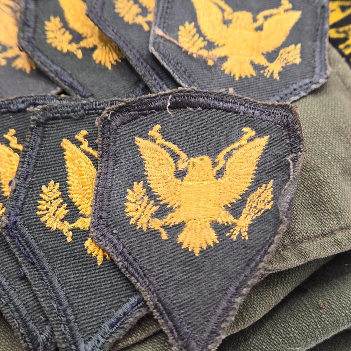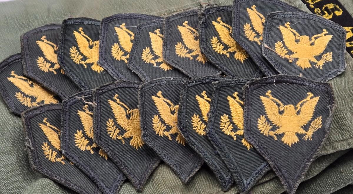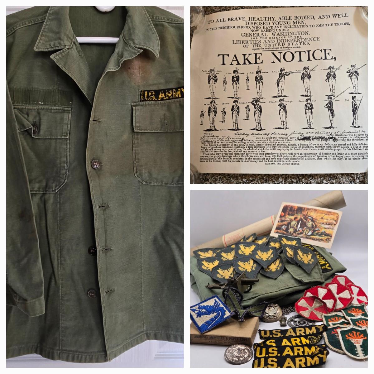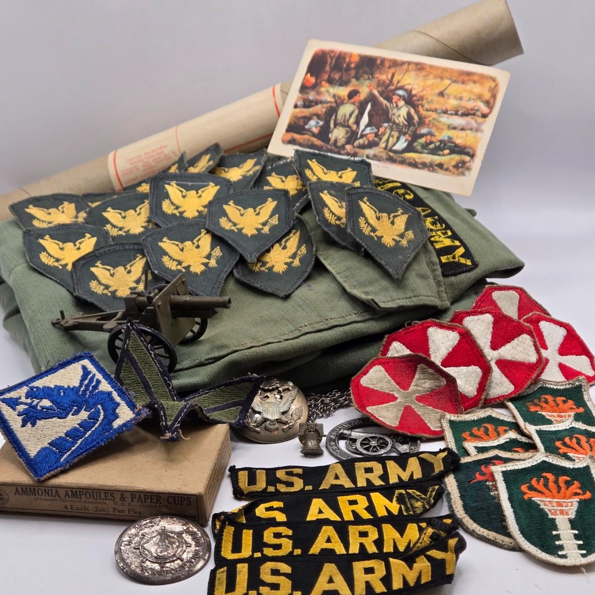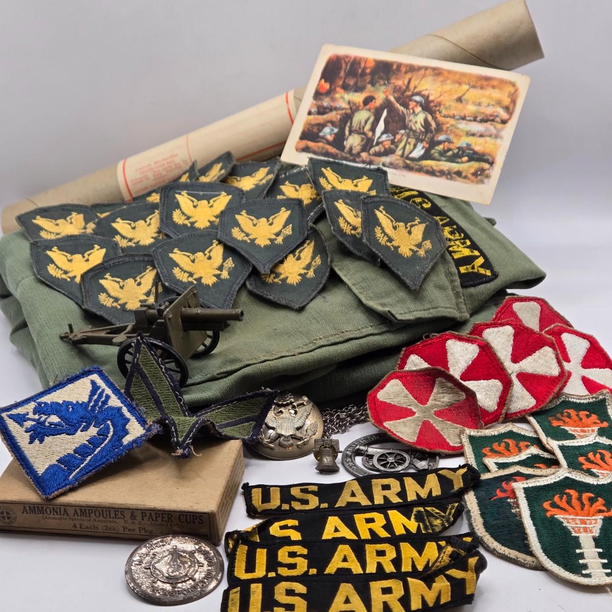 LOT 556: Army Jacket, Multiple Patches, Notice of Recruitment, Metal Pins, Cannon, & Charm, Postcard, & First Aid smelling Salts
