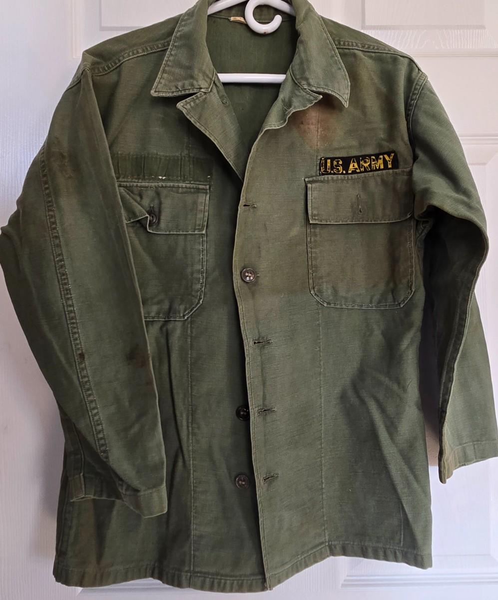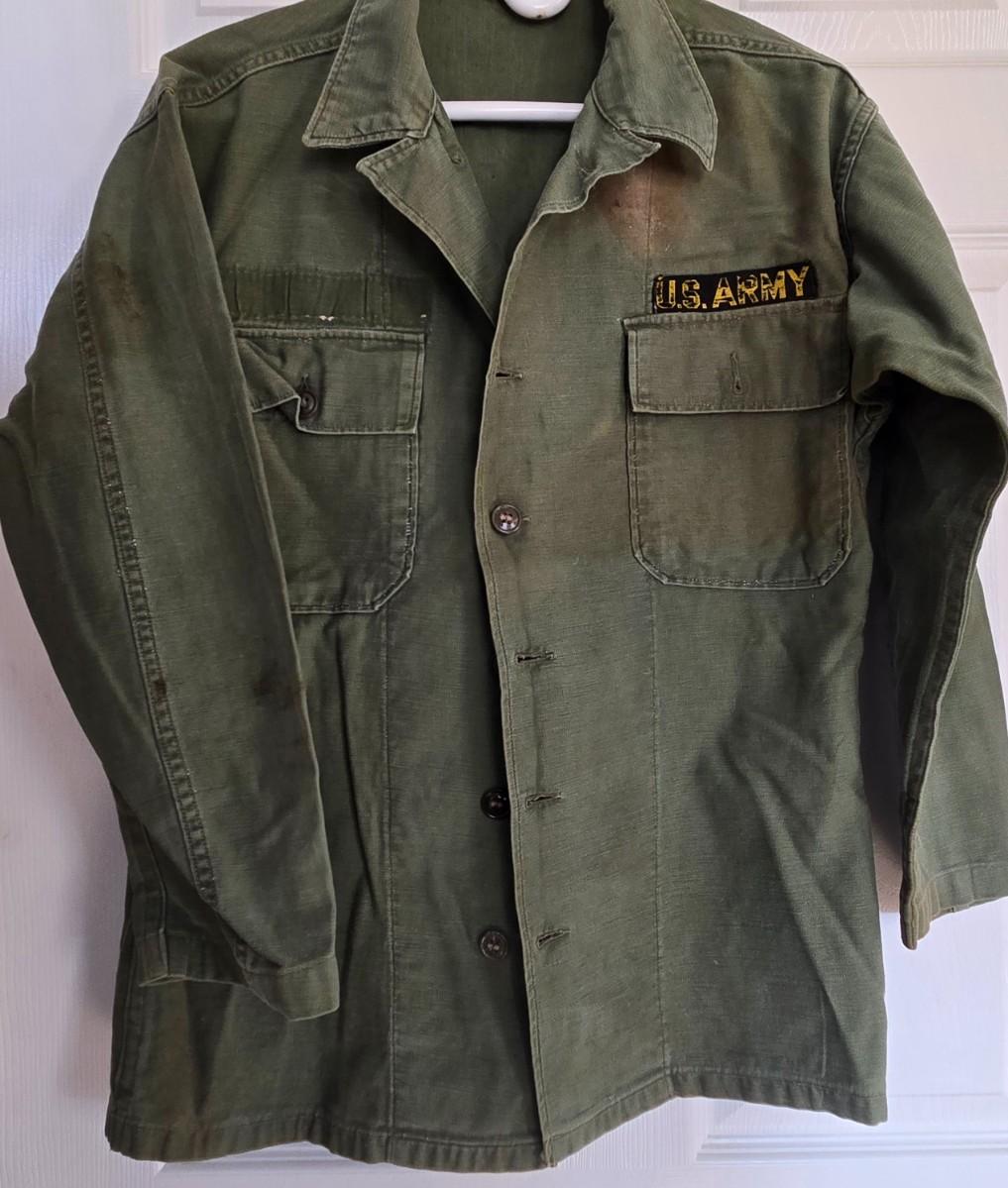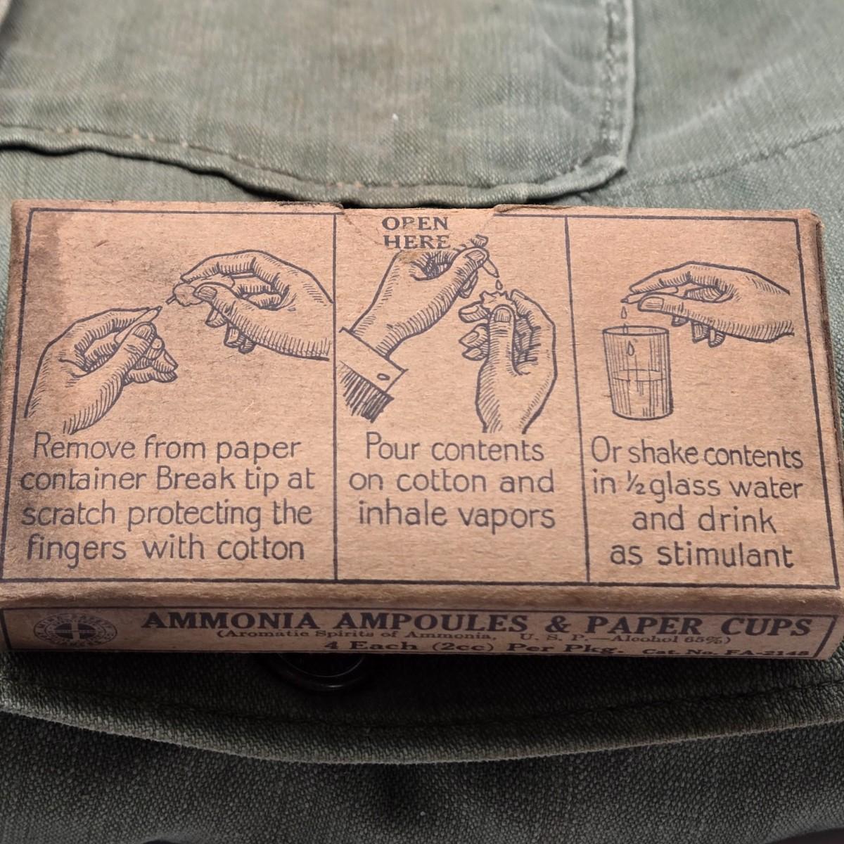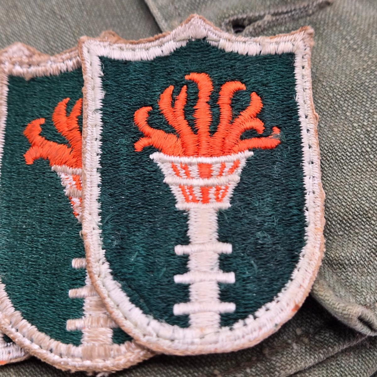 LOT 556: Army Jacket, Multiple Patches, Notice of Recruitment, Metal Pins, Cannon, & Charm, Postcard, & First Aid smelling Salts