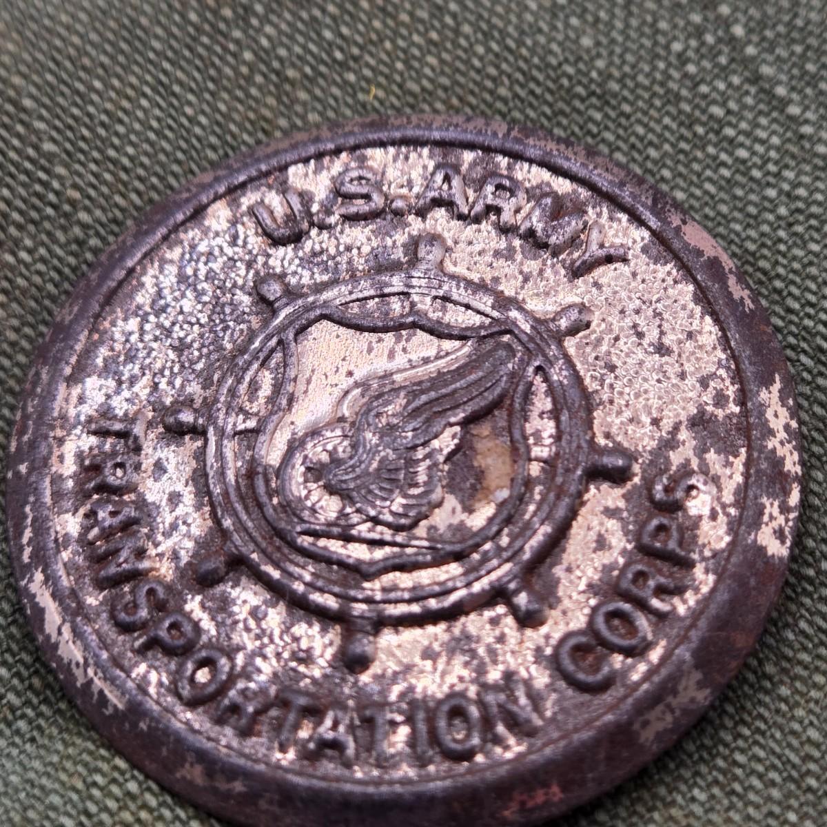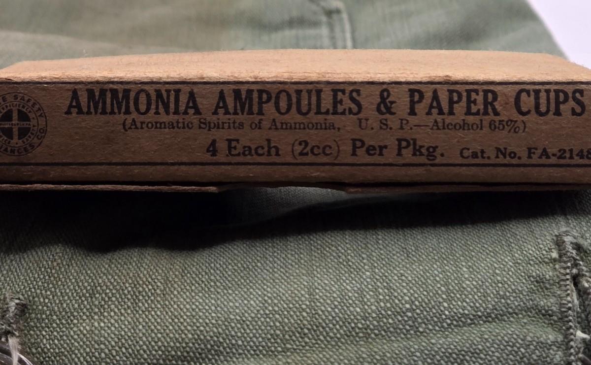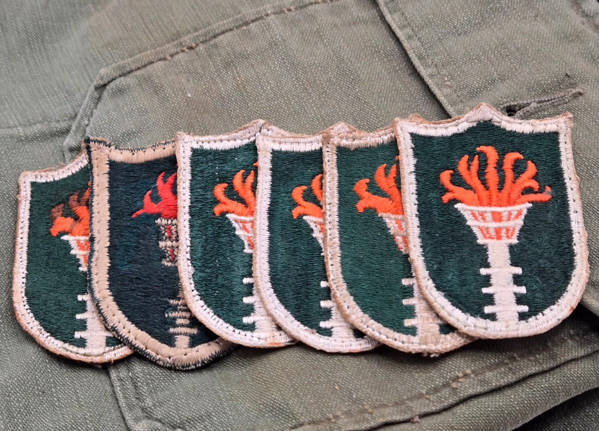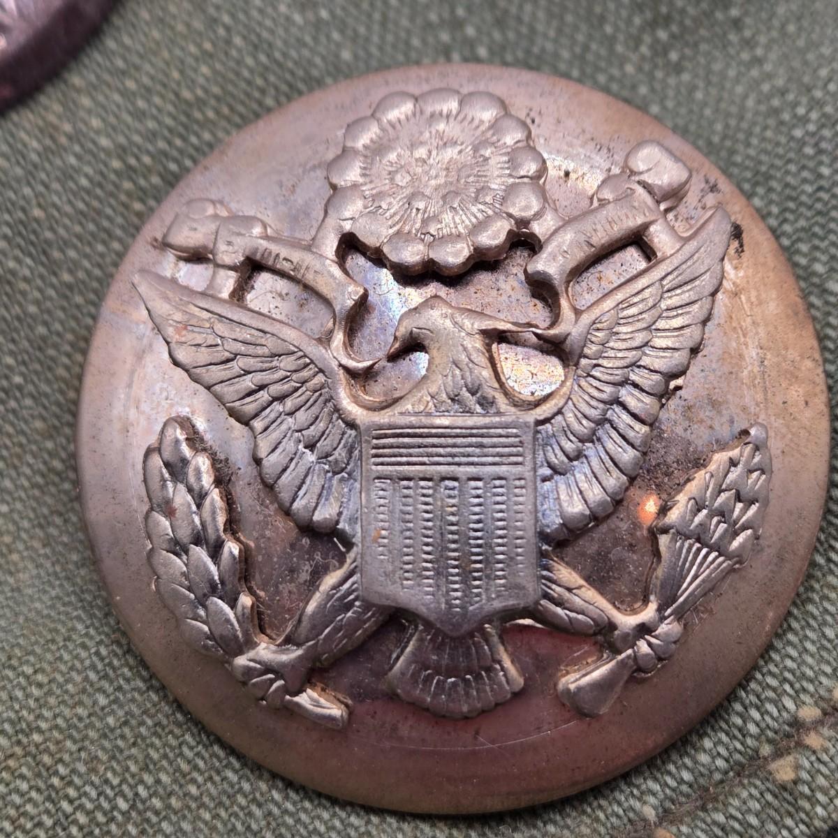 LOT 556: Army Jacket, Multiple Patches, Notice of Recruitment, Metal Pins, Cannon, & Charm, Postcard, & First Aid smelling Salts