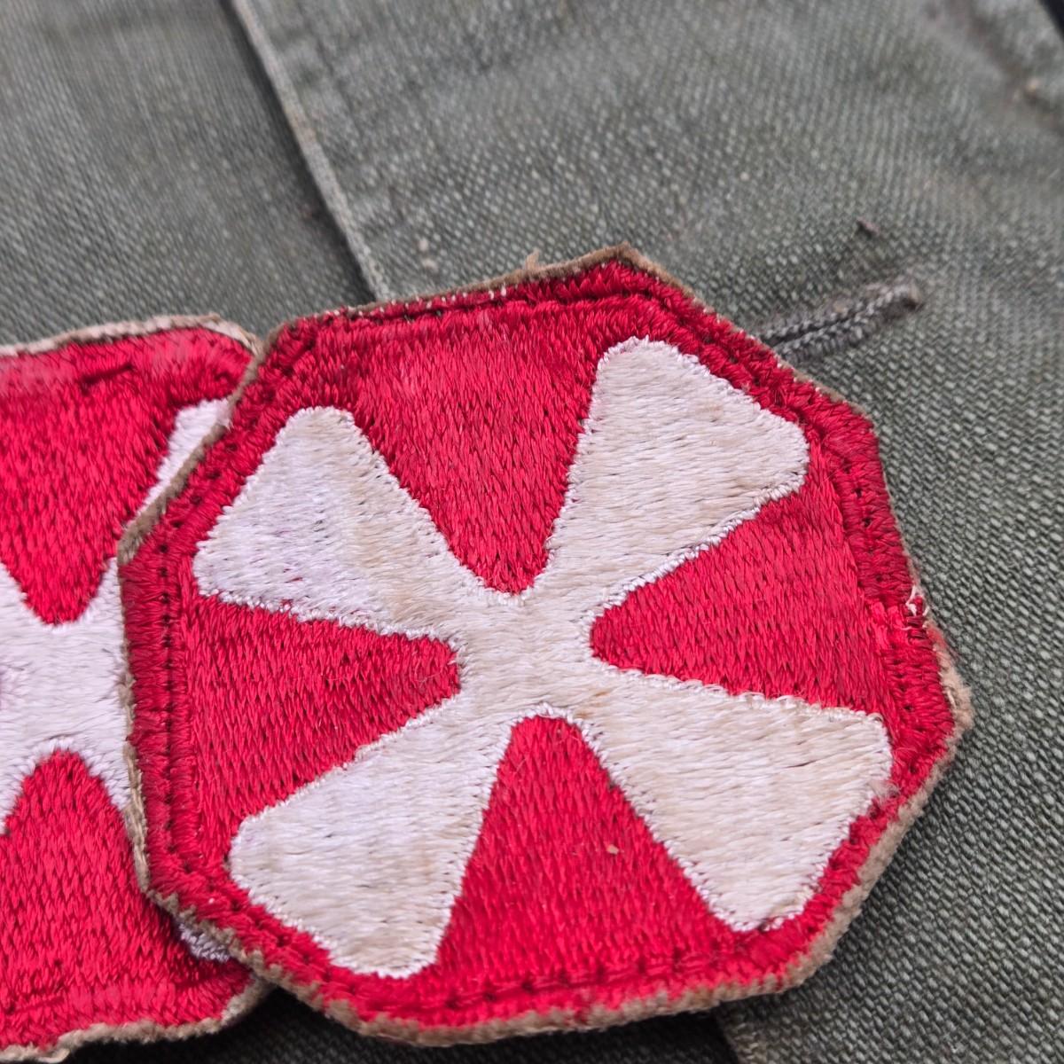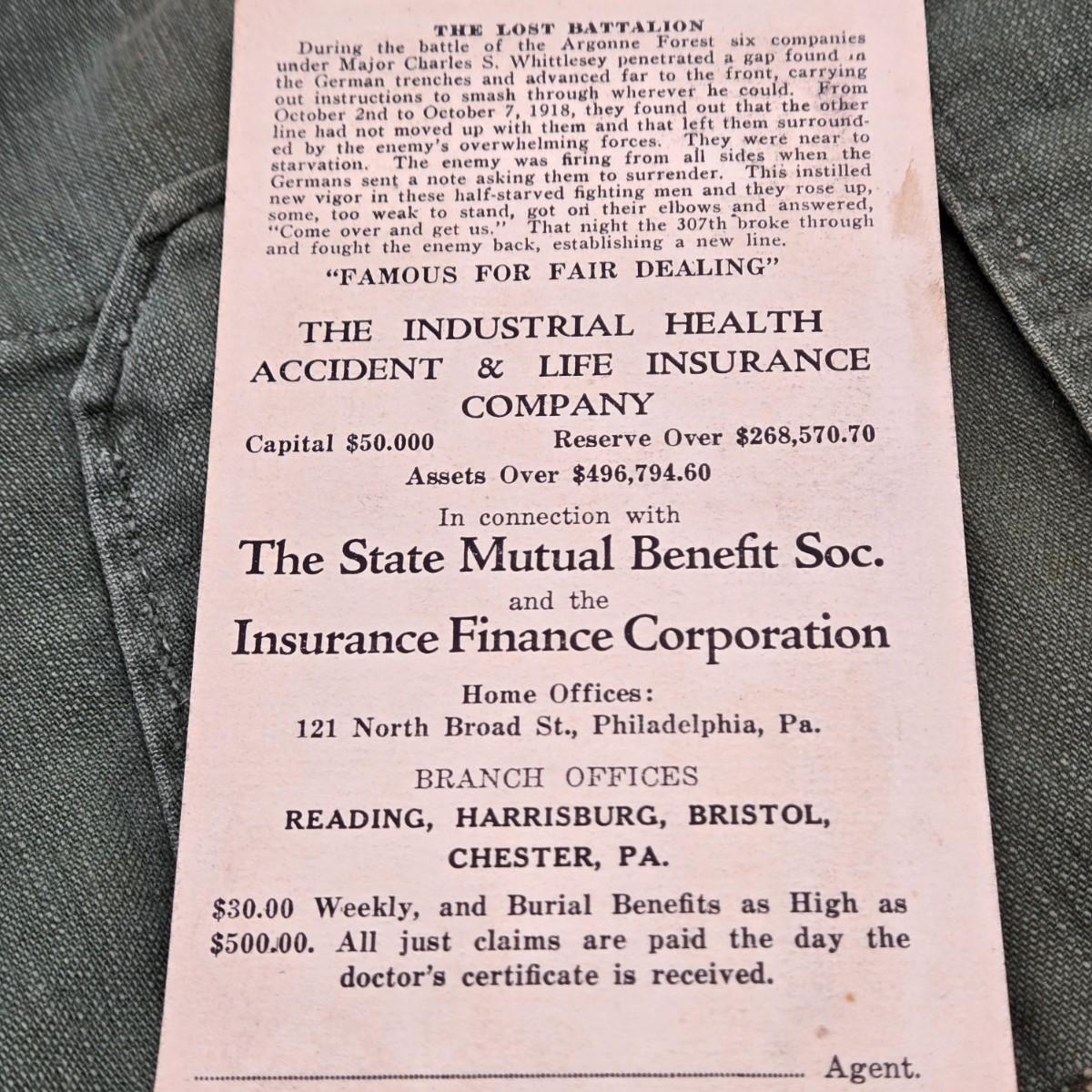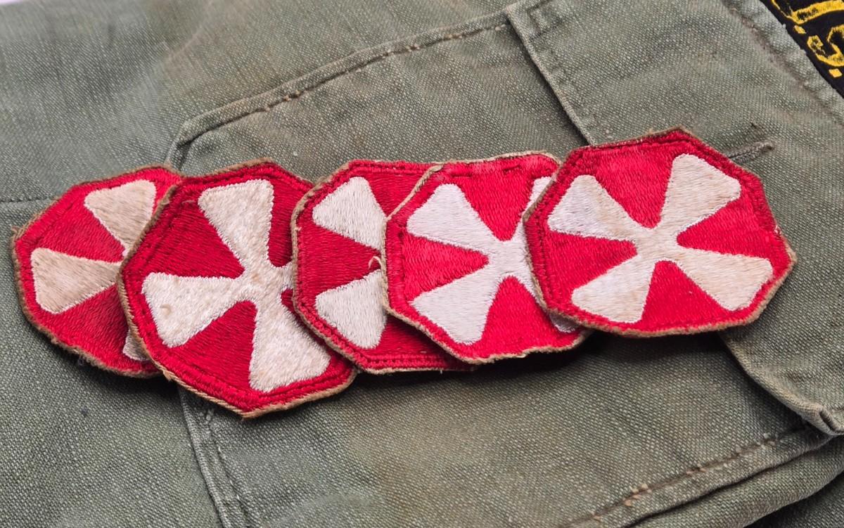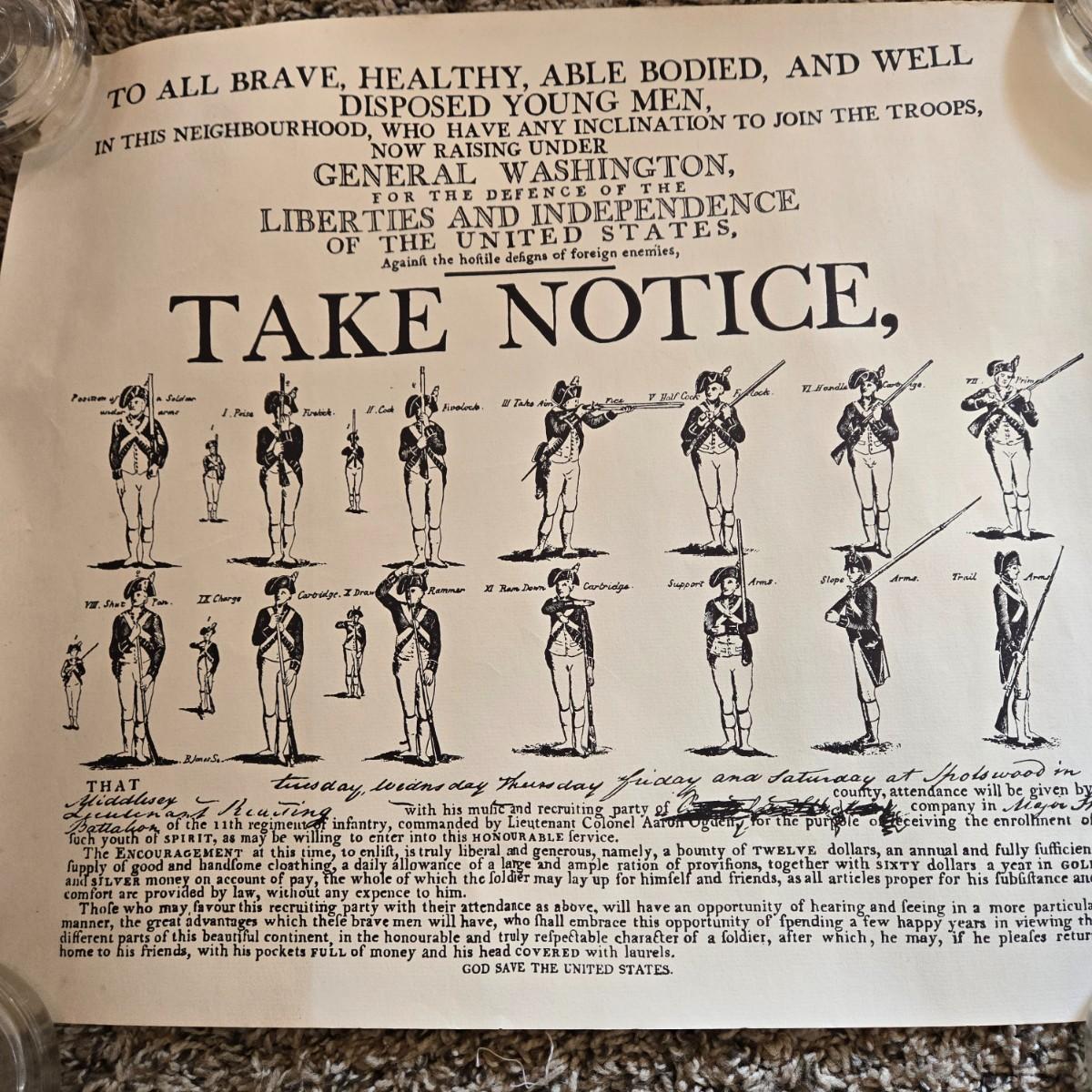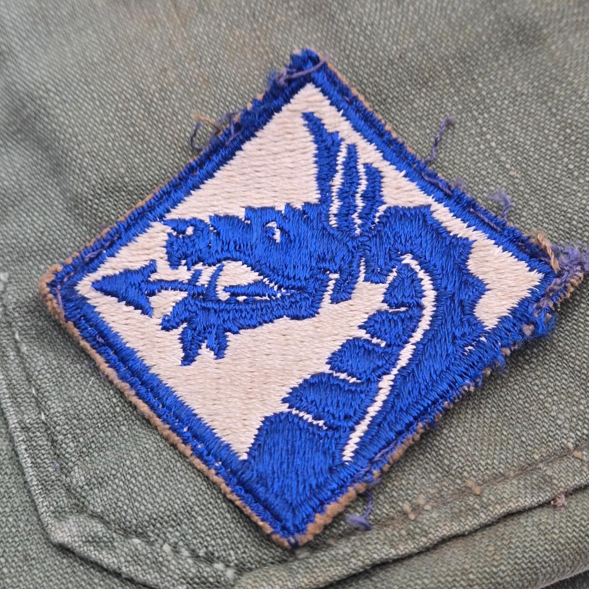 LOT 556: Army Jacket, Multiple Patches, Notice of Recruitment, Metal Pins, Cannon, & Charm, Postcard, & First Aid smelling Salts