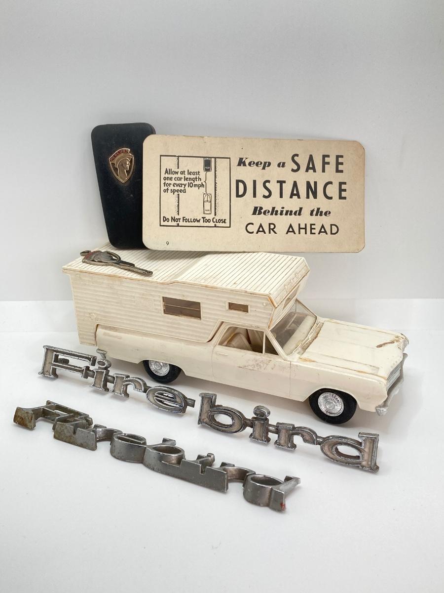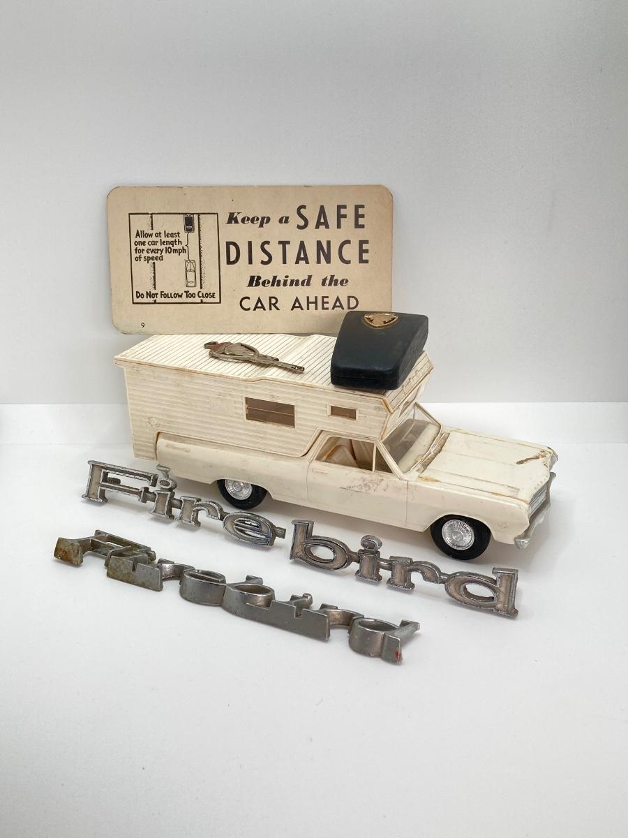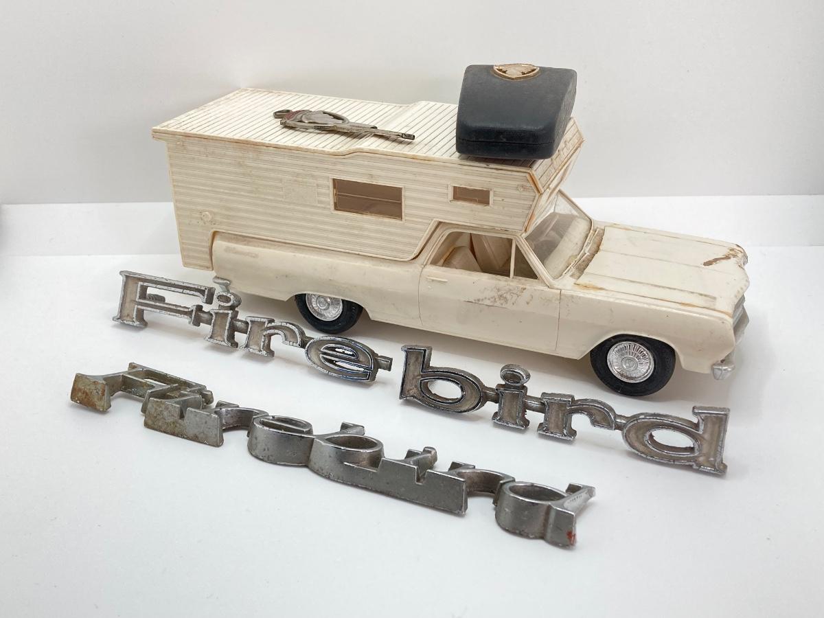 LOT 560: Vintage El Camino Camper Car, Metal Firebird Car Badge / Emblem, Mercury Key with Key Holder and More