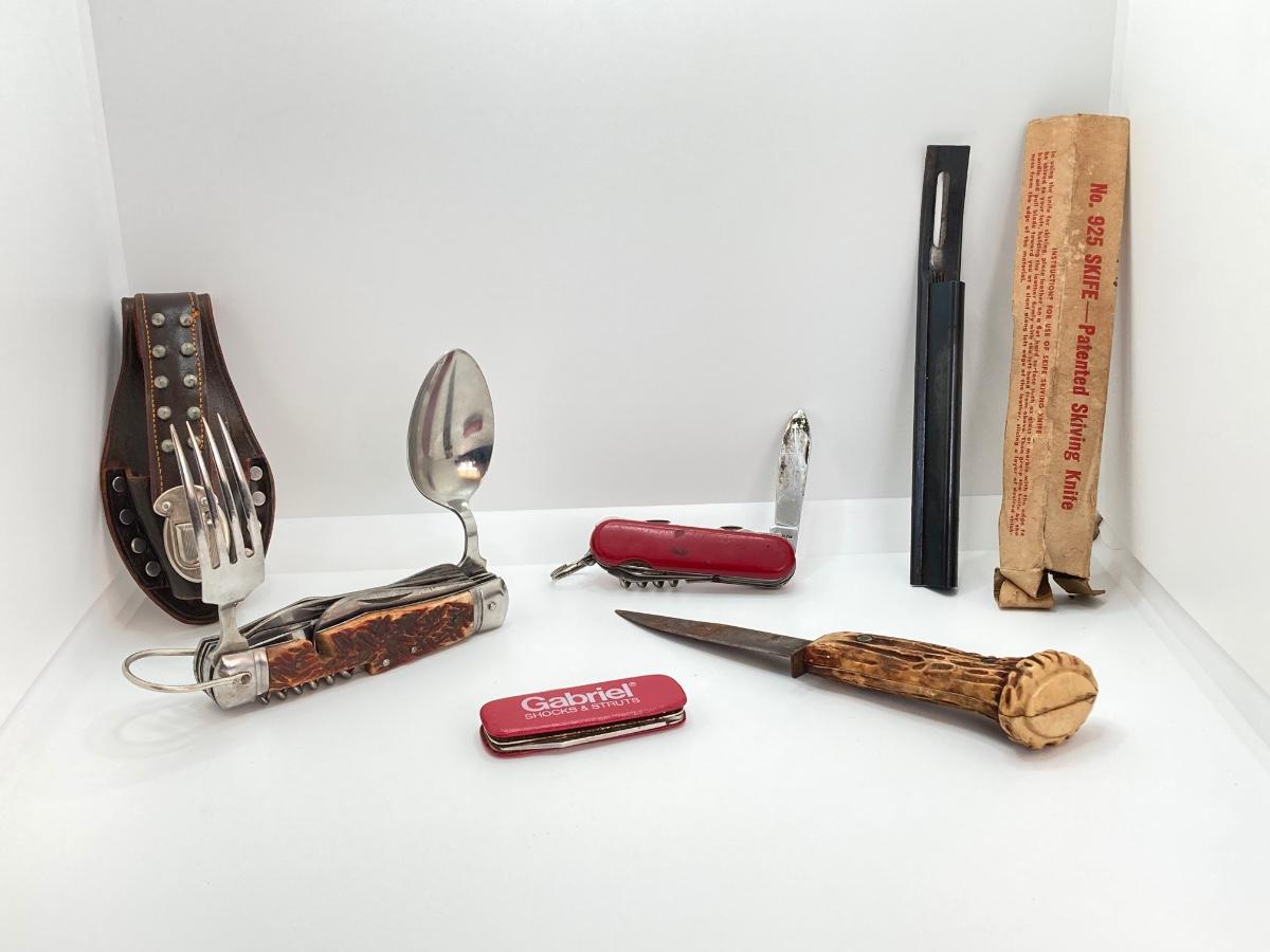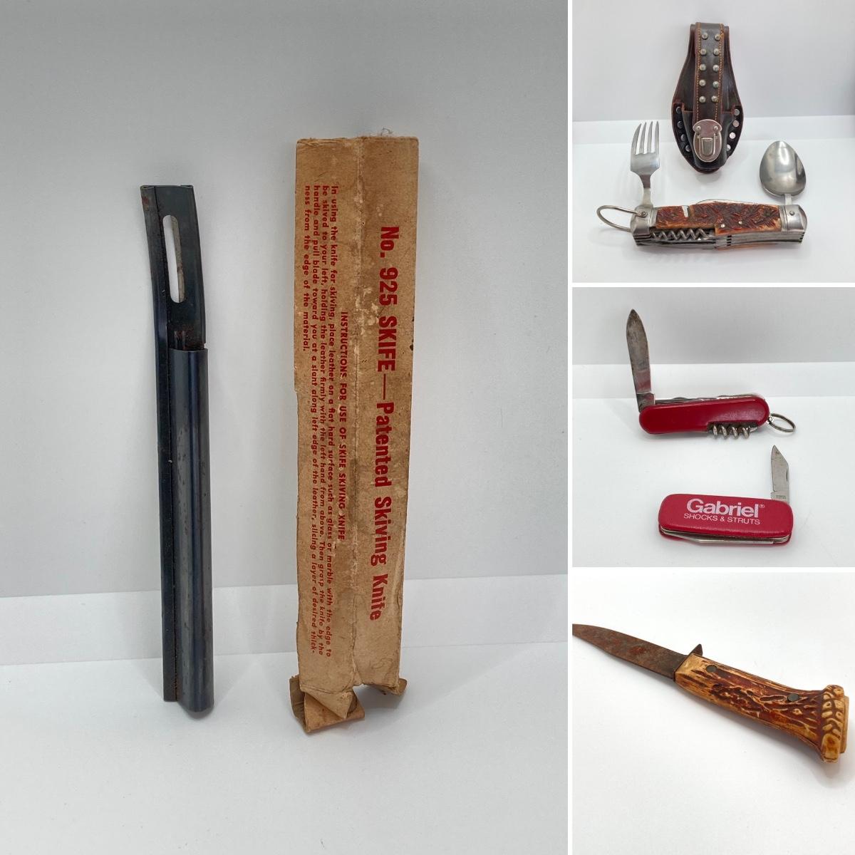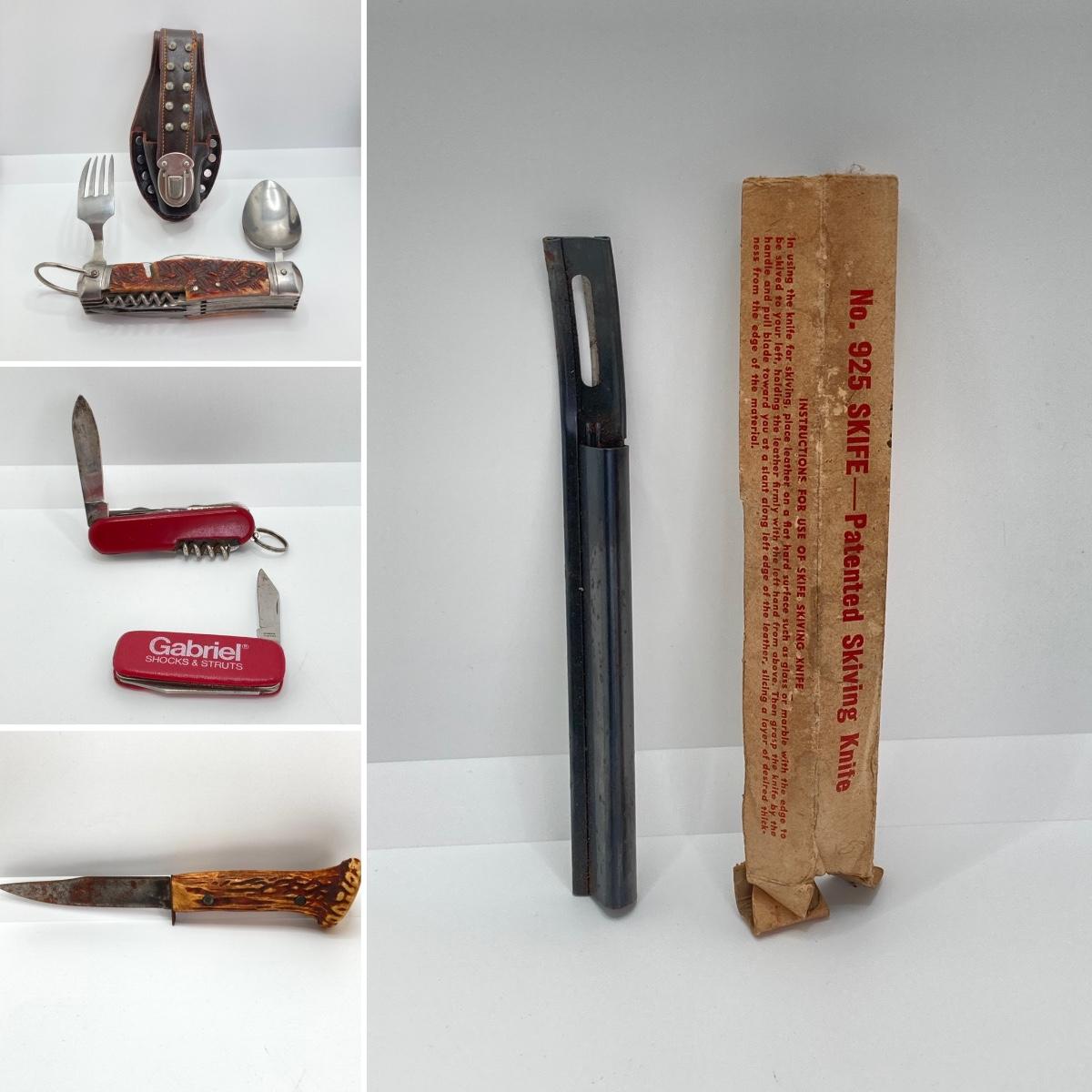 LOT 563: Vintage Knives - Skife with Original Box, Camping Utensil Combo with Sheath, Utility, Faux Antler and More