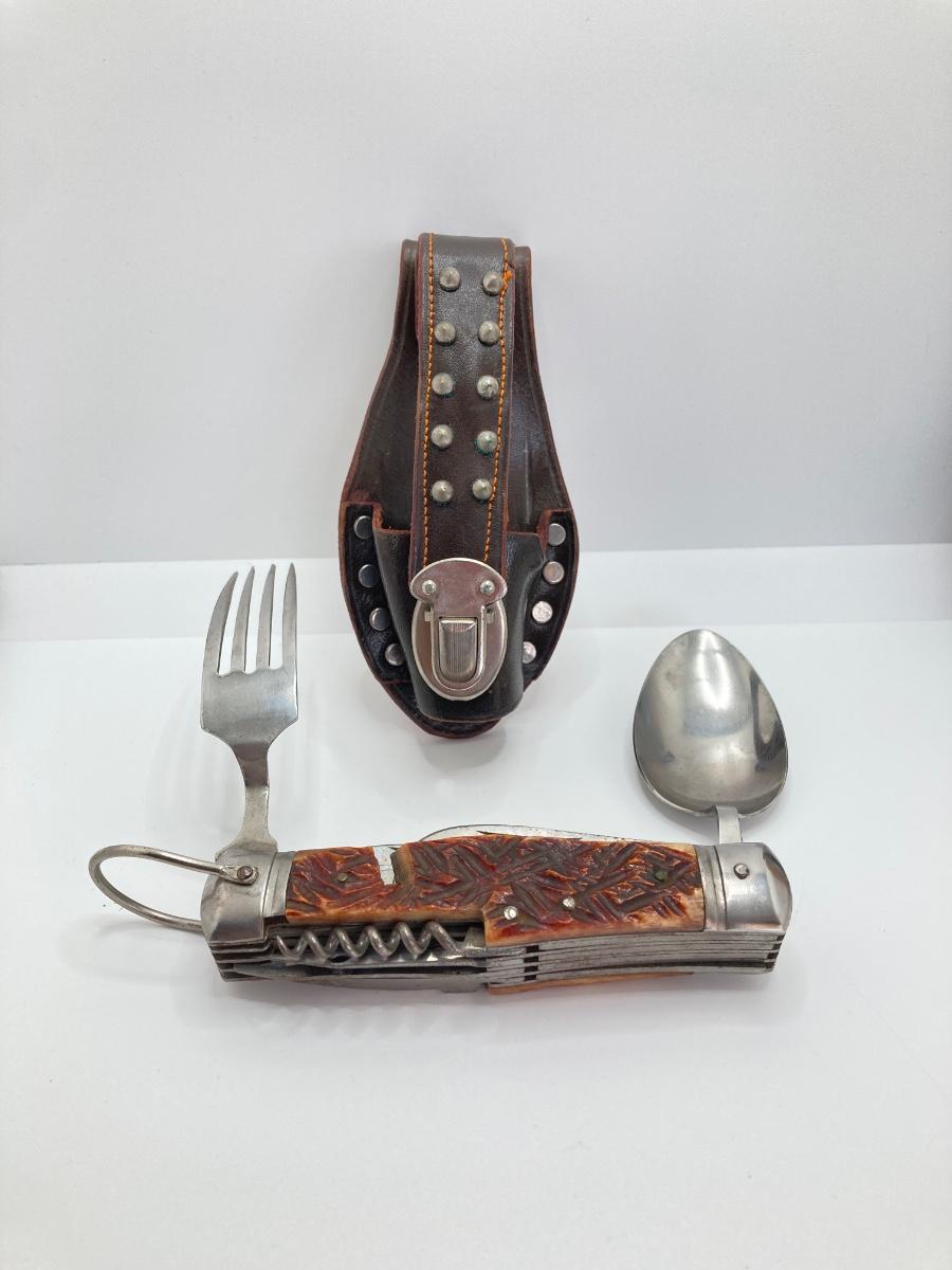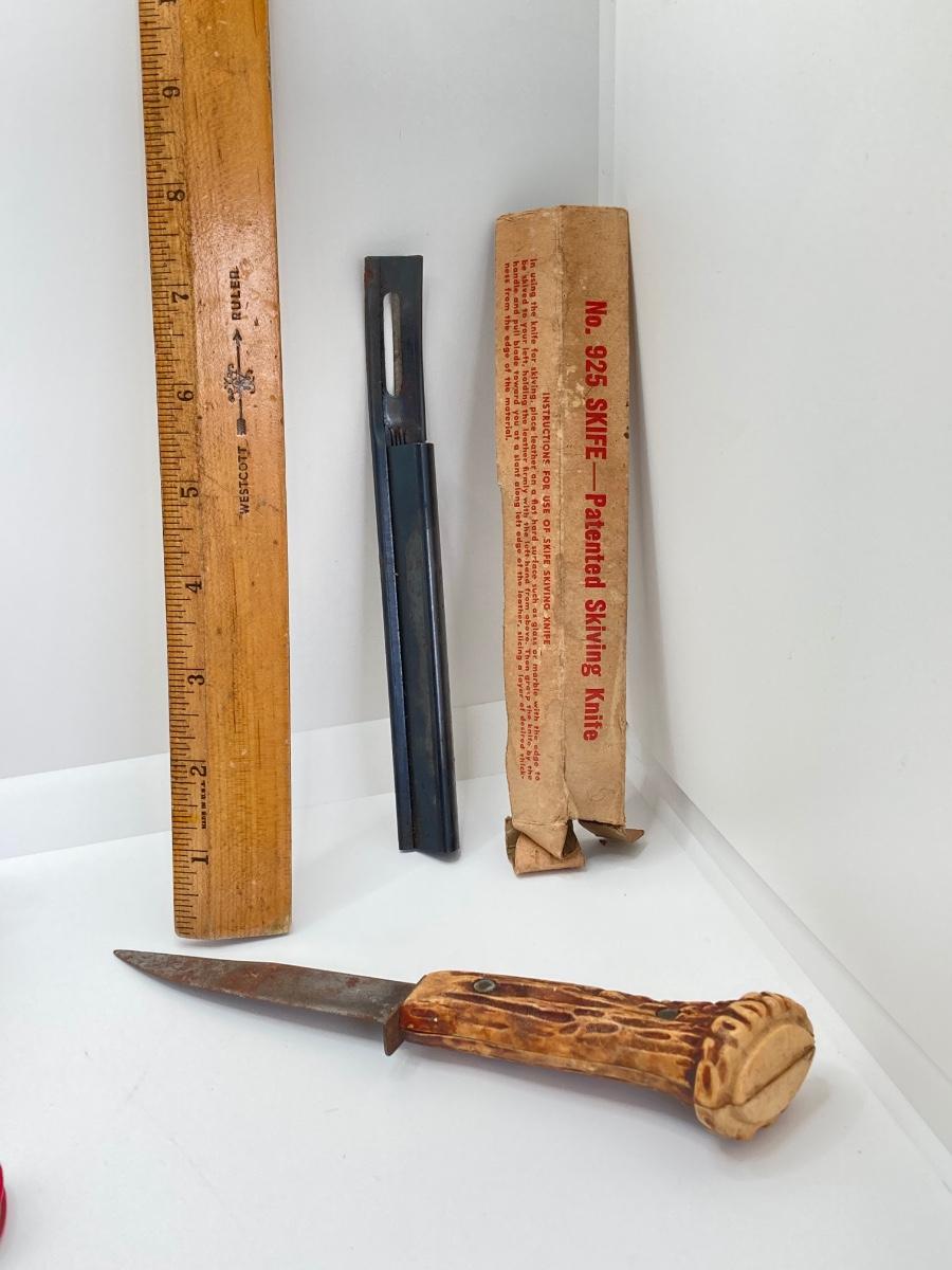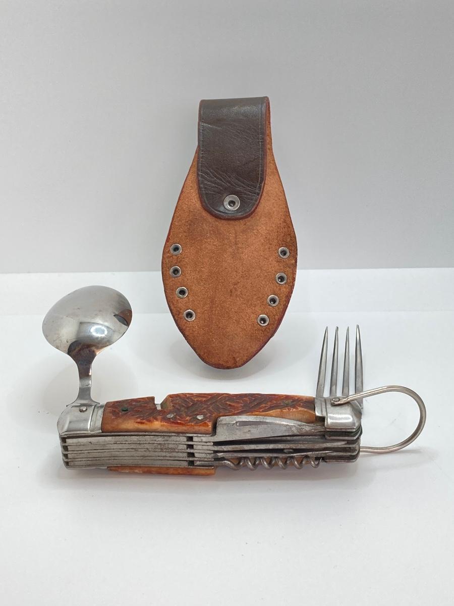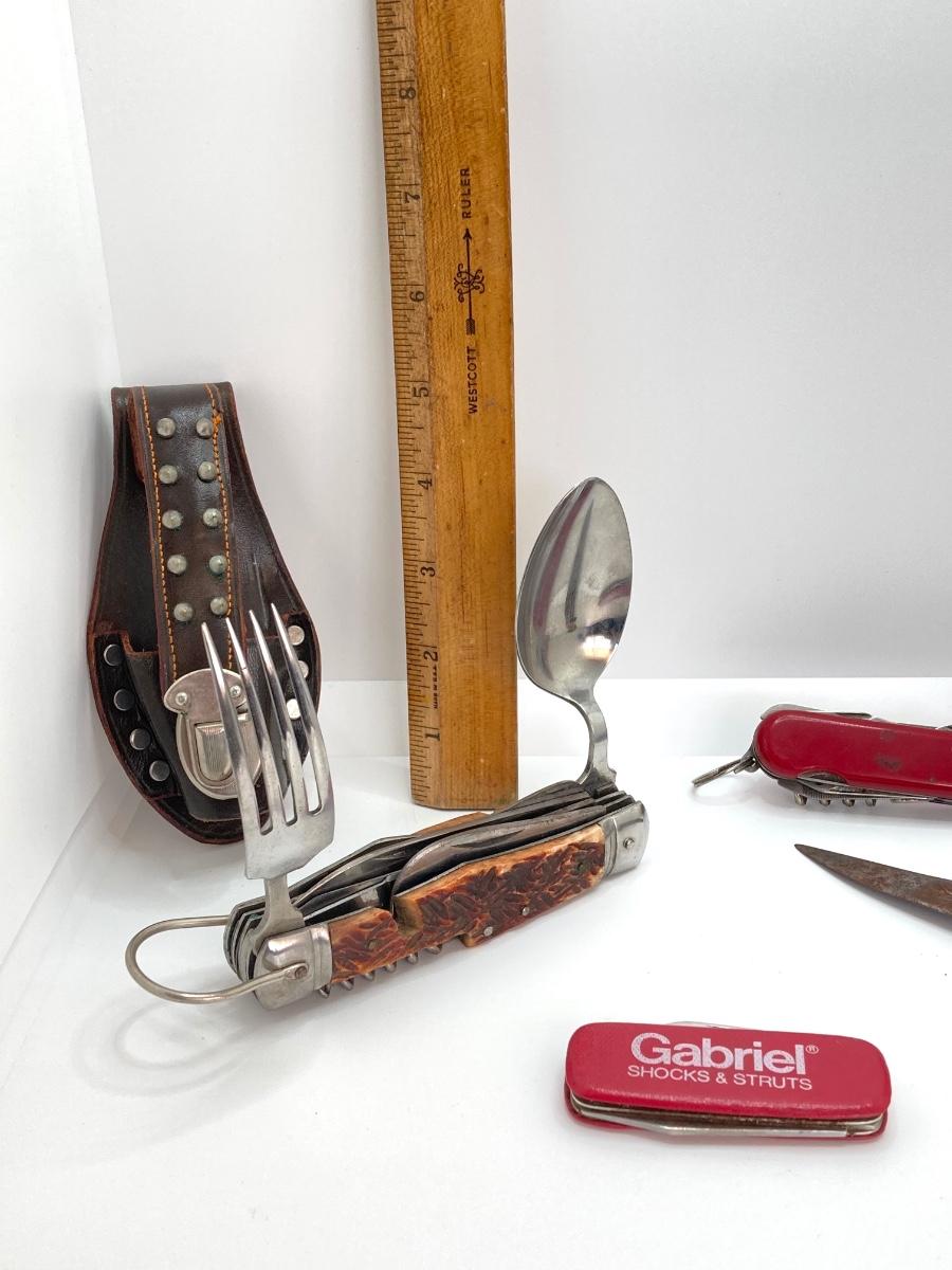 LOT 563: Vintage Knives - Skife with Original Box, Camping Utensil Combo with Sheath, Utility, Faux Antler and More