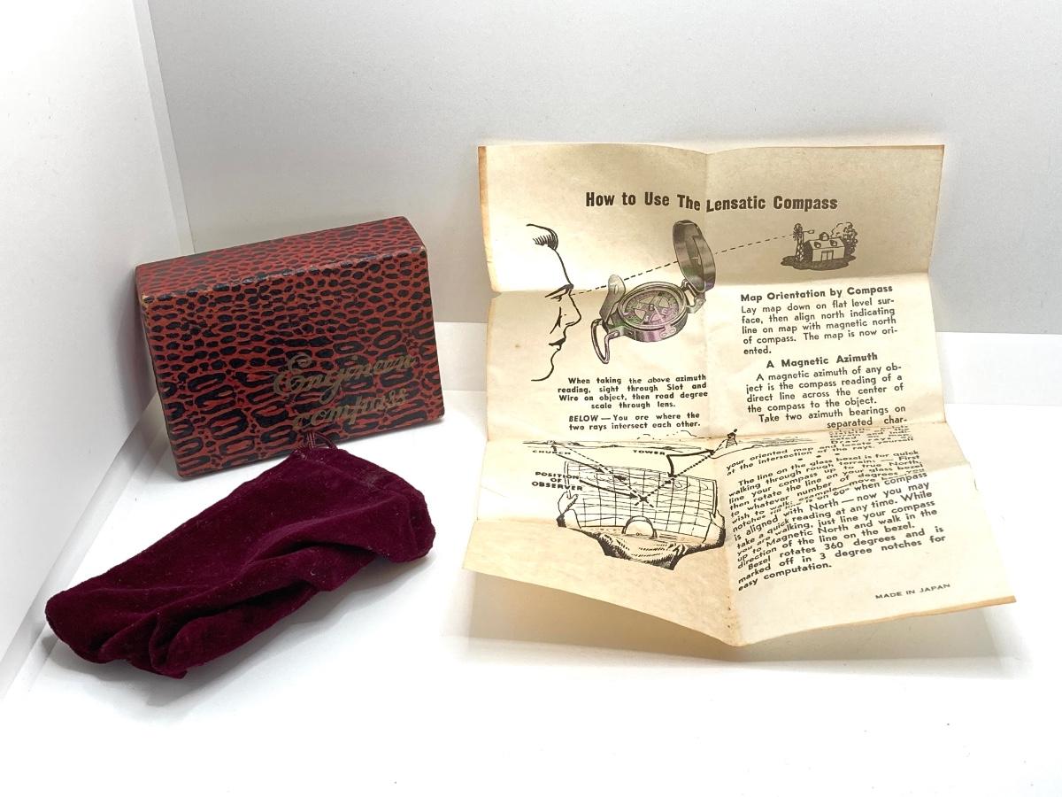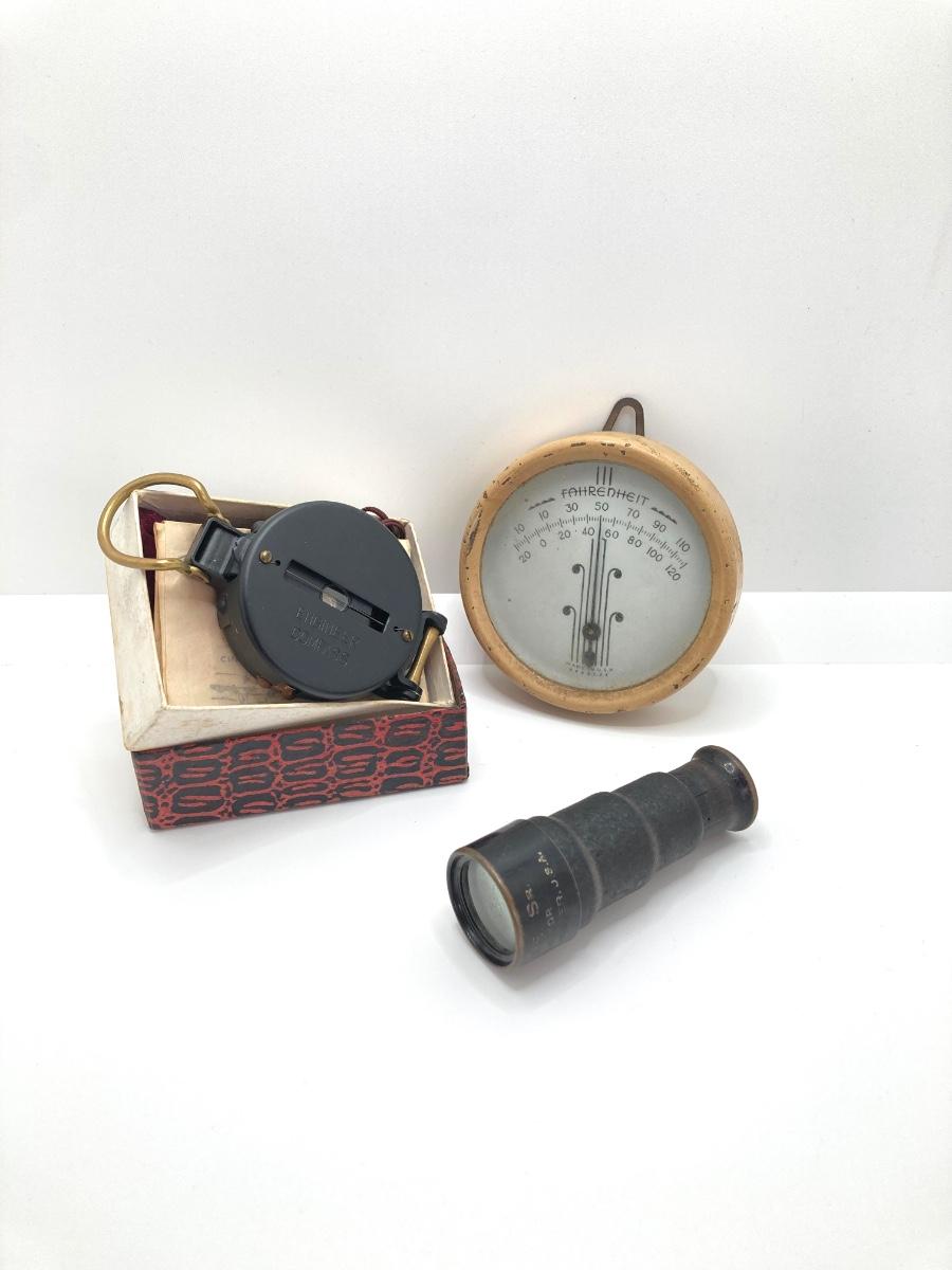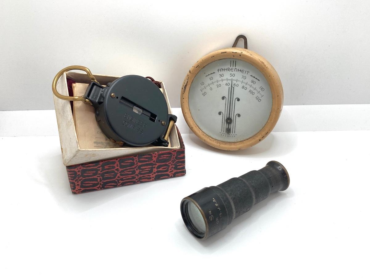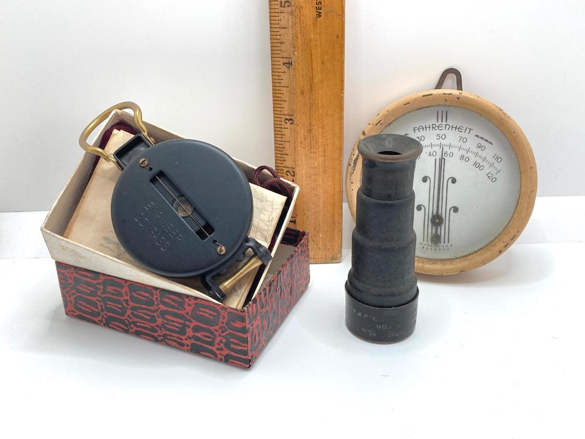 LOT 568: Vintage Collection - Engineer's Compass in Original Box, Pocketscope and Portable Made in USA Metal Fahrenheit Thermometer