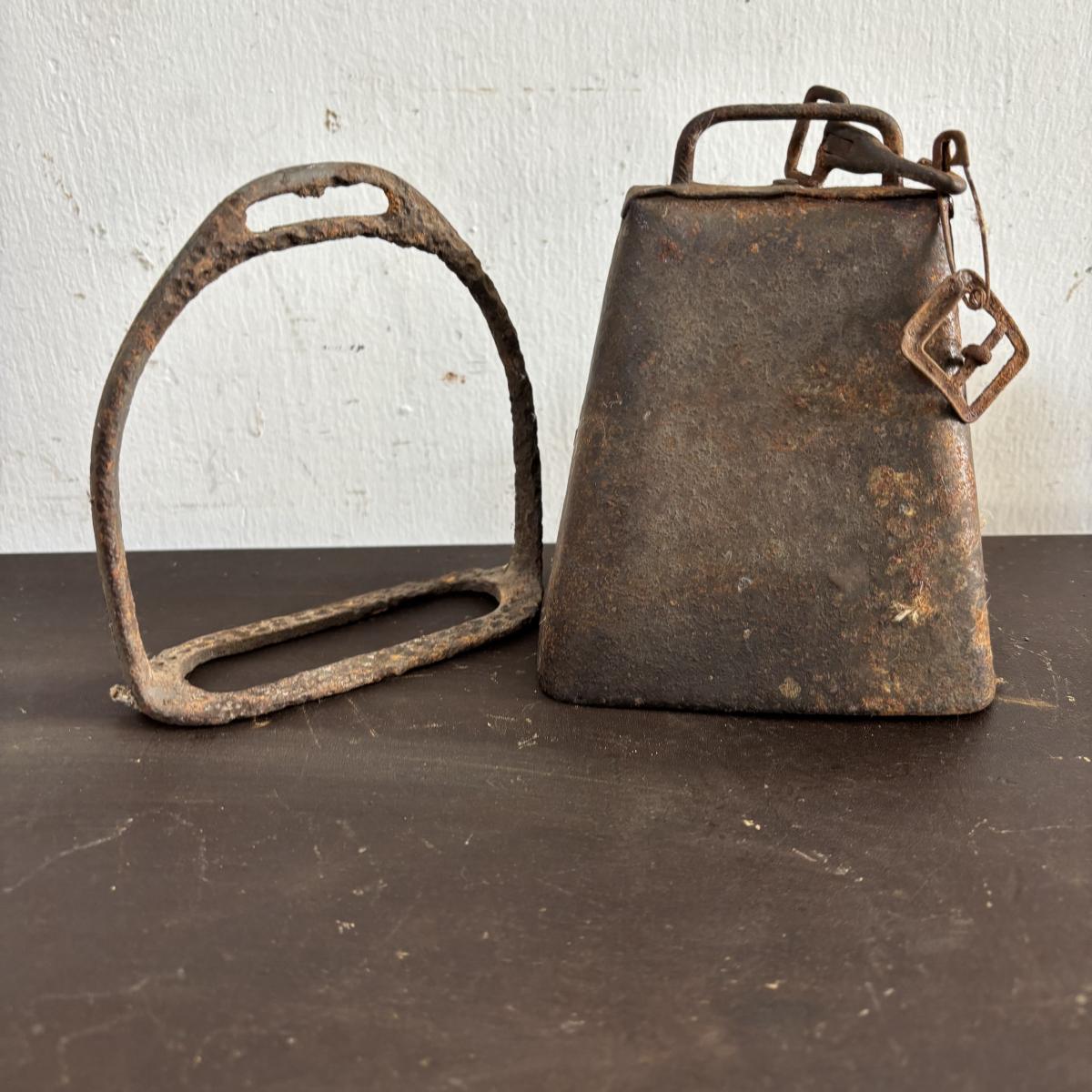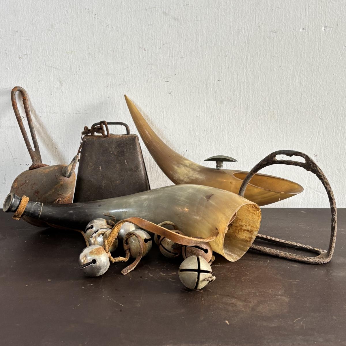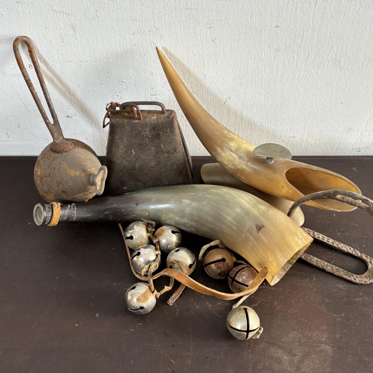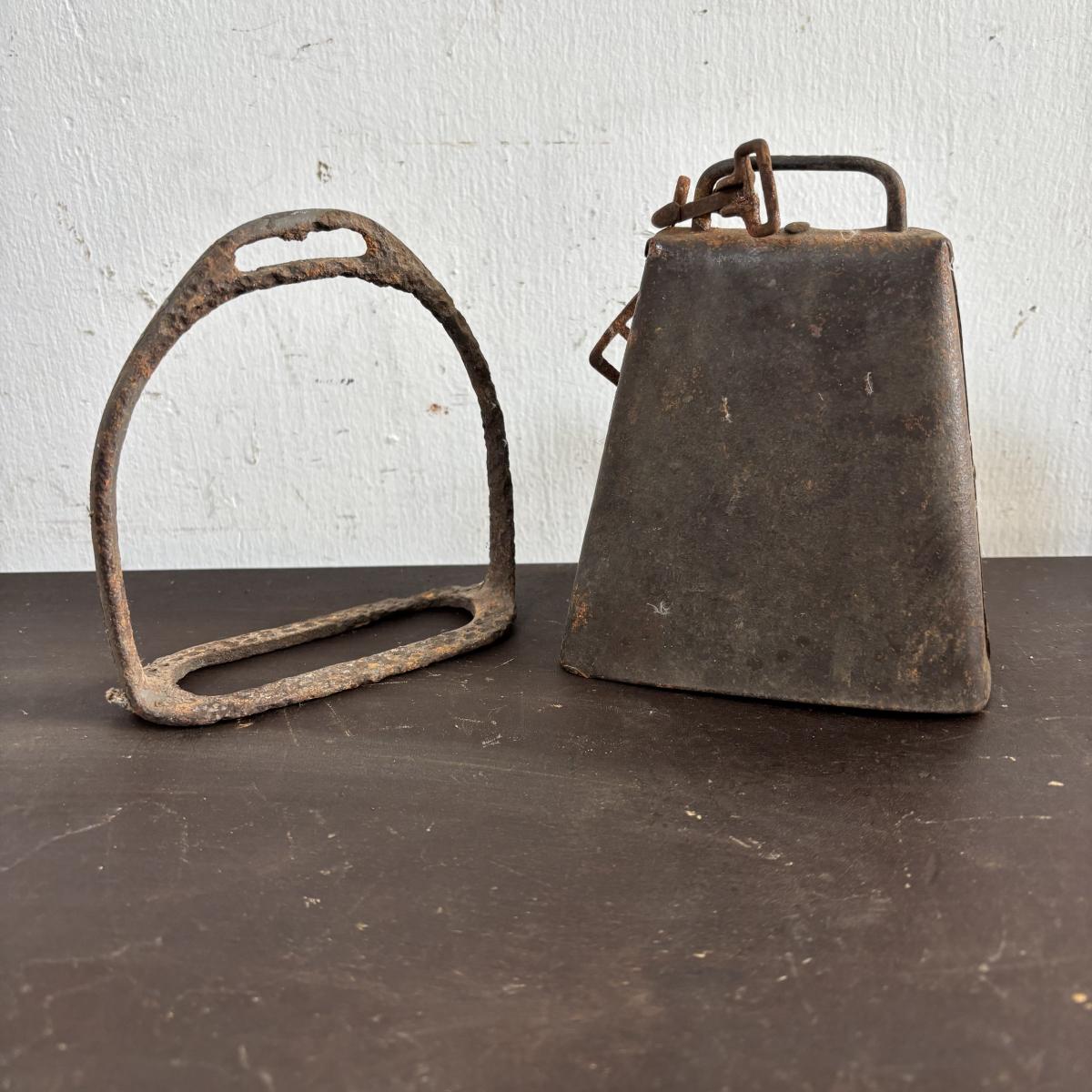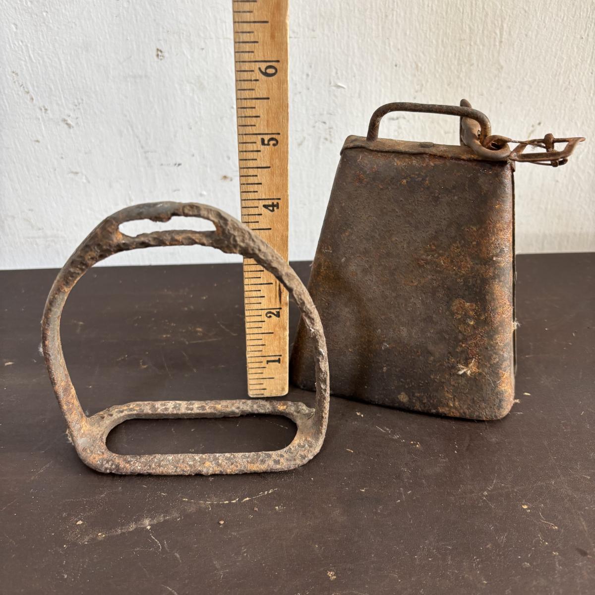 LOT 585: Vtg. Authentic Bull Horn Cigar Rest/Ashtray & Powder Horn, Rustic Iron Horse Paddle Stirrup/Footrest, Cow Bell, Bells & More