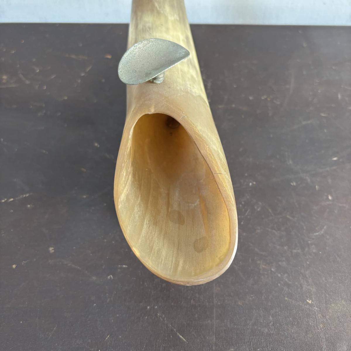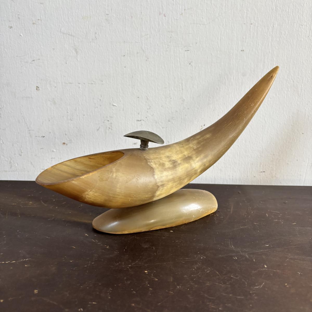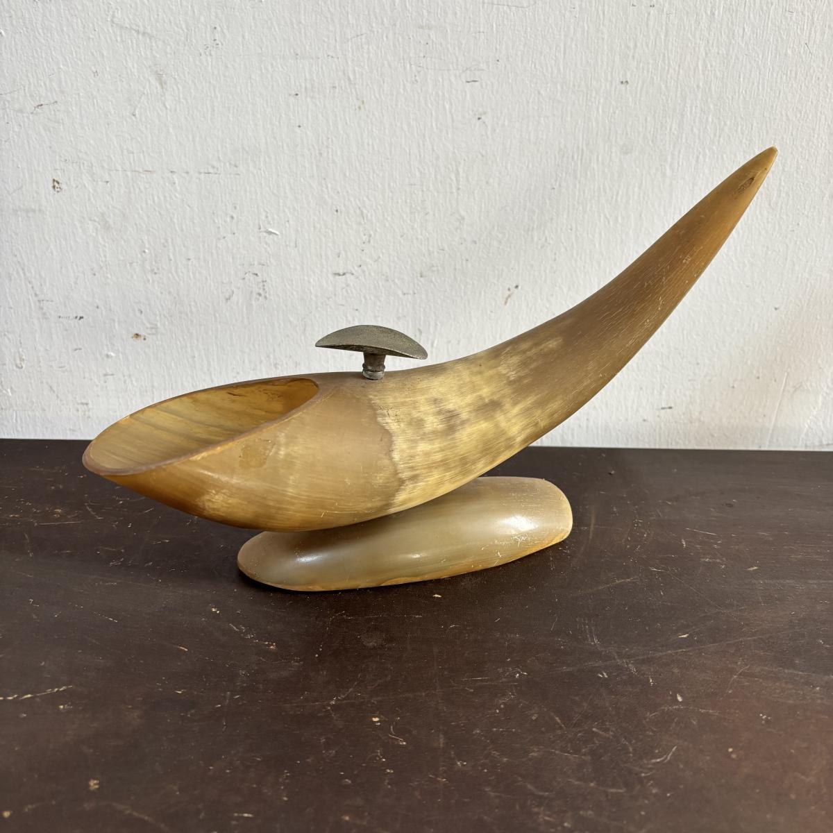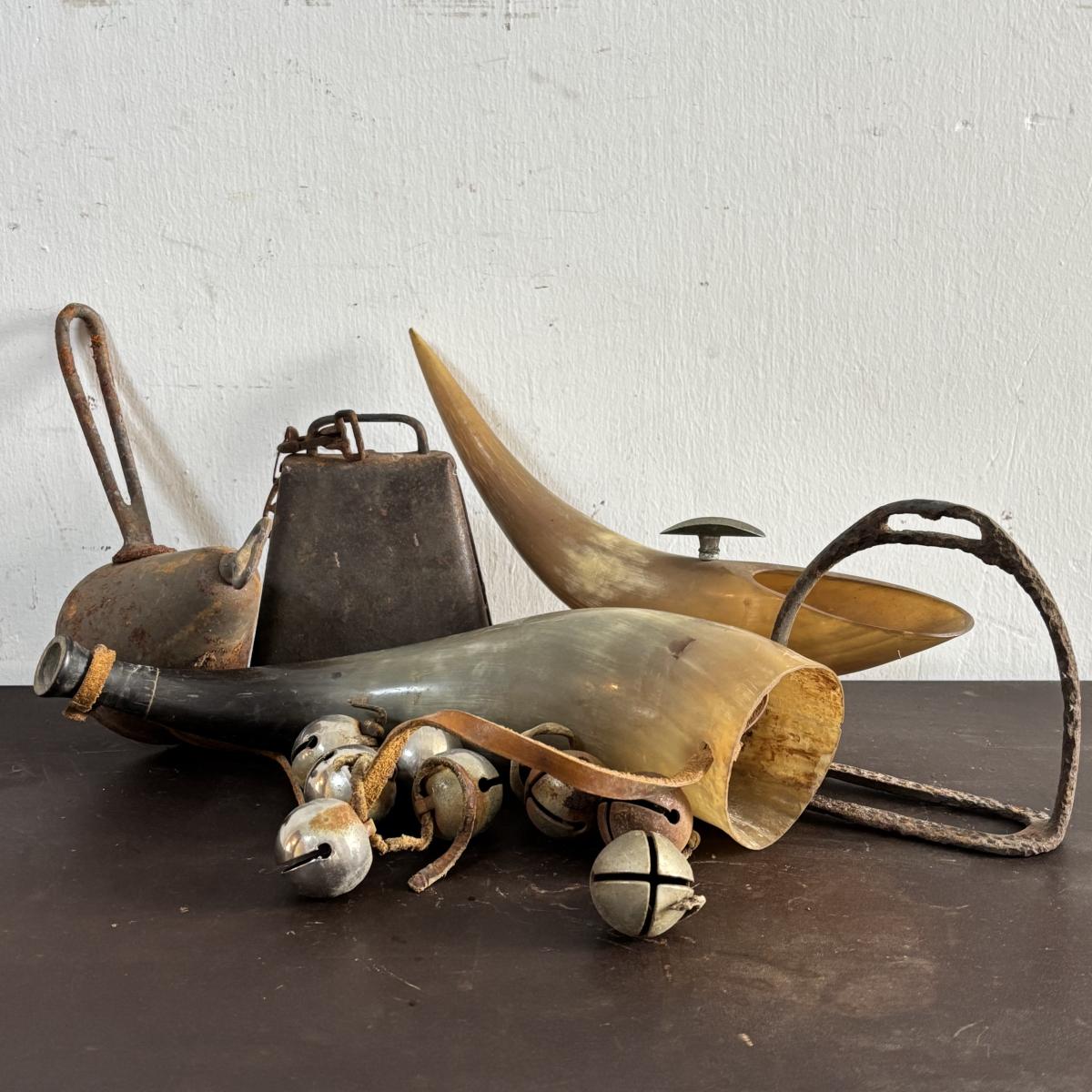 LOT 585: Vtg. Authentic Bull Horn Cigar Rest/Ashtray & Powder Horn, Rustic Iron Horse Paddle Stirrup/Footrest, Cow Bell, Bells & More