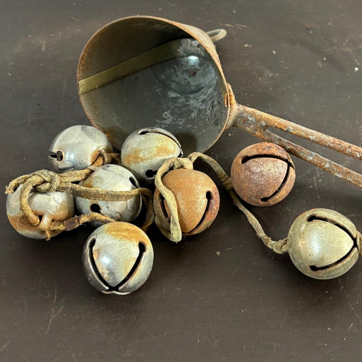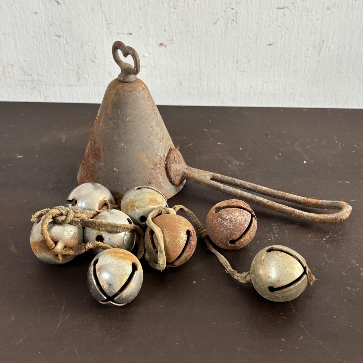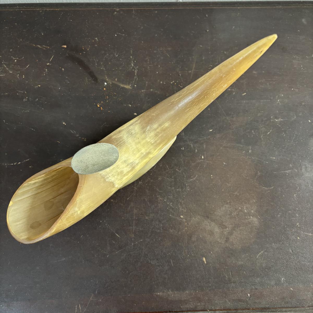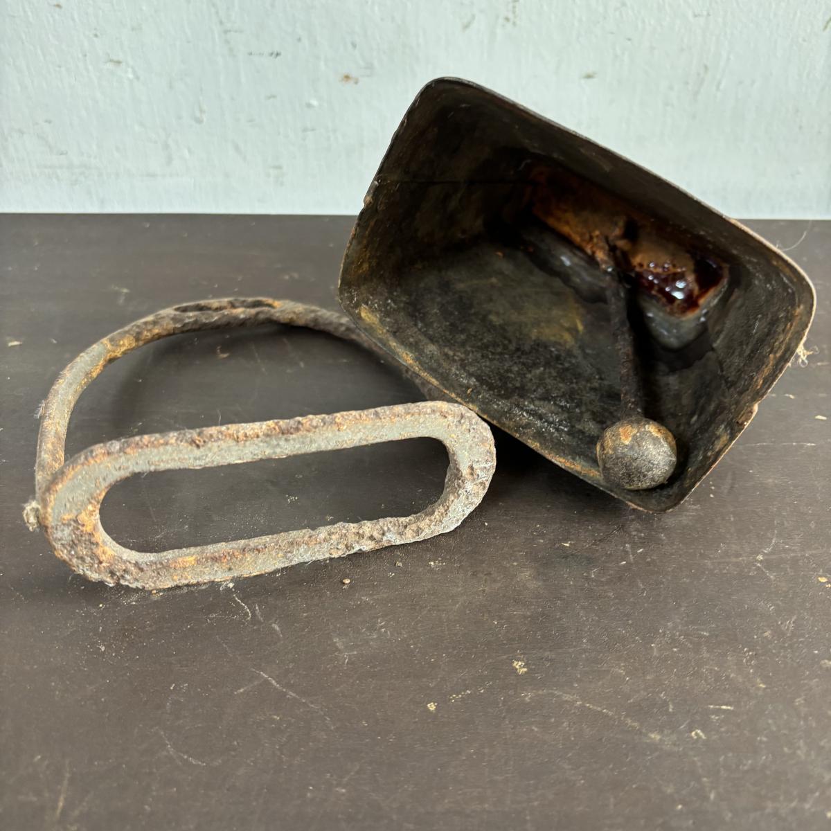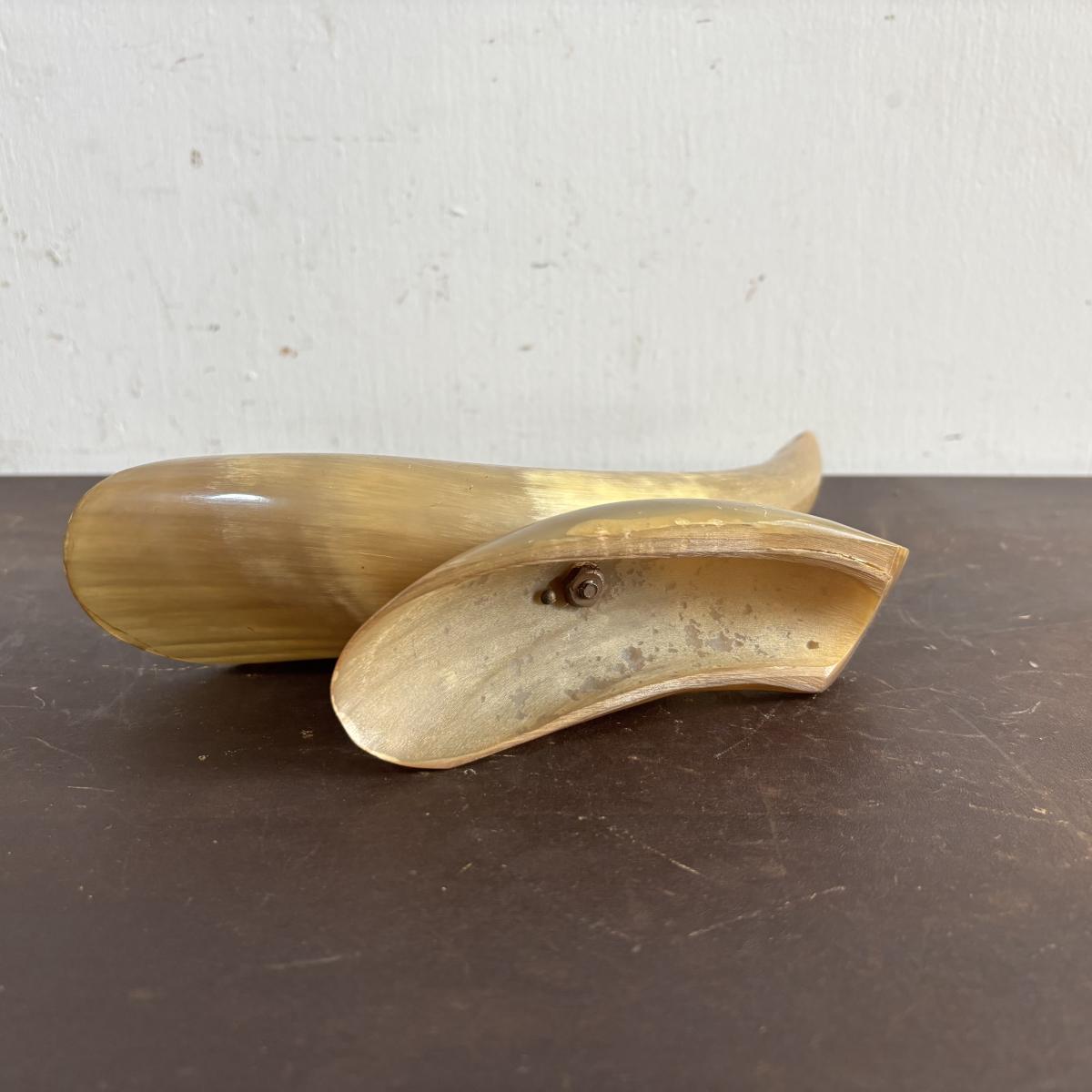 LOT 585: Vtg. Authentic Bull Horn Cigar Rest/Ashtray & Powder Horn, Rustic Iron Horse Paddle Stirrup/Footrest, Cow Bell, Bells & More