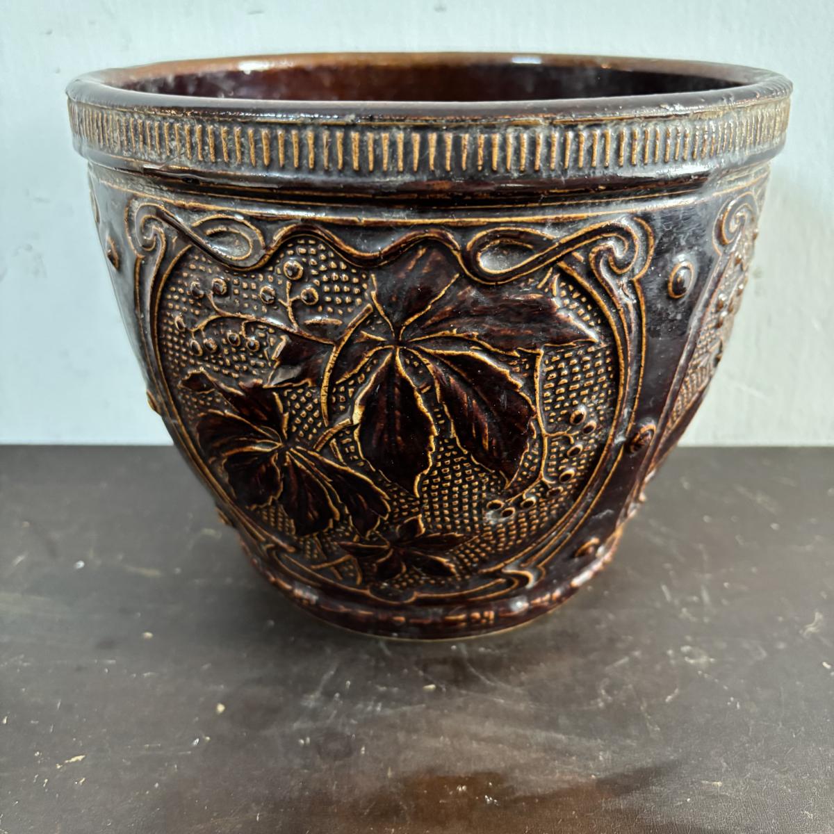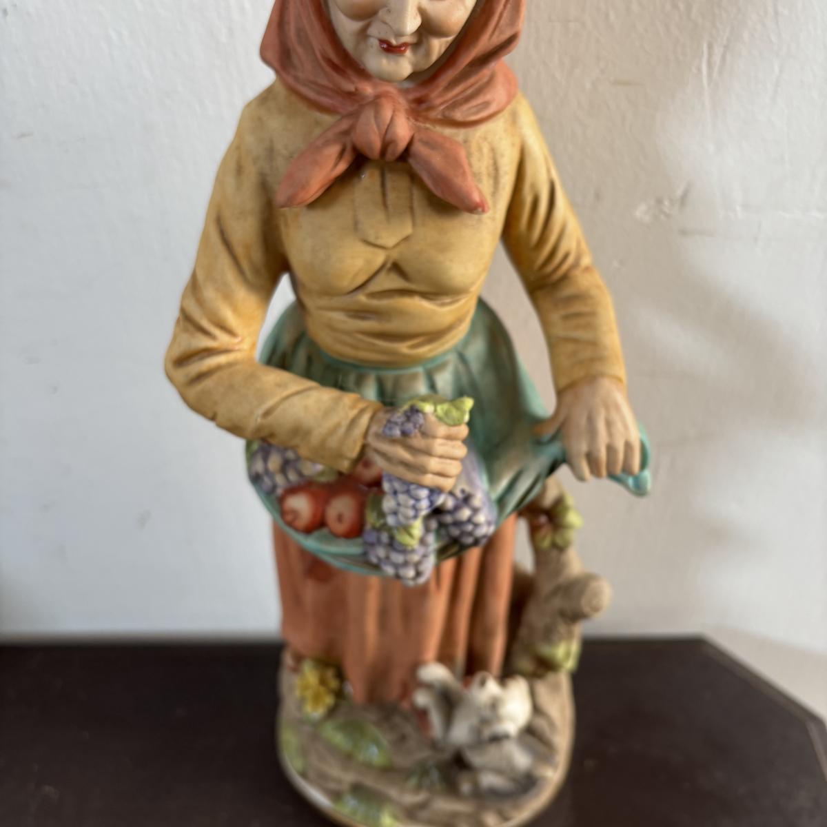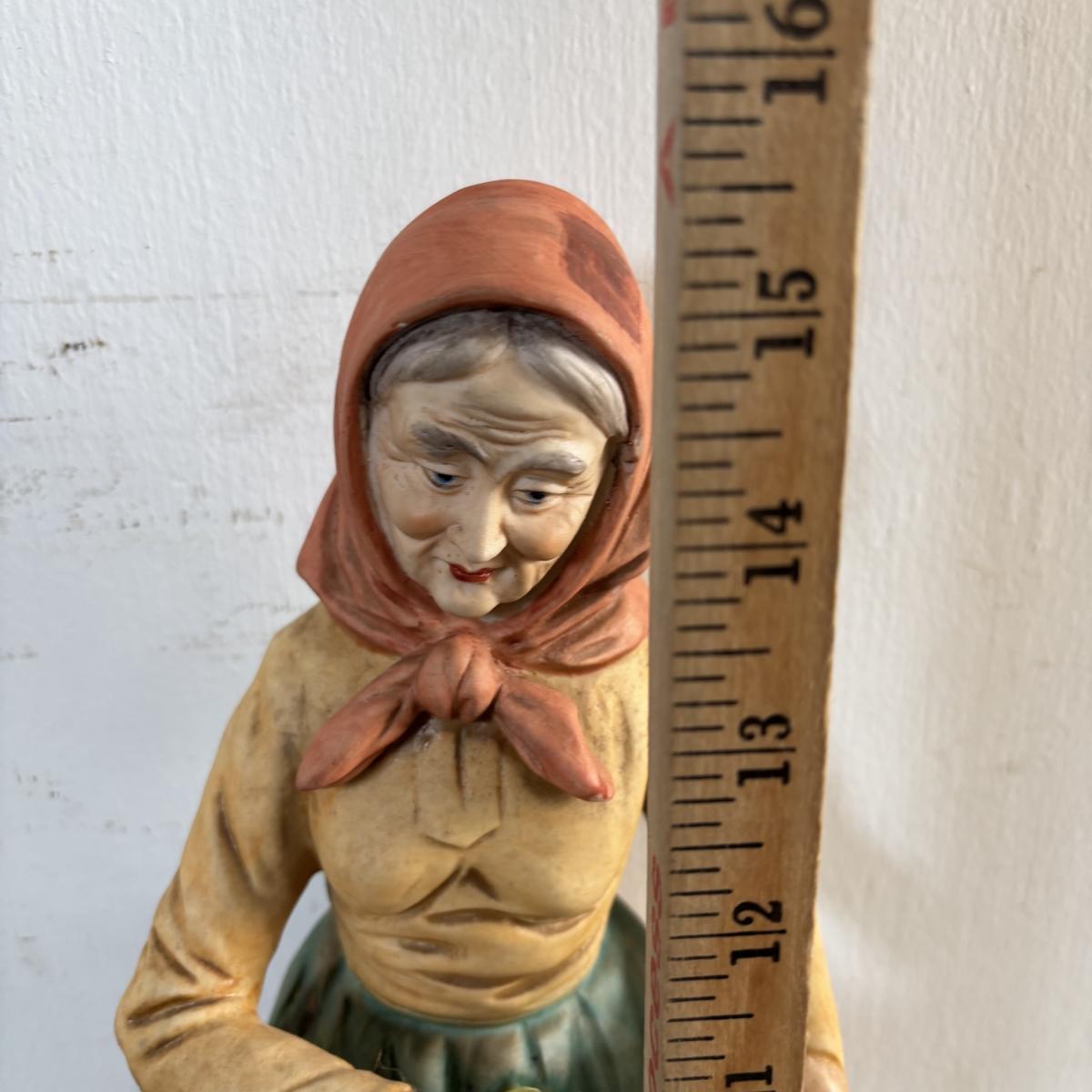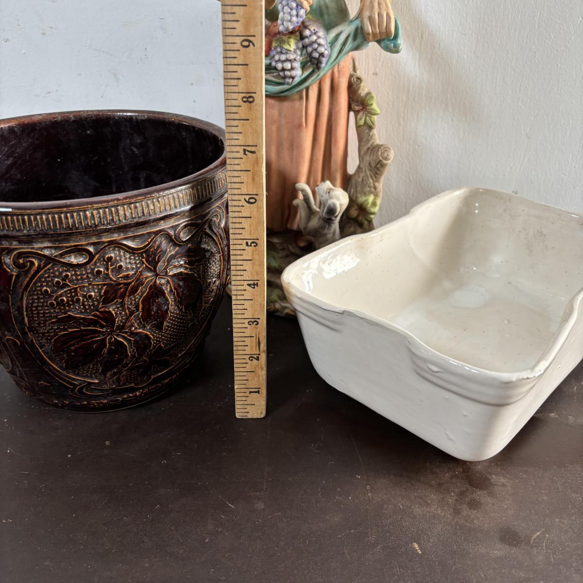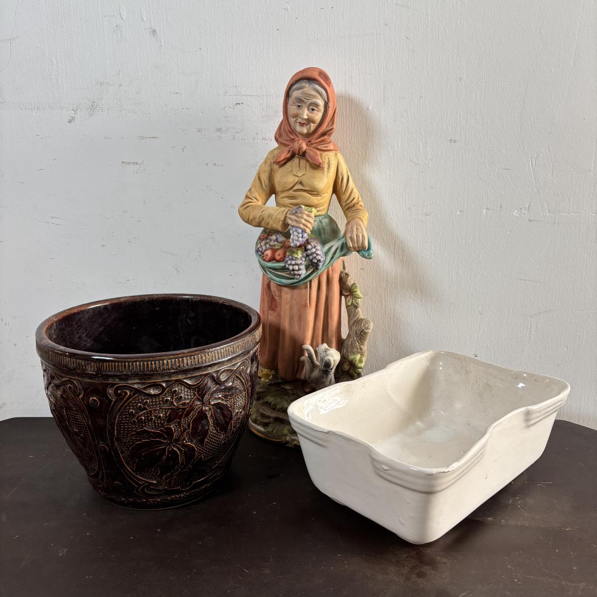 LOT 586: Vintage Brown Glazed Planter, Made in USA Planter & "Gathering Granny" Figurine