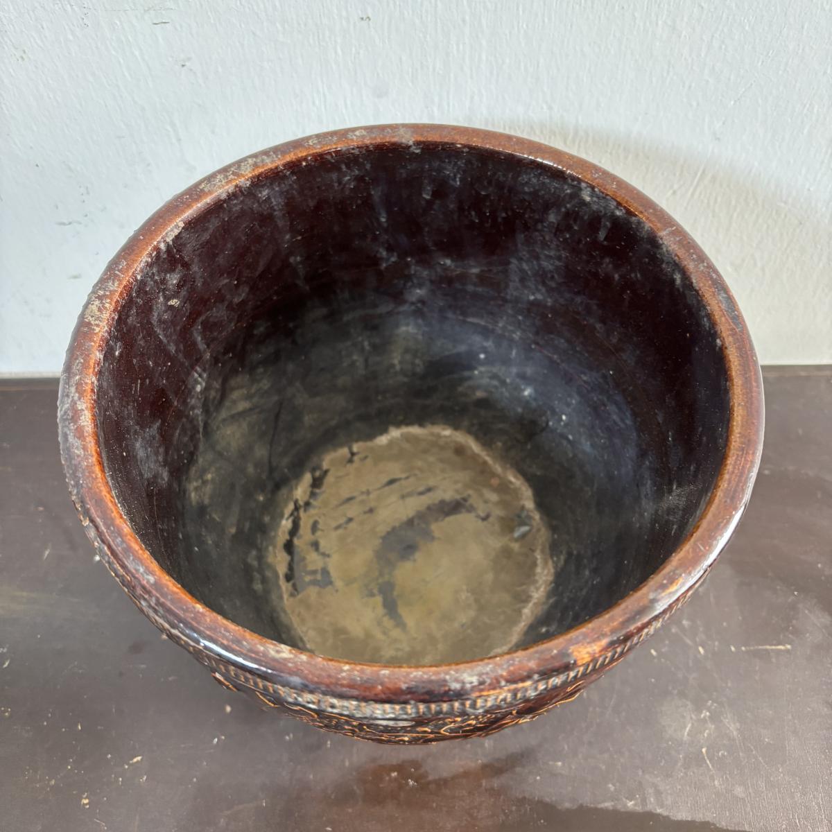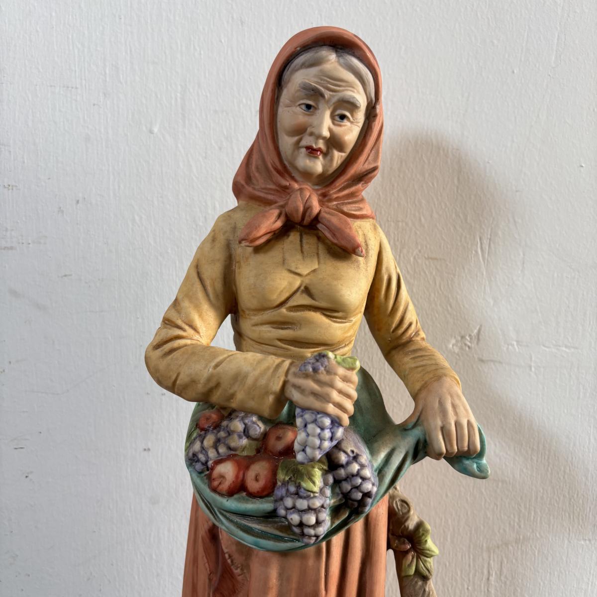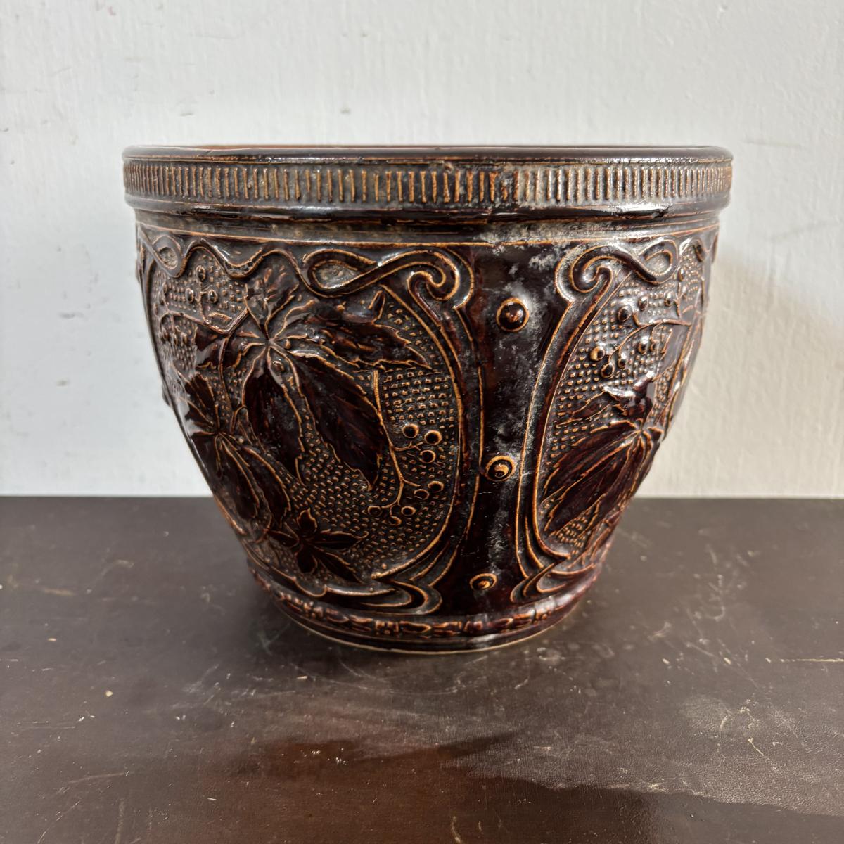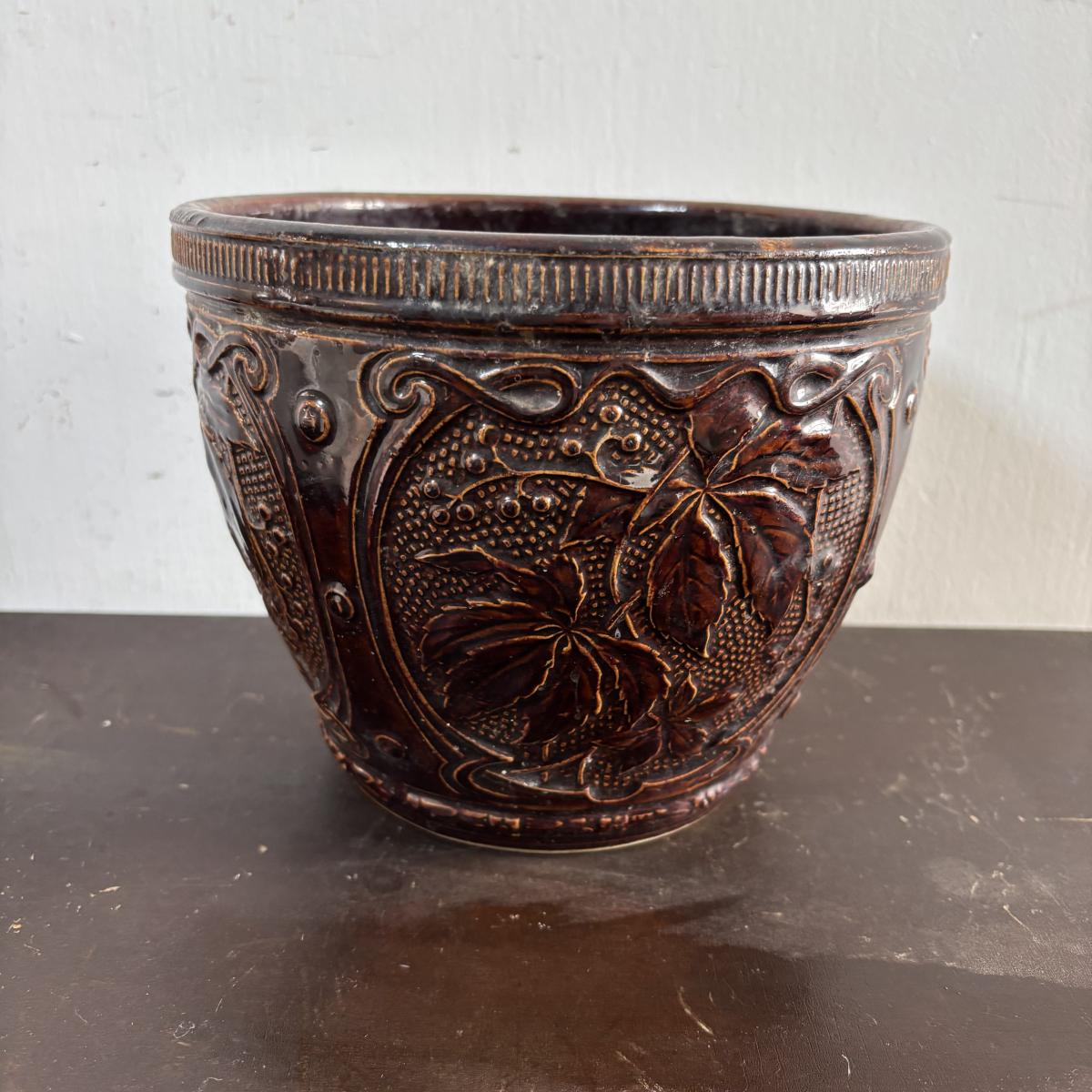 LOT 586: Vintage Brown Glazed Planter, Made in USA Planter & "Gathering Granny" Figurine