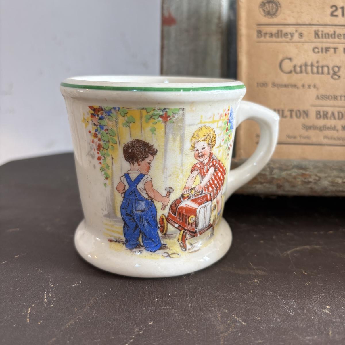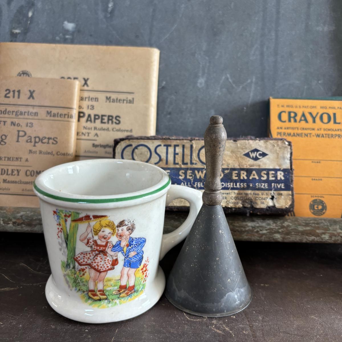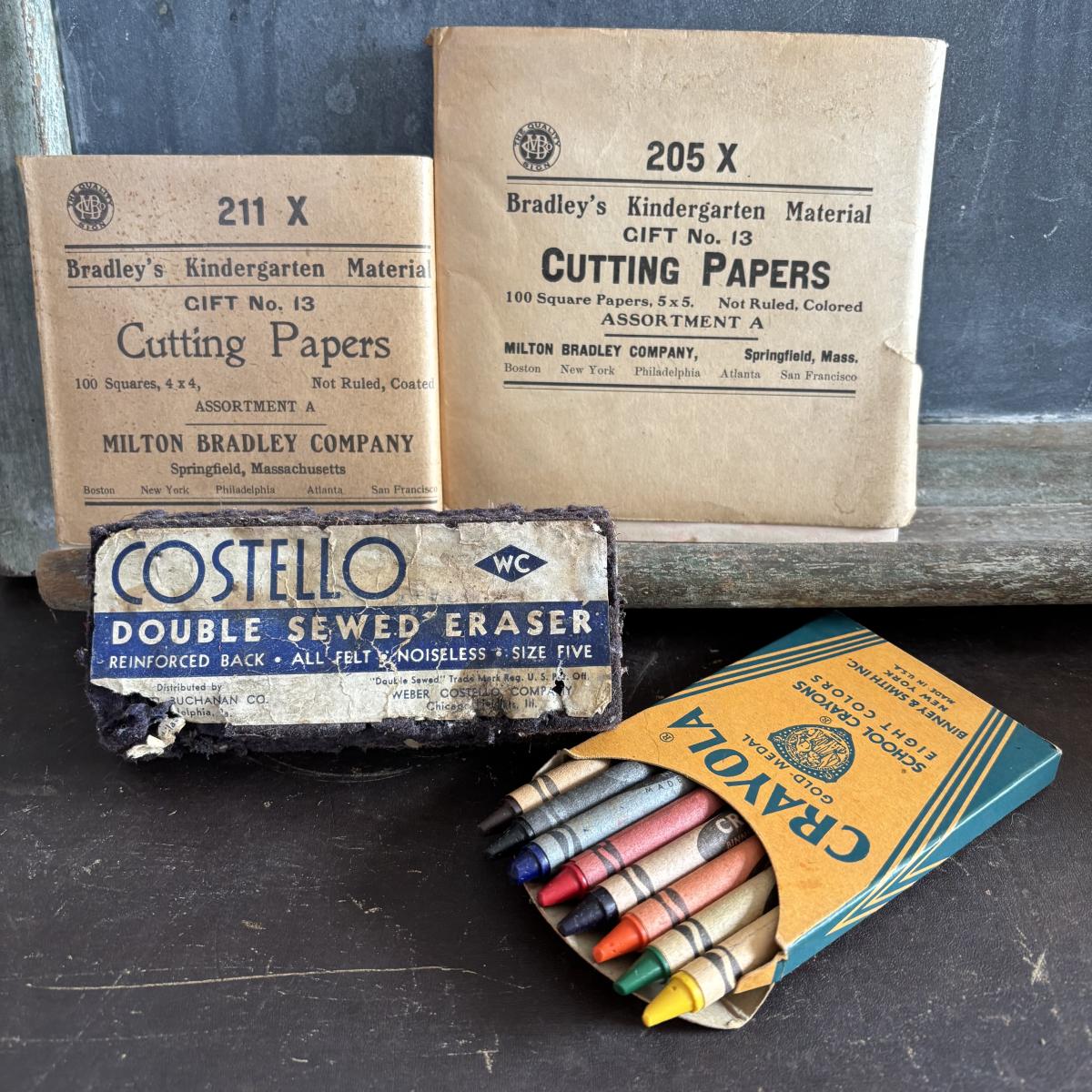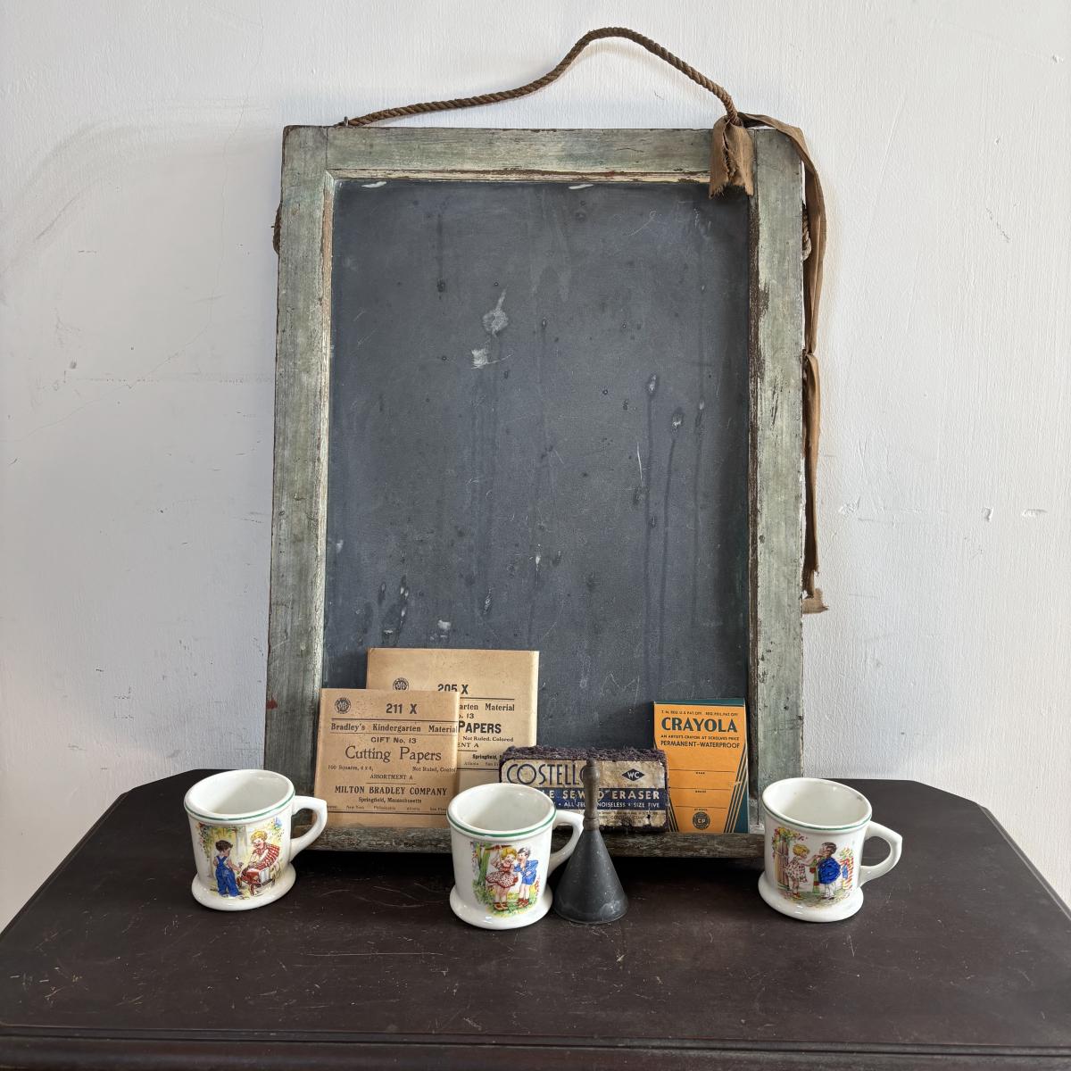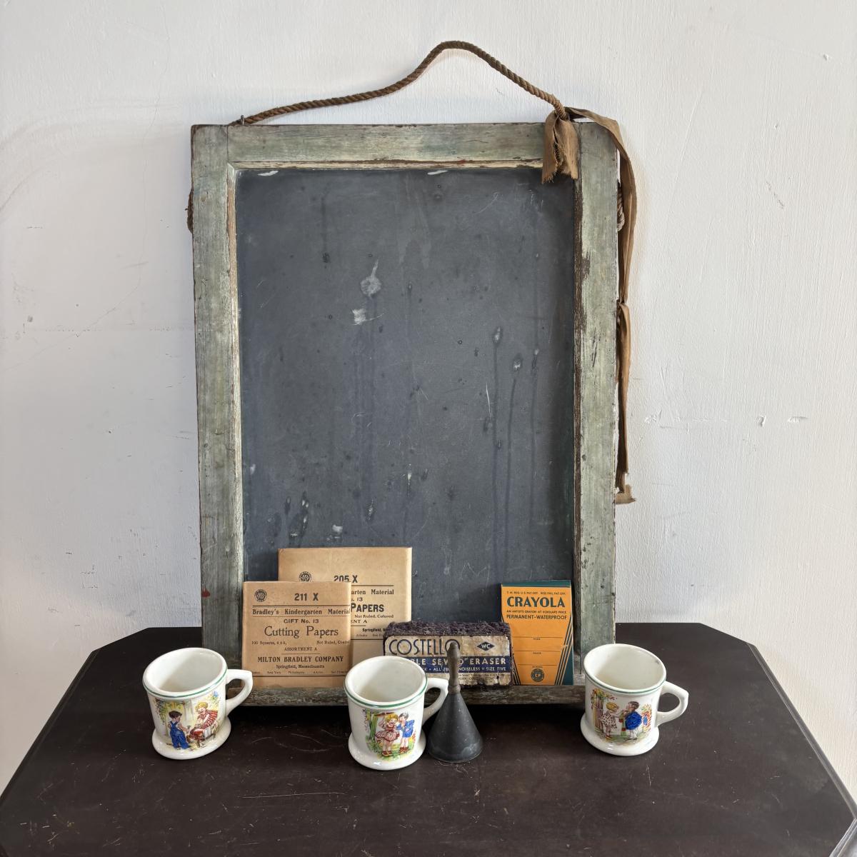 LOT 590: Slate Chalkboard, Warwick Child's Baby Mugs, Crayola Crayons, Bradley Kindergarten Cutting Paper