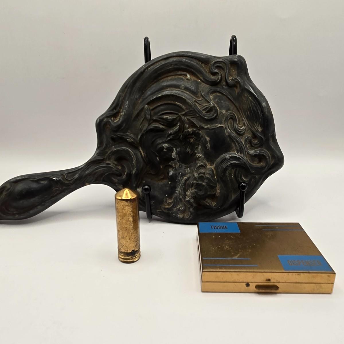 LOT 601: Antique Hand Mirror, Tissue Holder, & Lipstick