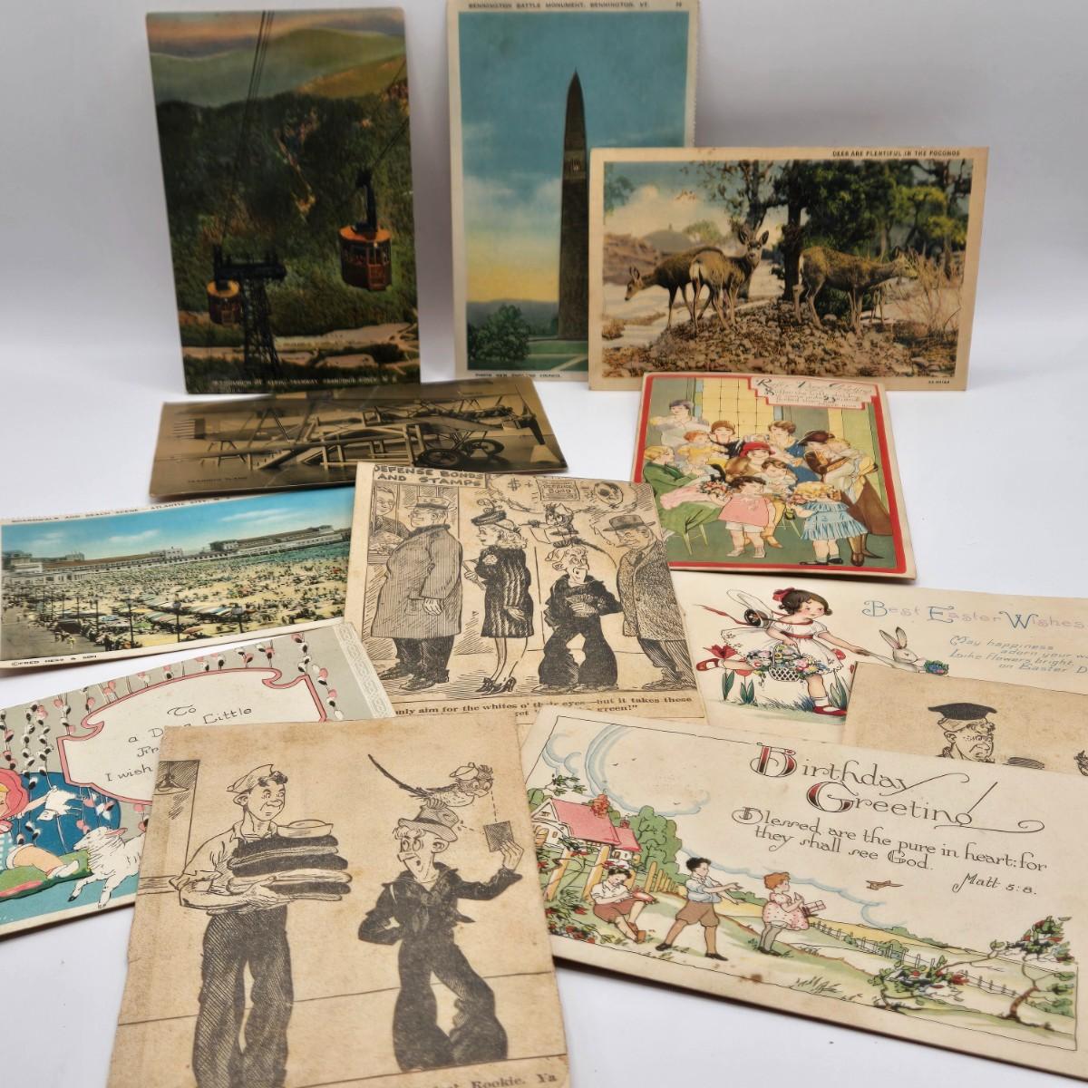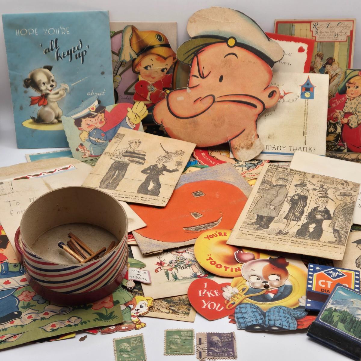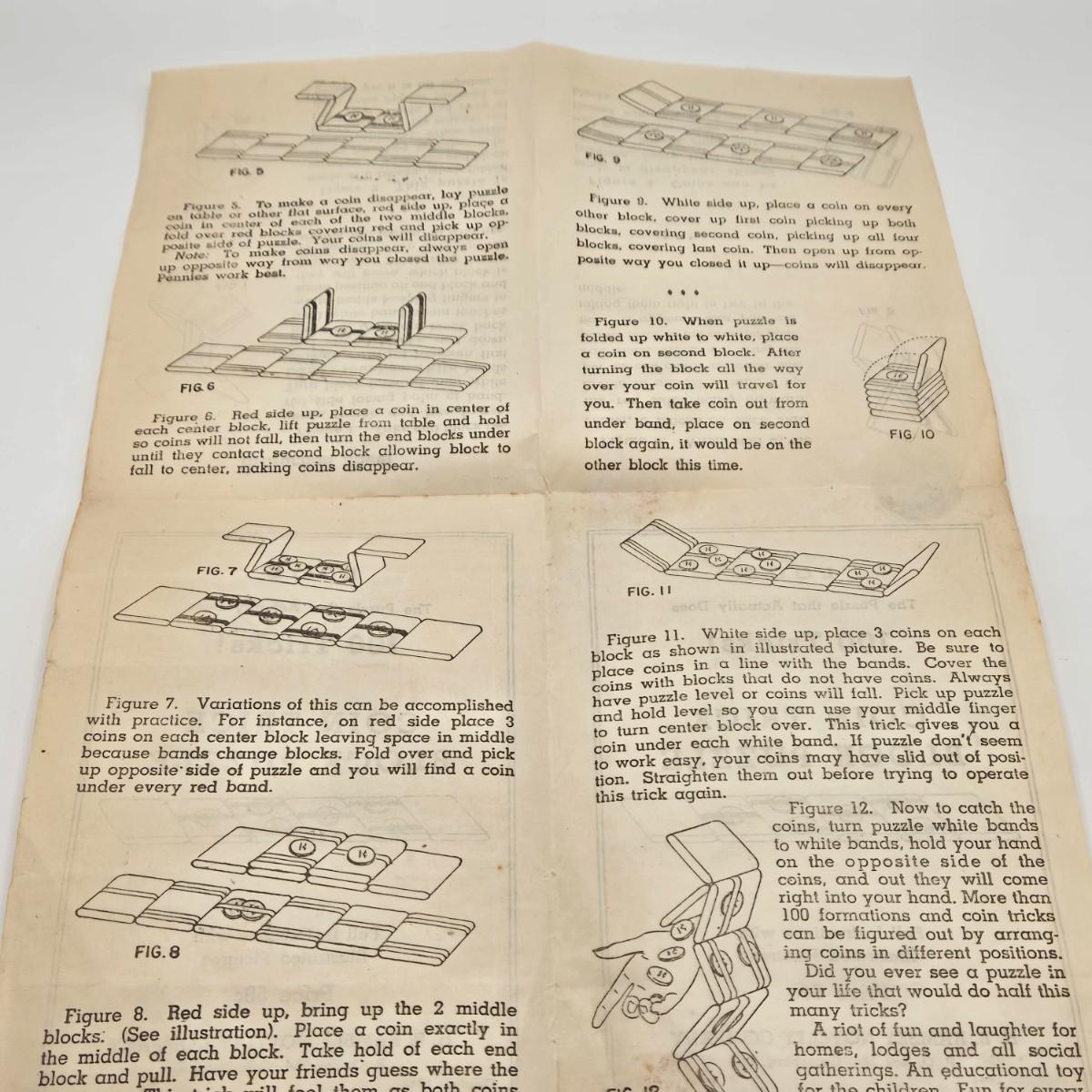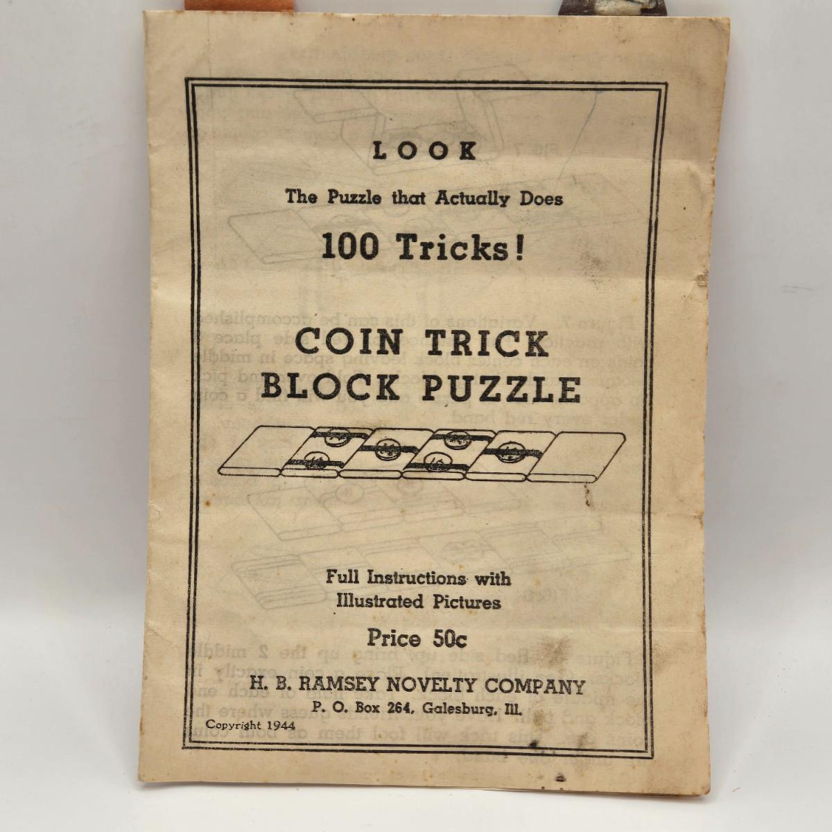 LOT 619: Various Postcards, Greeting Cards, Comic Strips, Matches, Stamps, & Coin Trick Block Puzzle Instructions