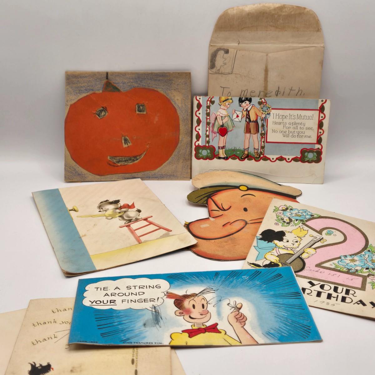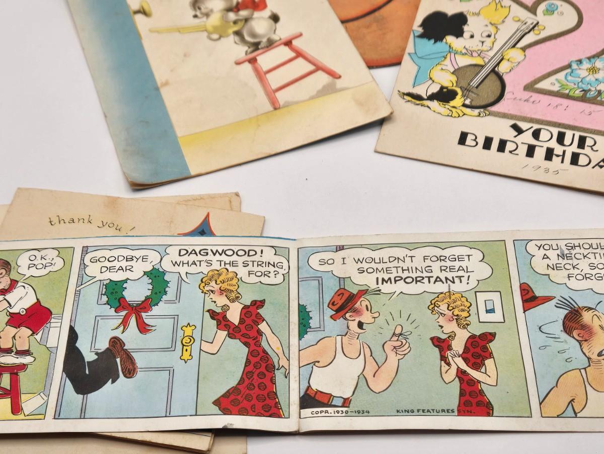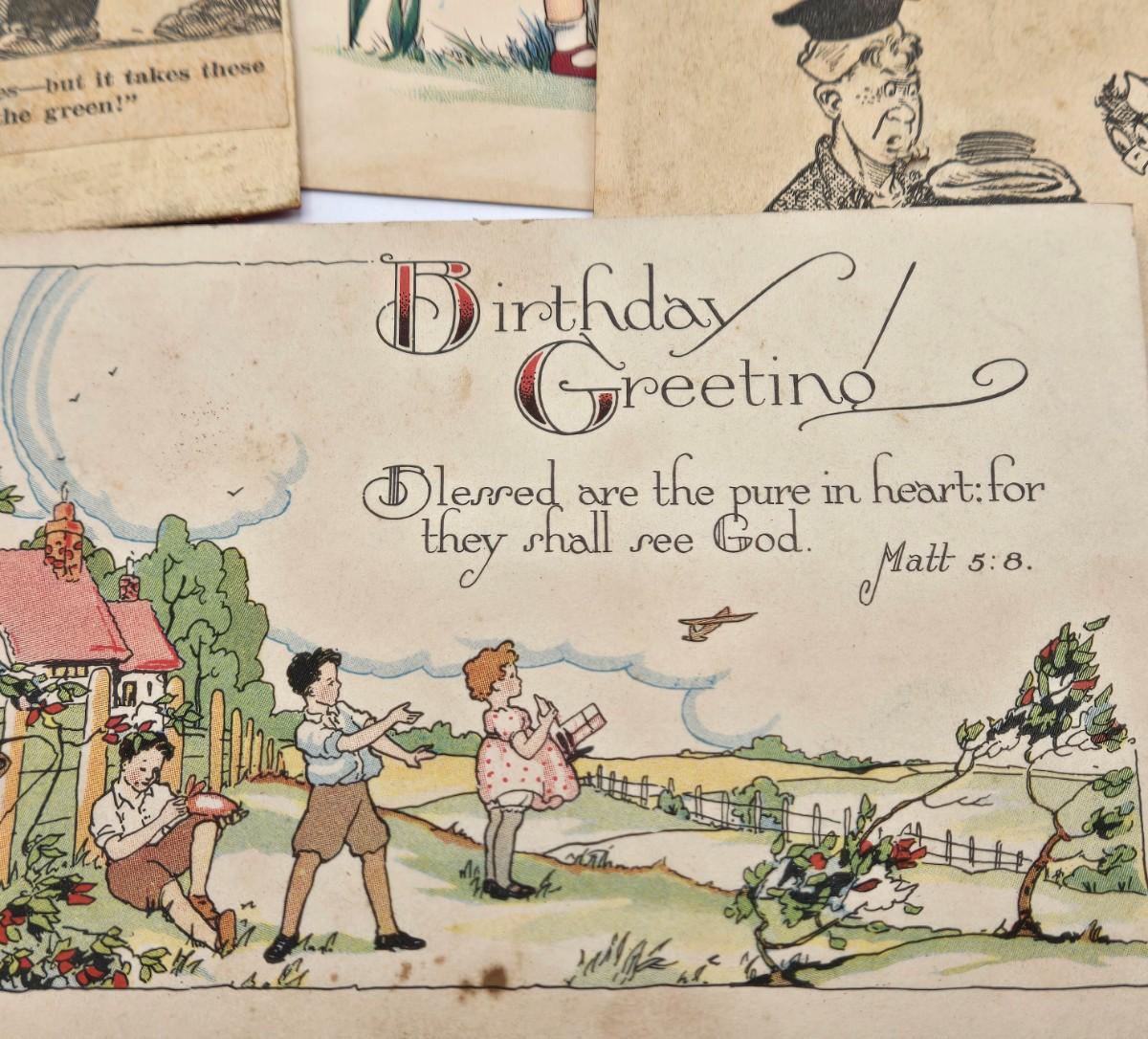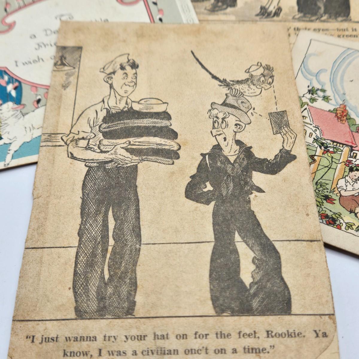 LOT 619: Various Postcards, Greeting Cards, Comic Strips, Matches, Stamps, & Coin Trick Block Puzzle Instructions