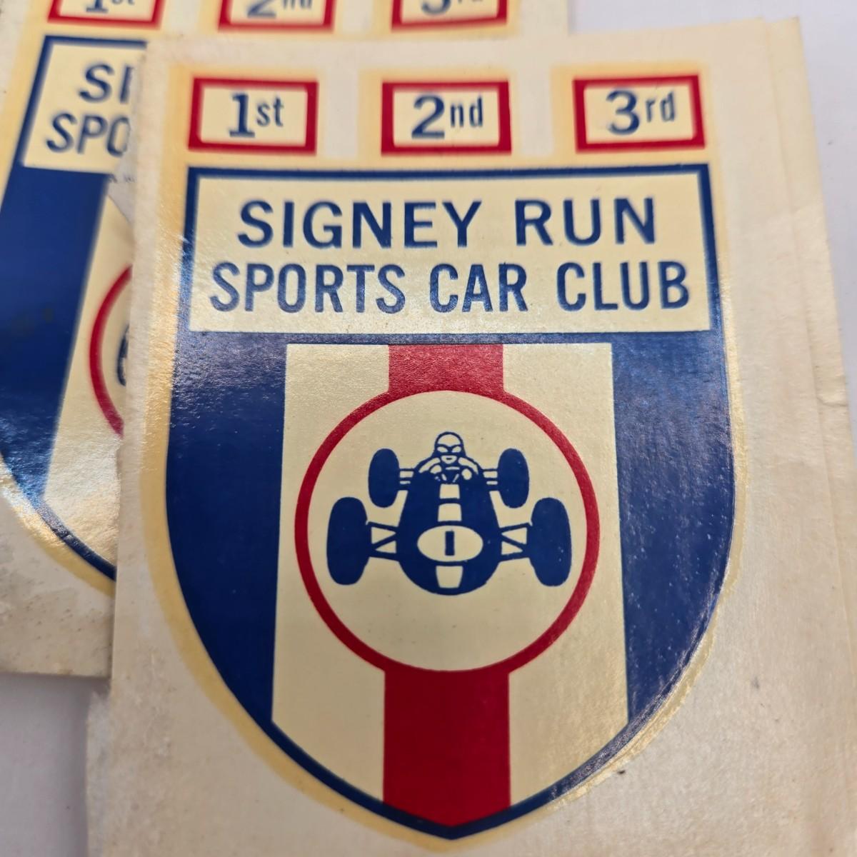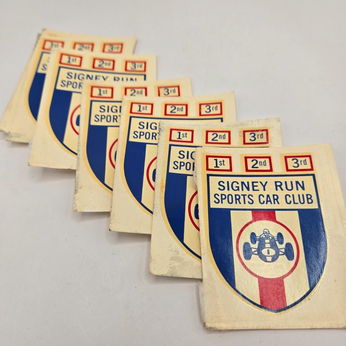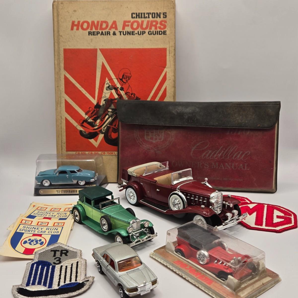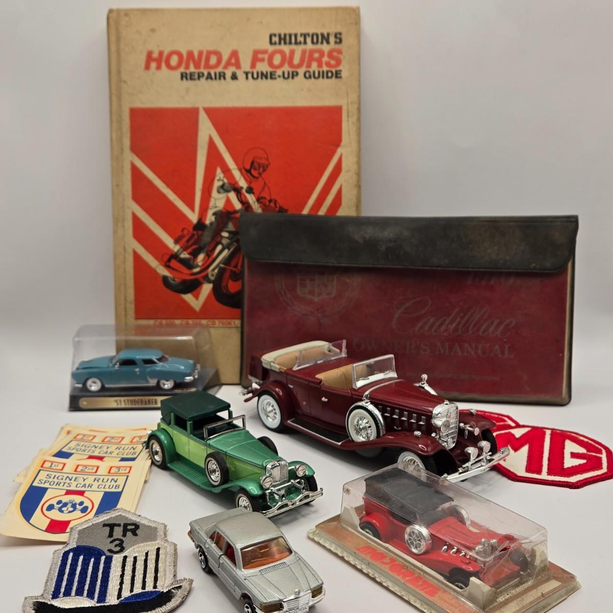 LOT 623: Honda Repair Guide Book, 1976 Cadillac Owner's Manuel, Various Die Cast Metal Cars, Morris Garages Car Logo Patches, Triumph TR3 Car Patch, & Signey Run farms Sports Car Club Stickers