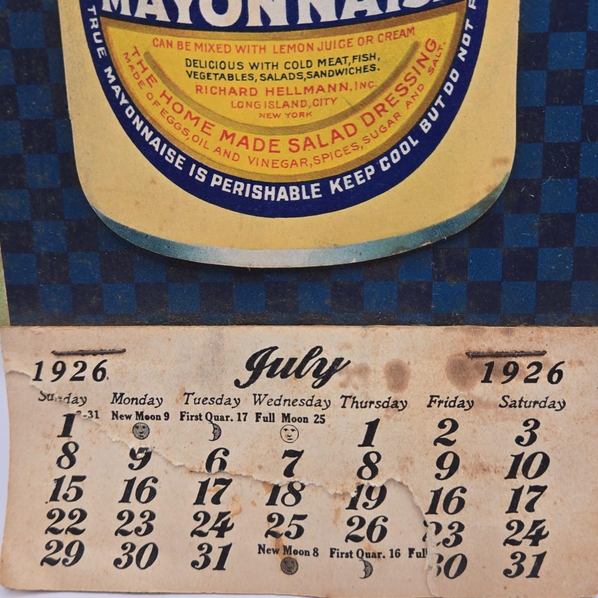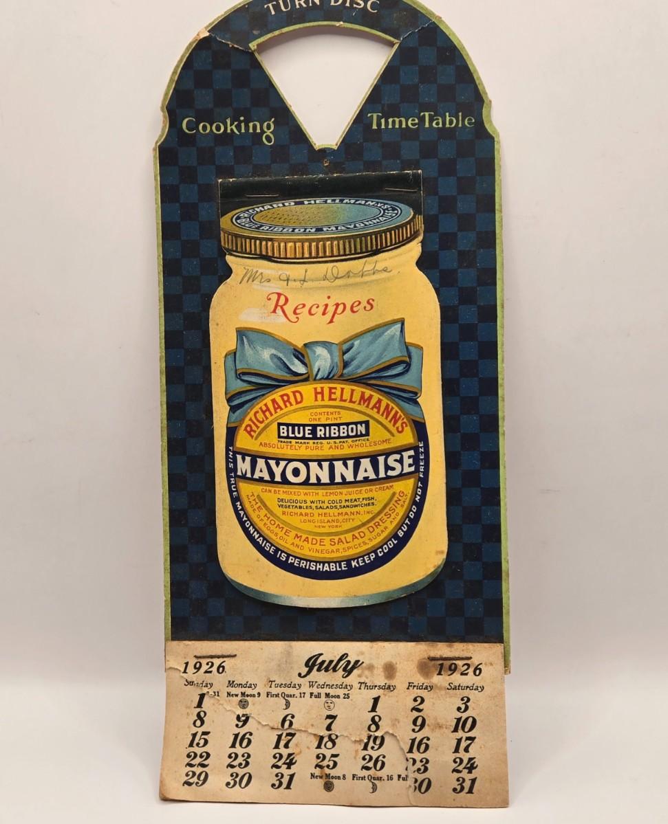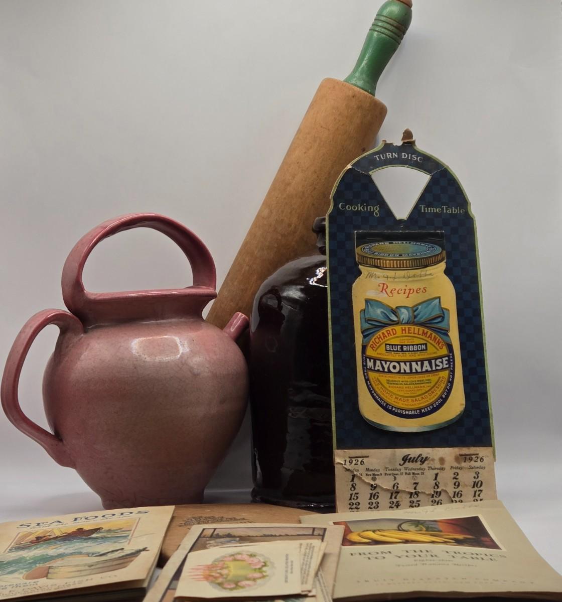 LOT 626: Small Pitcher , Appears to be Handmade, Antique Stoneware Crock Jug, Vintage Rolling Pin,1926 Hellmann's Mayonnaise Calendar, Frigidaire Recipe Book, & More,