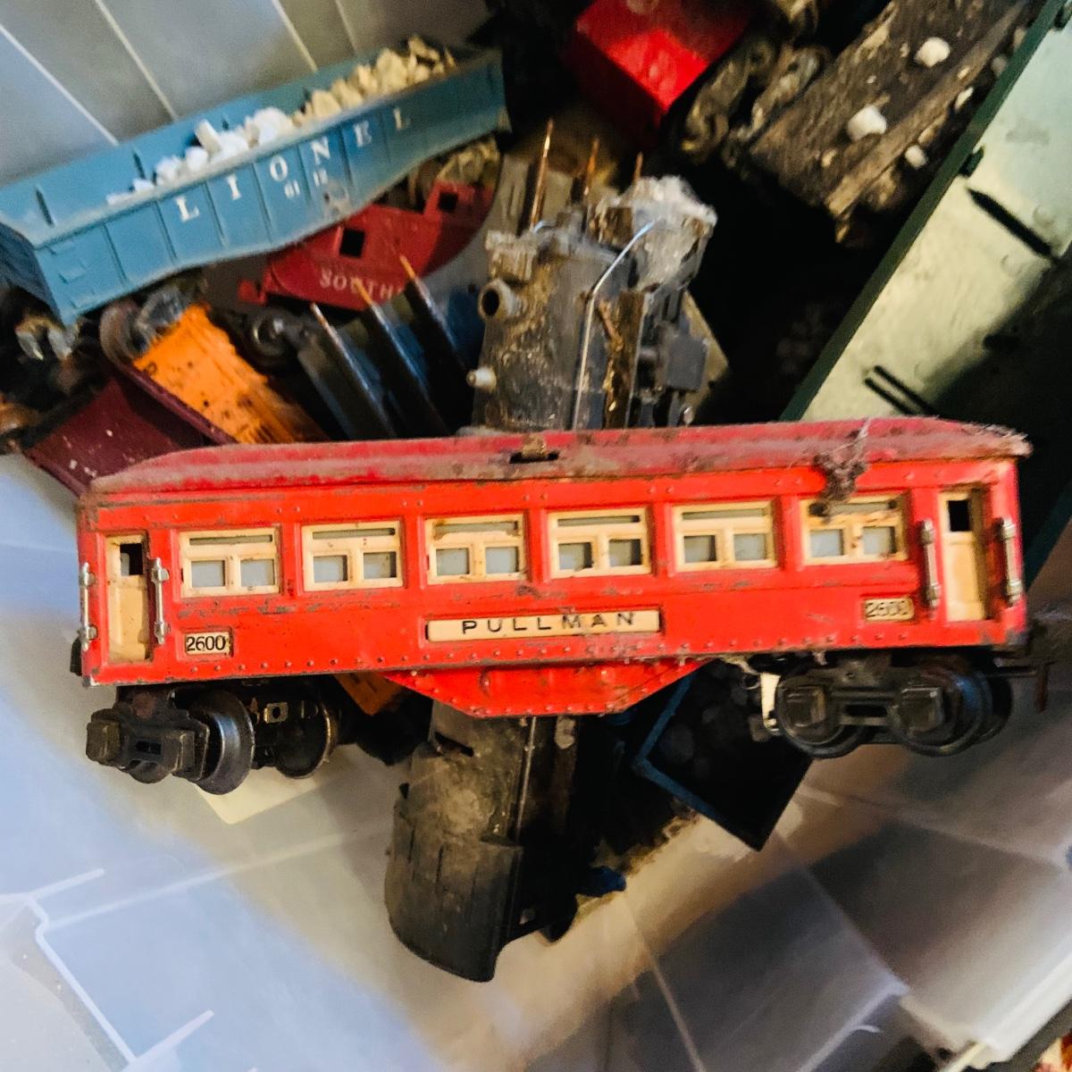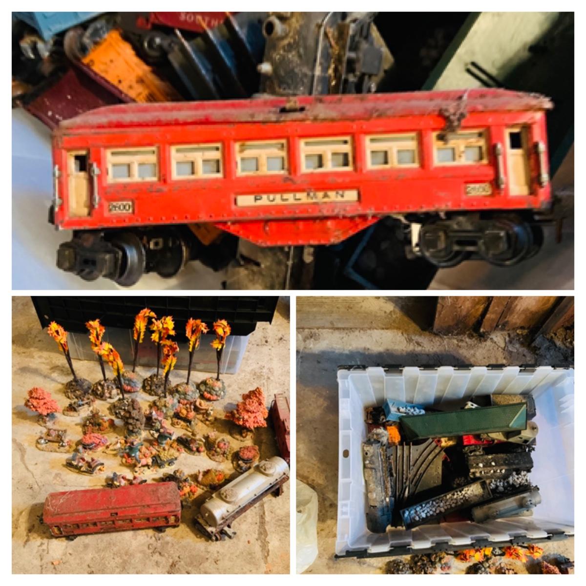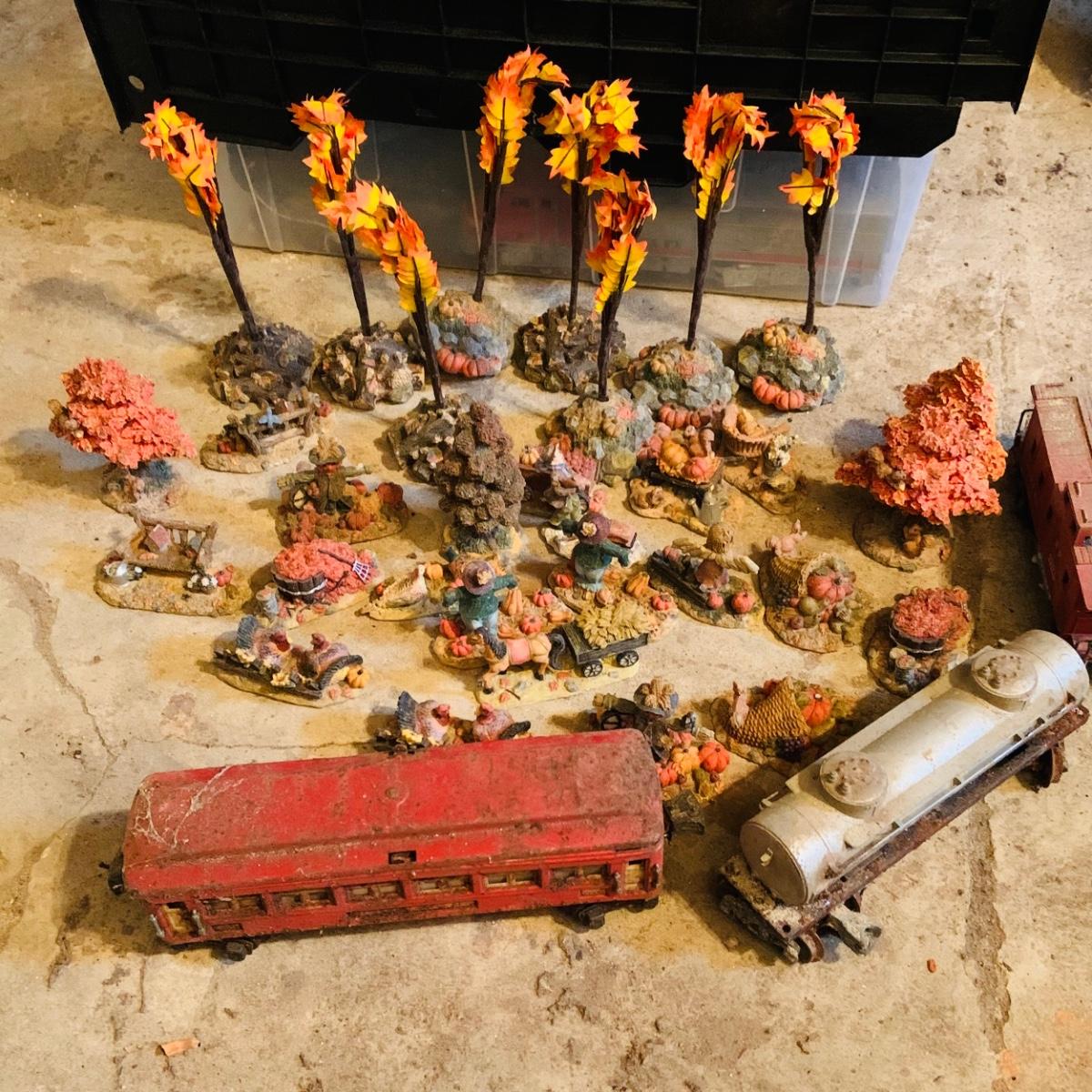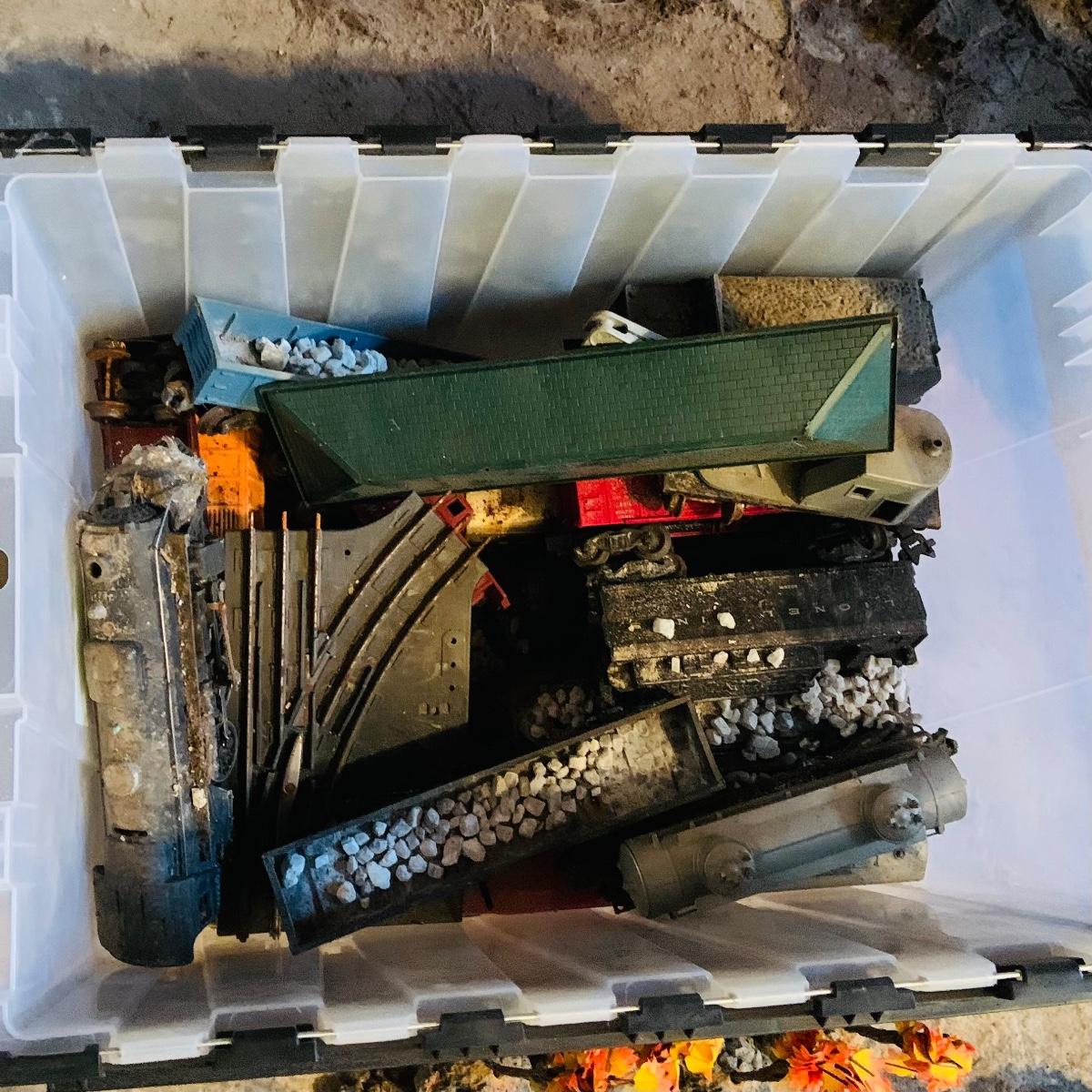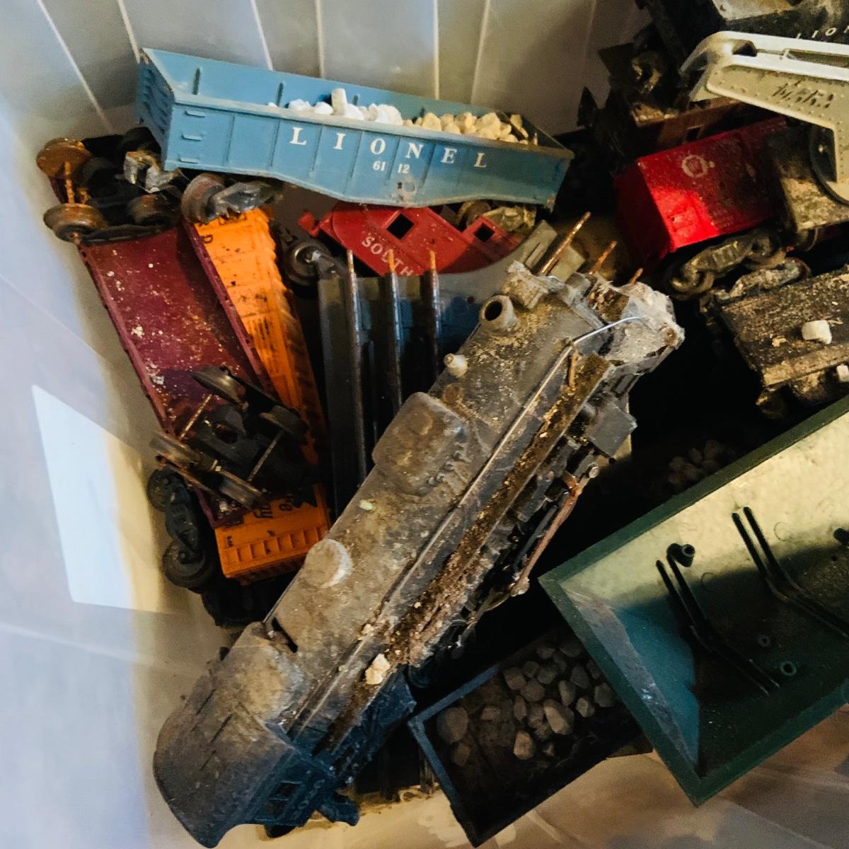 LOT 635: Bin of Vintage O Scale Miniature Trains and Fall Accessories