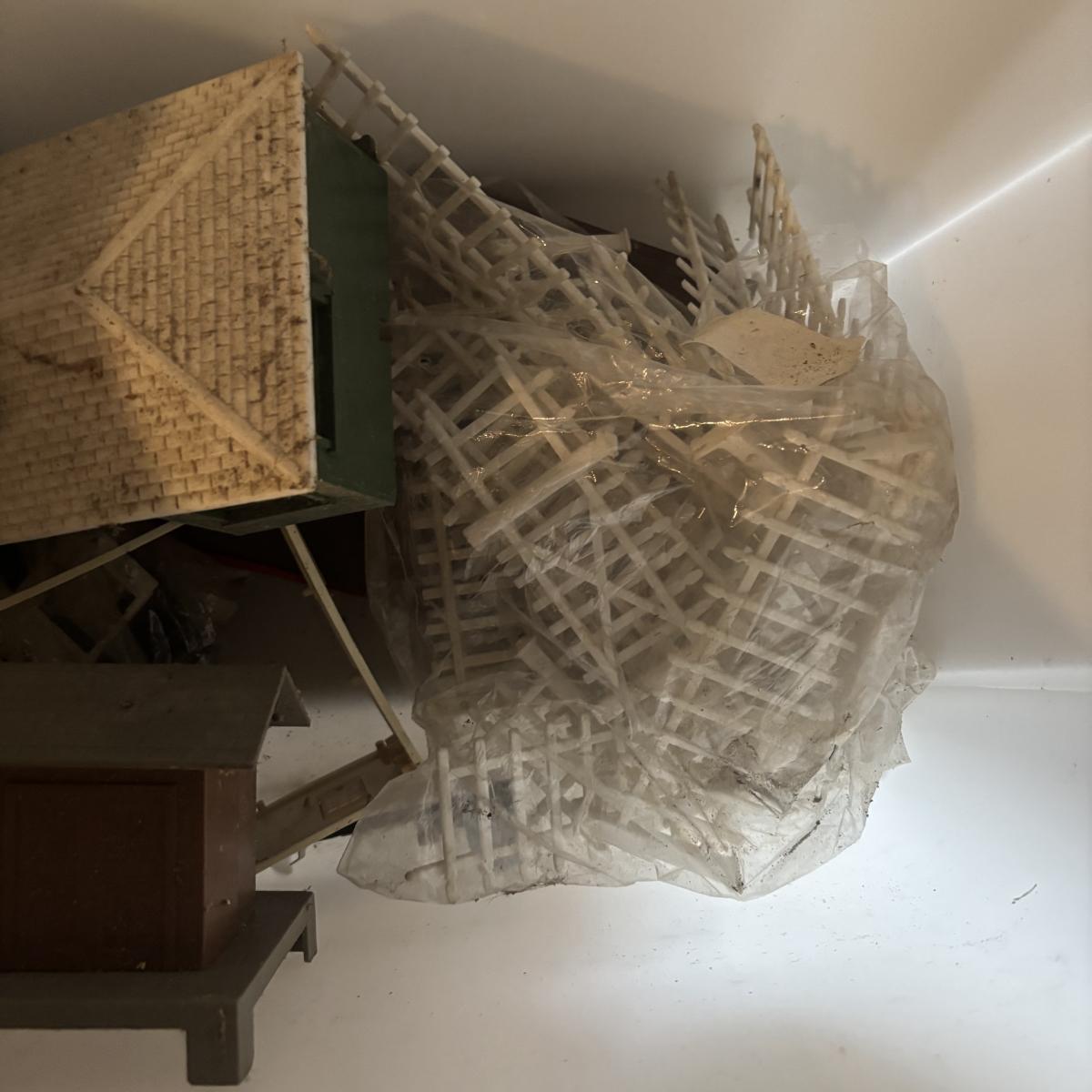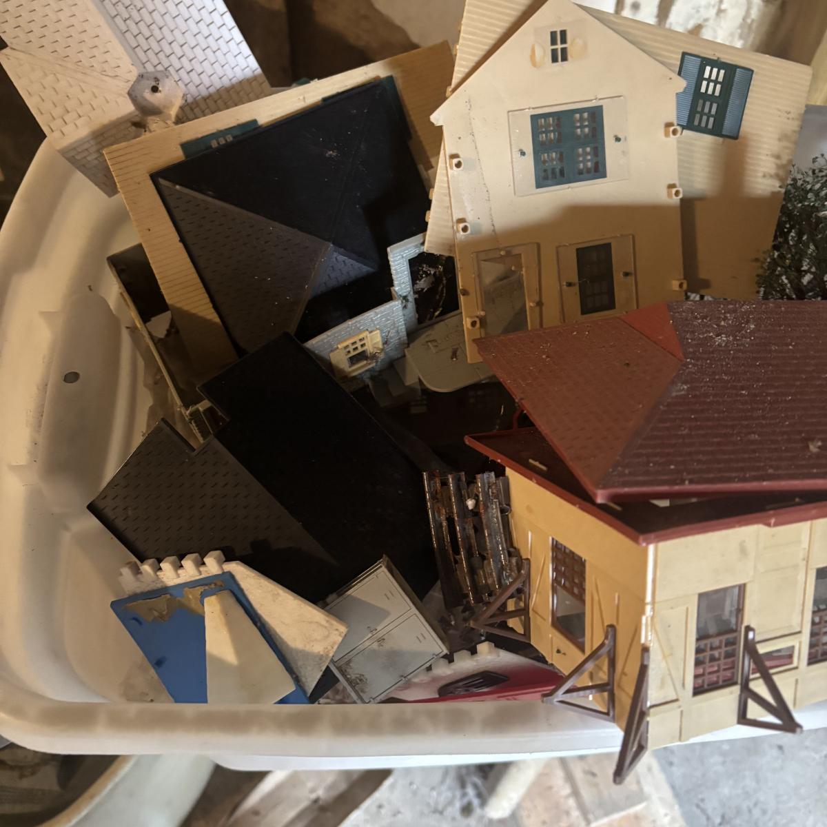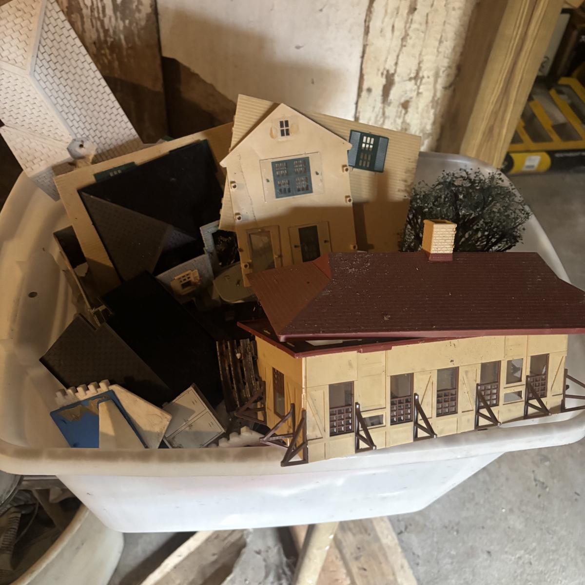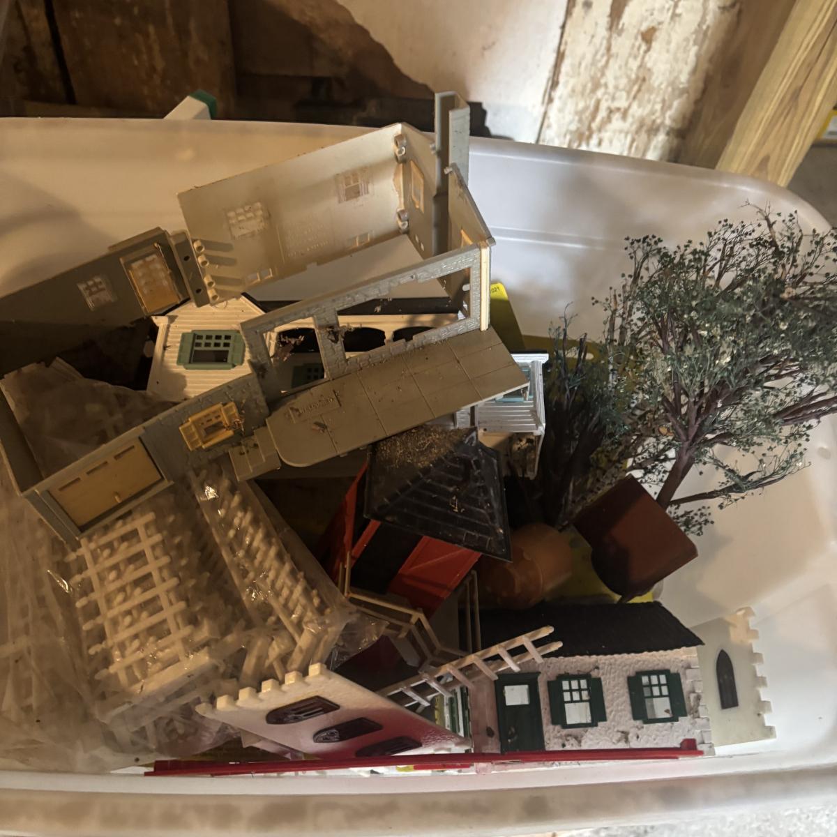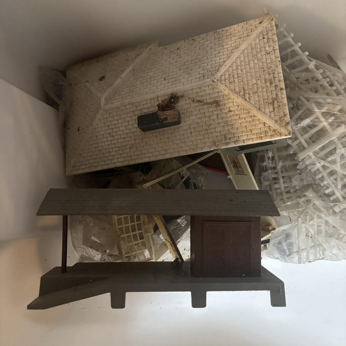 LOT 646: As Found Bin of Train Accessories: Houses, Fences etc.