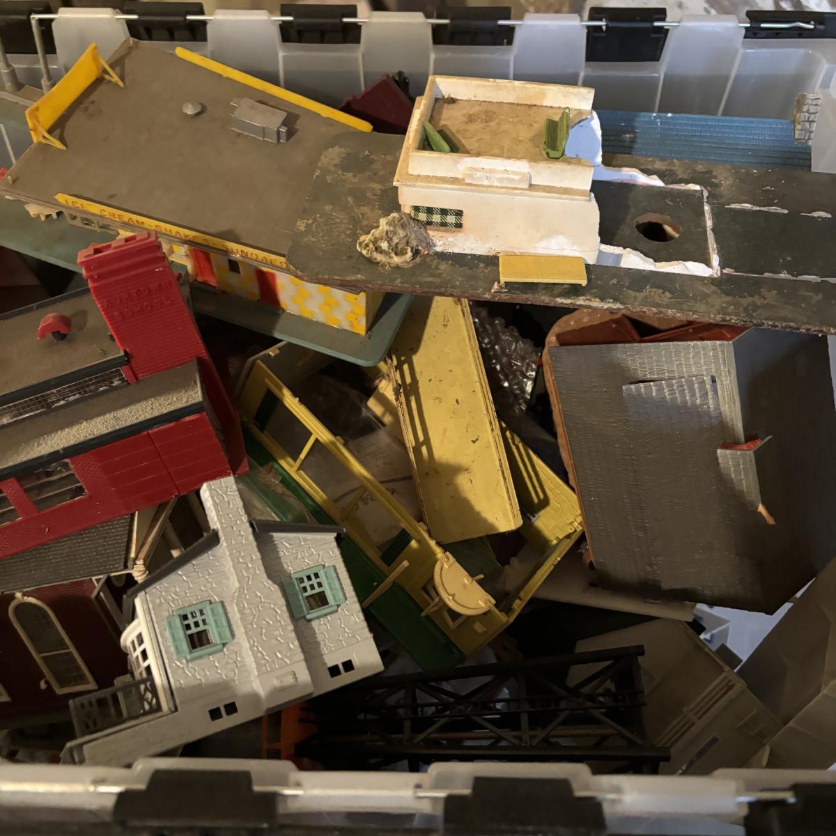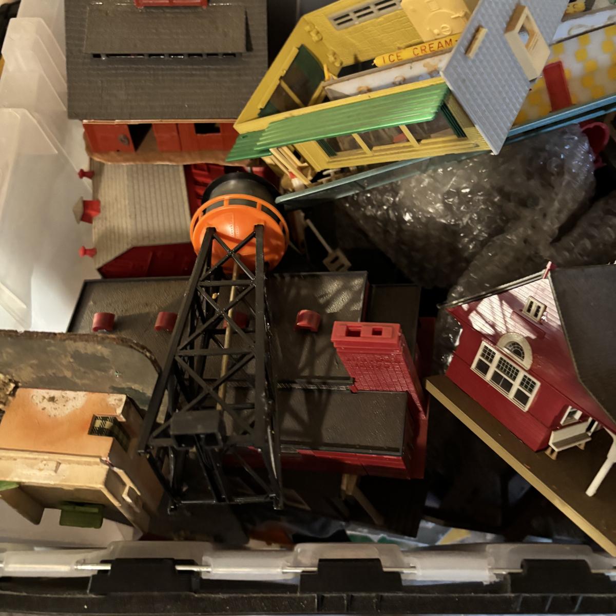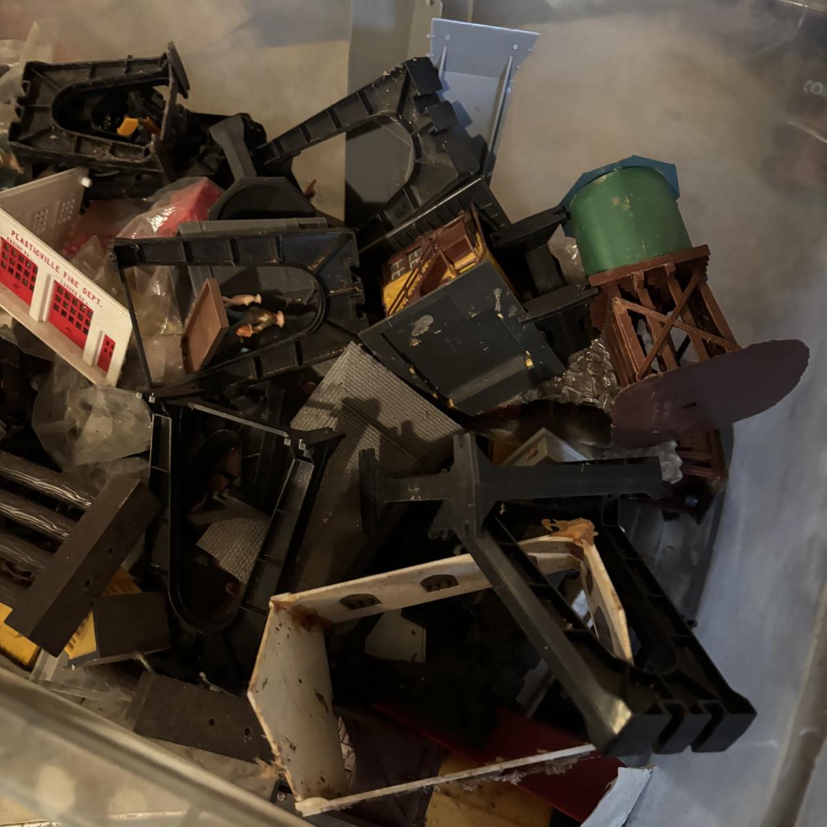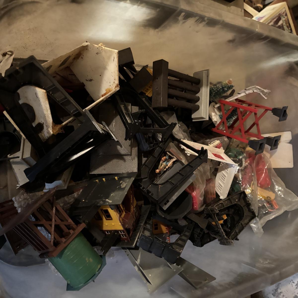 LOT 648: As Found Tote Full of Train Buildings/Accessories