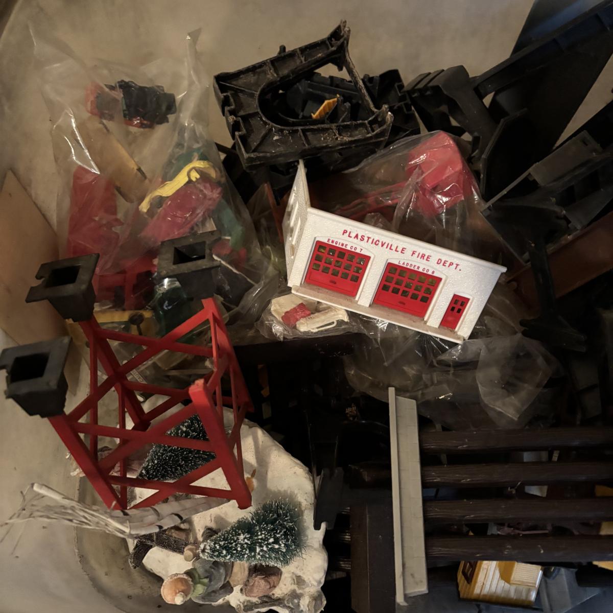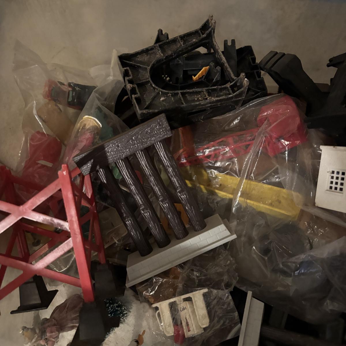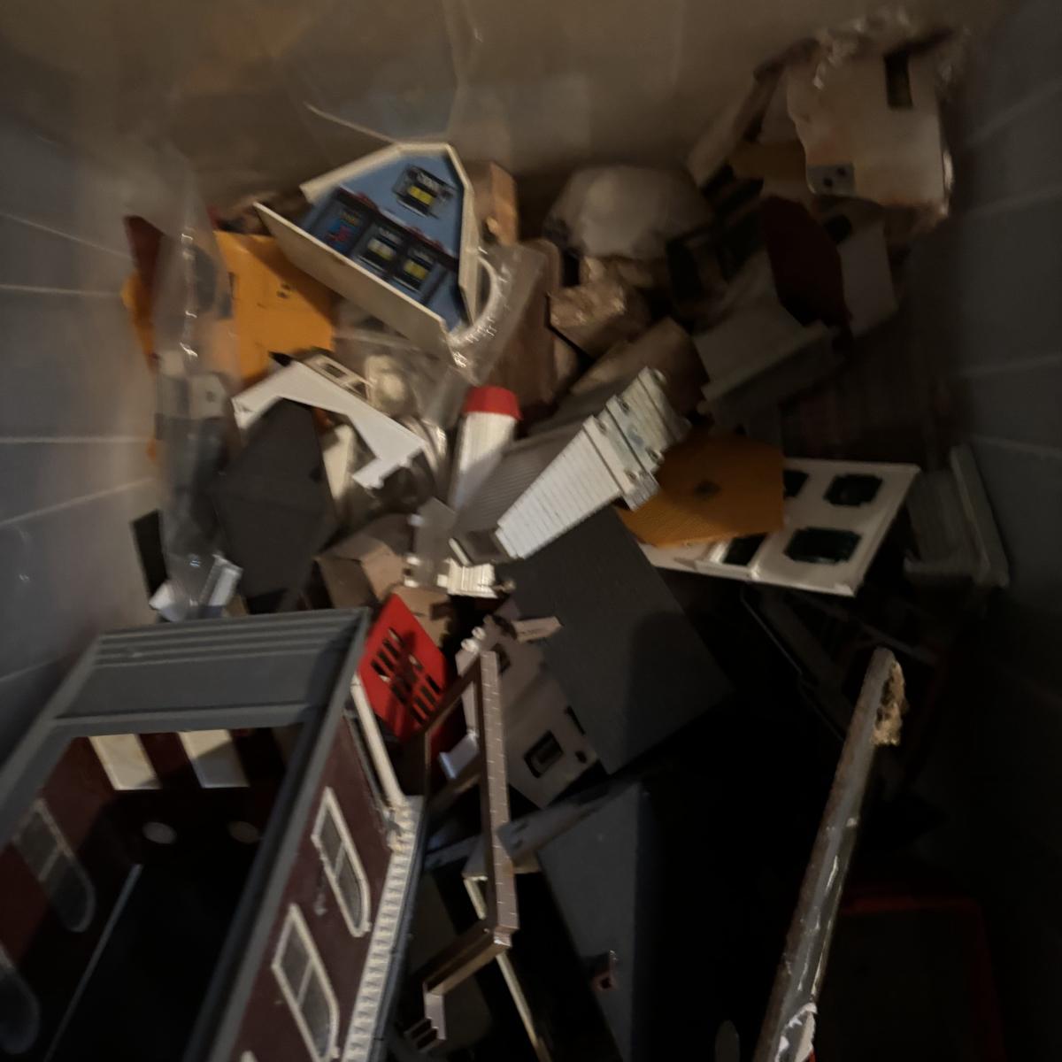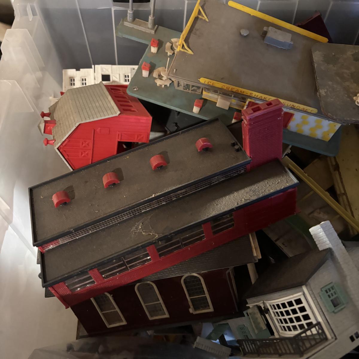 LOT 648: As Found Tote Full of Train Buildings/Accessories