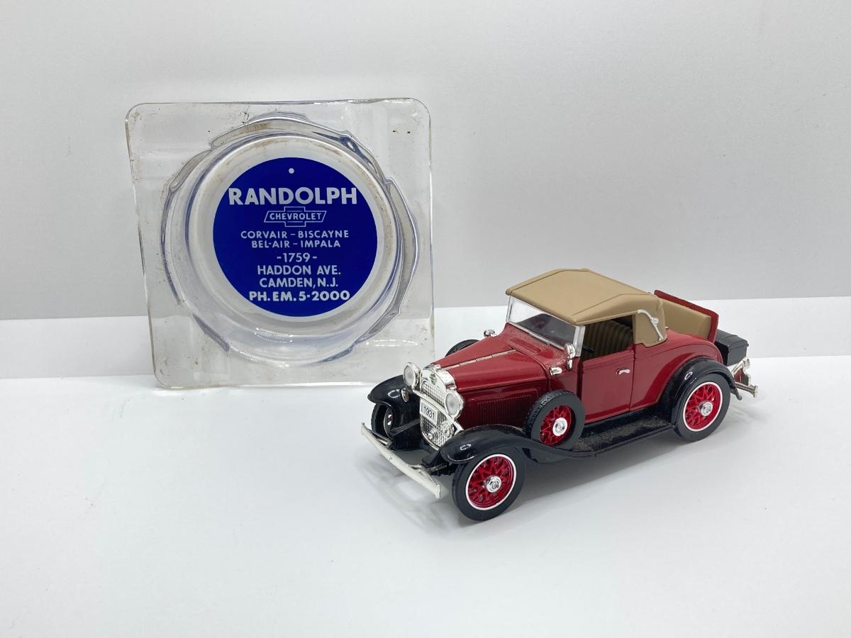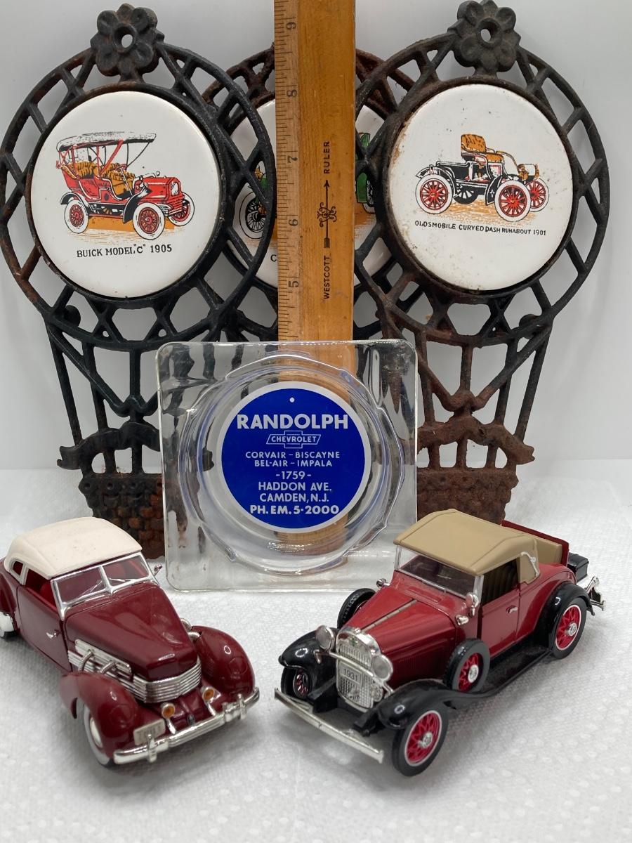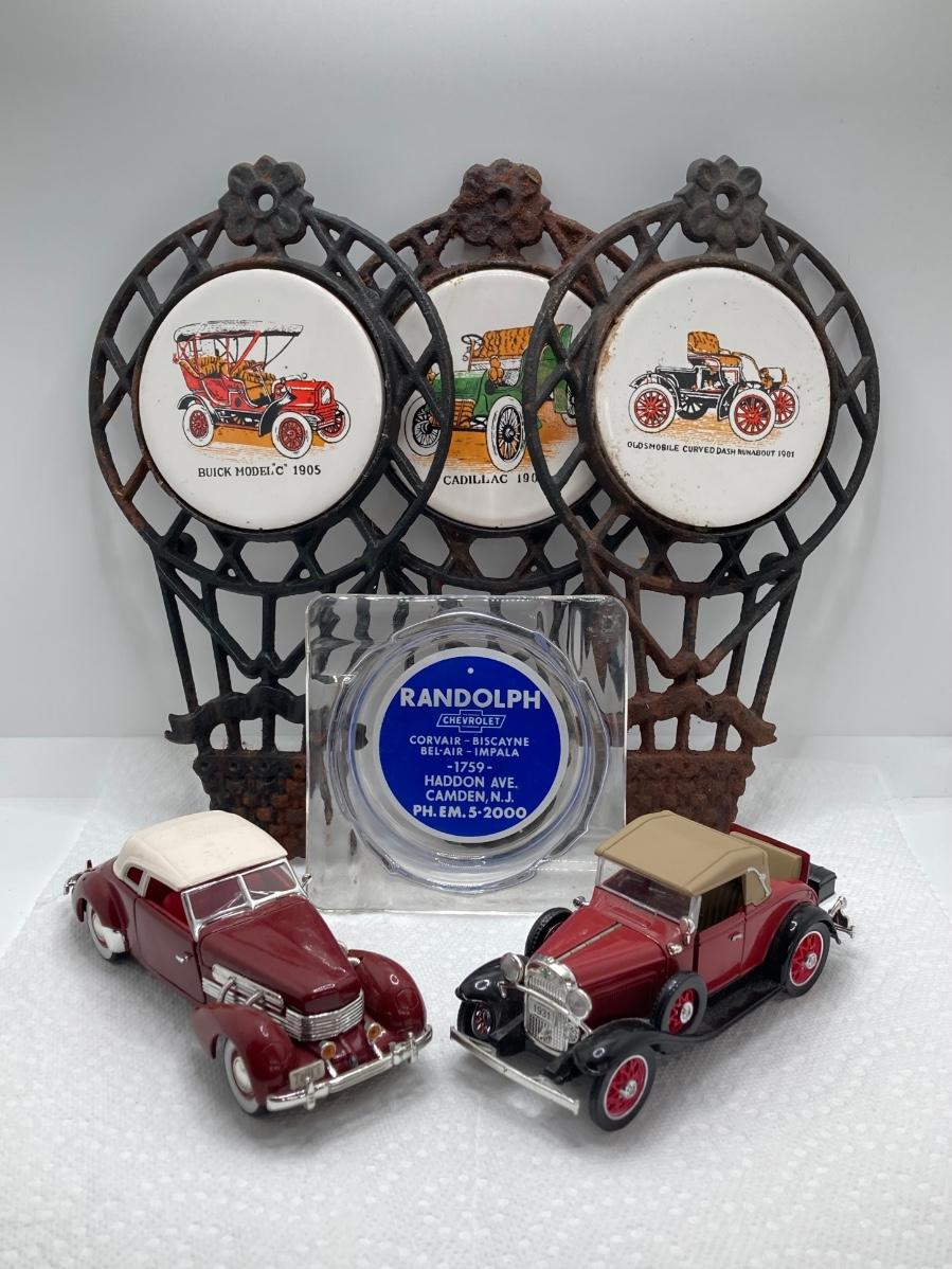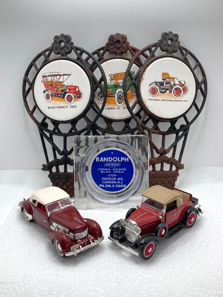 LOT 660: Vintage Automobile Collection - Die Cast Toy Cars (Chevrolet / Cord), Apco Japan Trivets and Randolph Chevrolet Ashtray