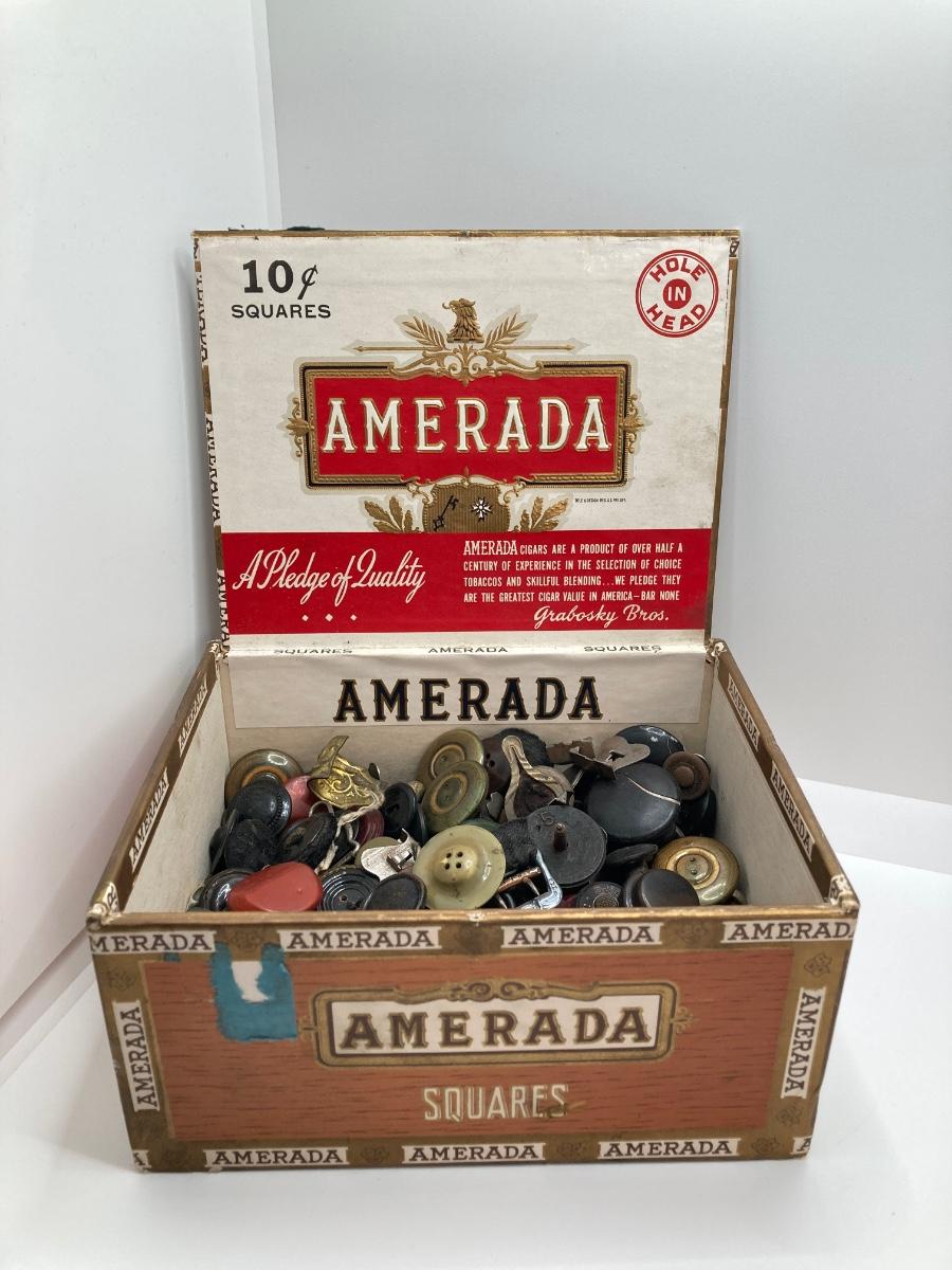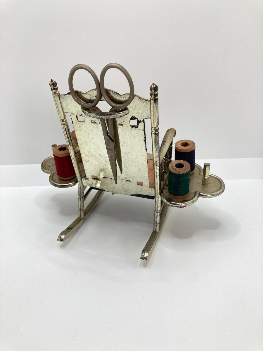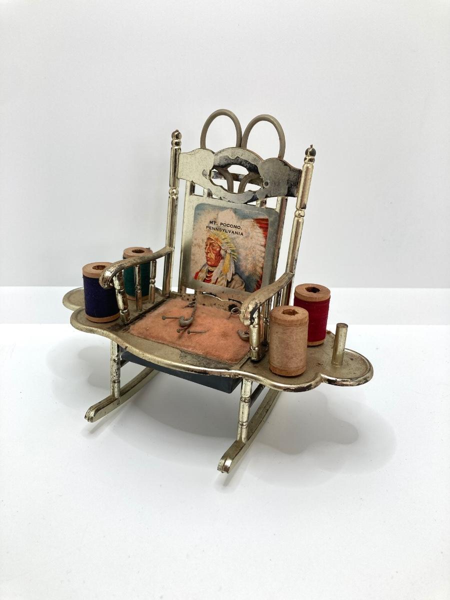 LOT 664: Antique / Vintage Sewing Collection - Mt. Pocono PA Chair / Pin Cushion Thread Holder, Buttons, Tins, Buckles and More