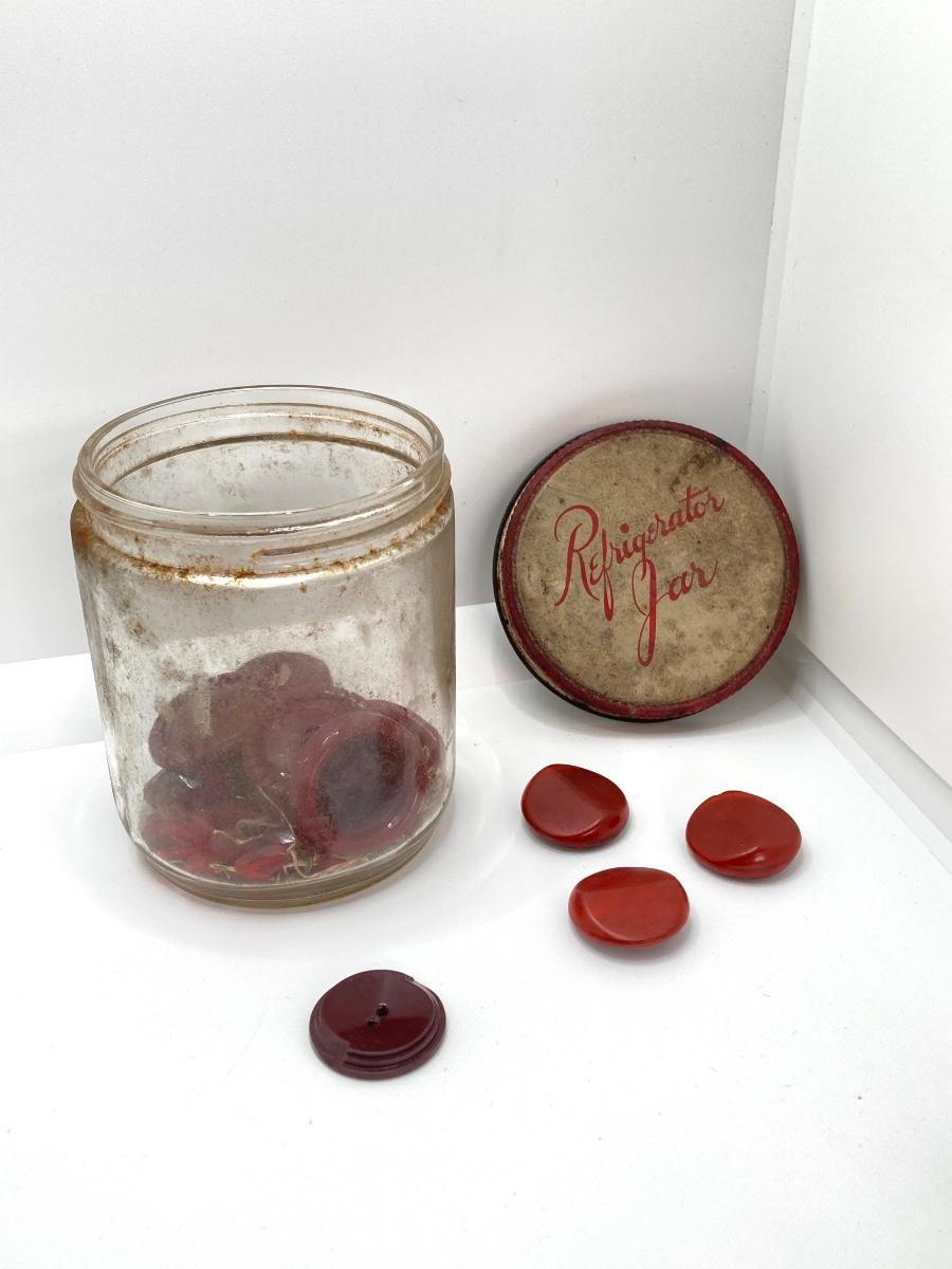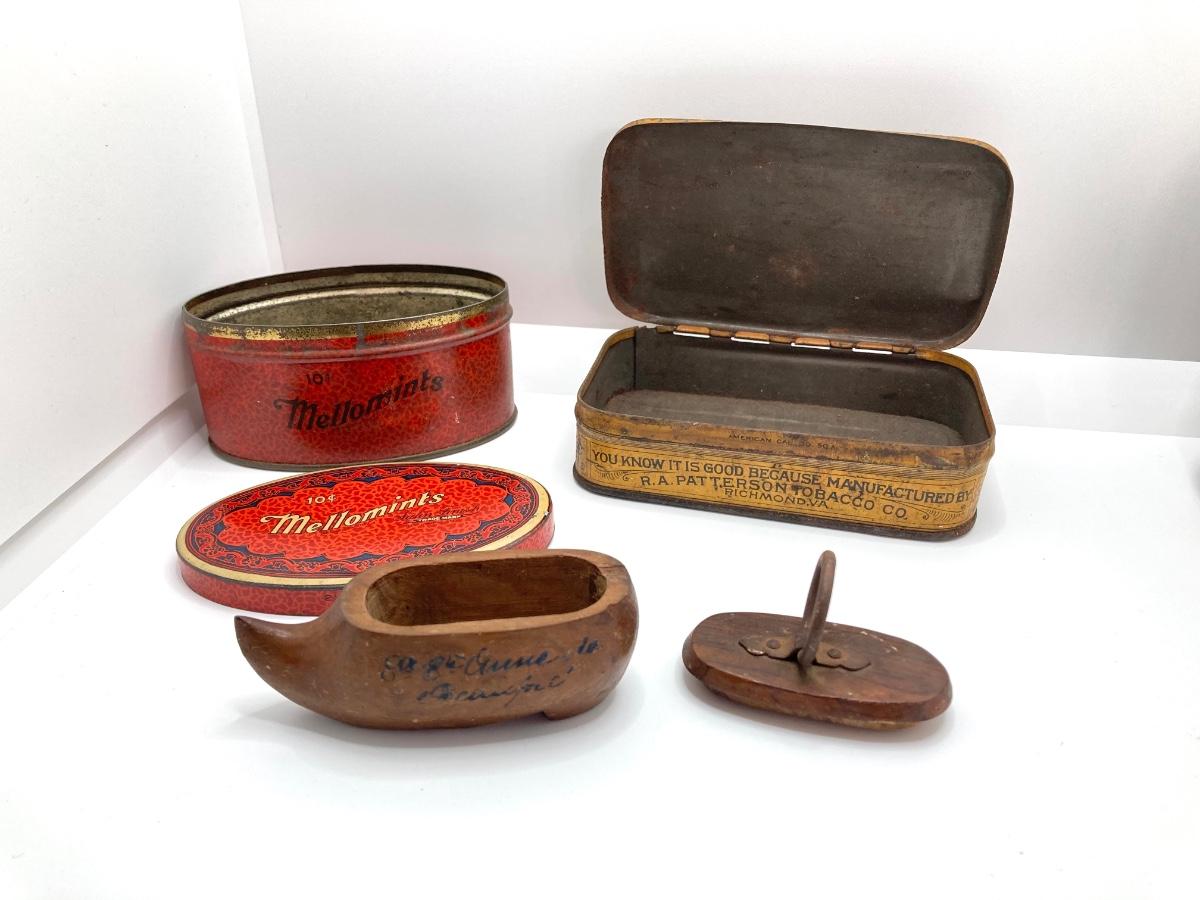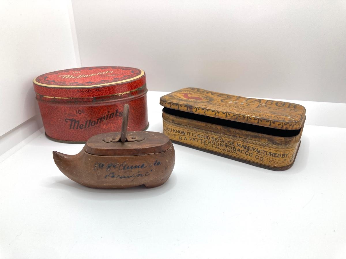LOT 664: Antique / Vintage Sewing Collection - Mt. Pocono PA Chair / Pin Cushion Thread Holder, Buttons, Tins, Buckles and More