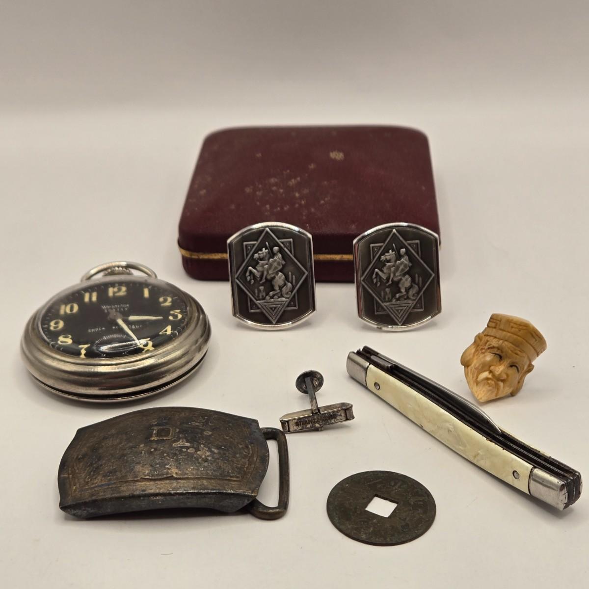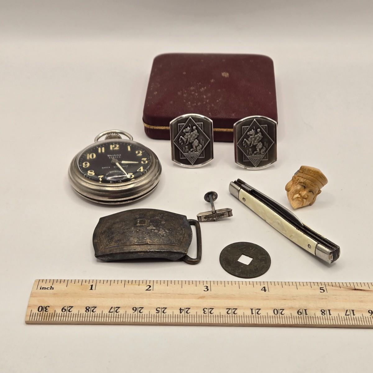 LOT 701: Pocket Watch, Pocket Knife, Tie Tacks, Japanese Coin, Belt Buckle,& Vintage Swank Cufflinks