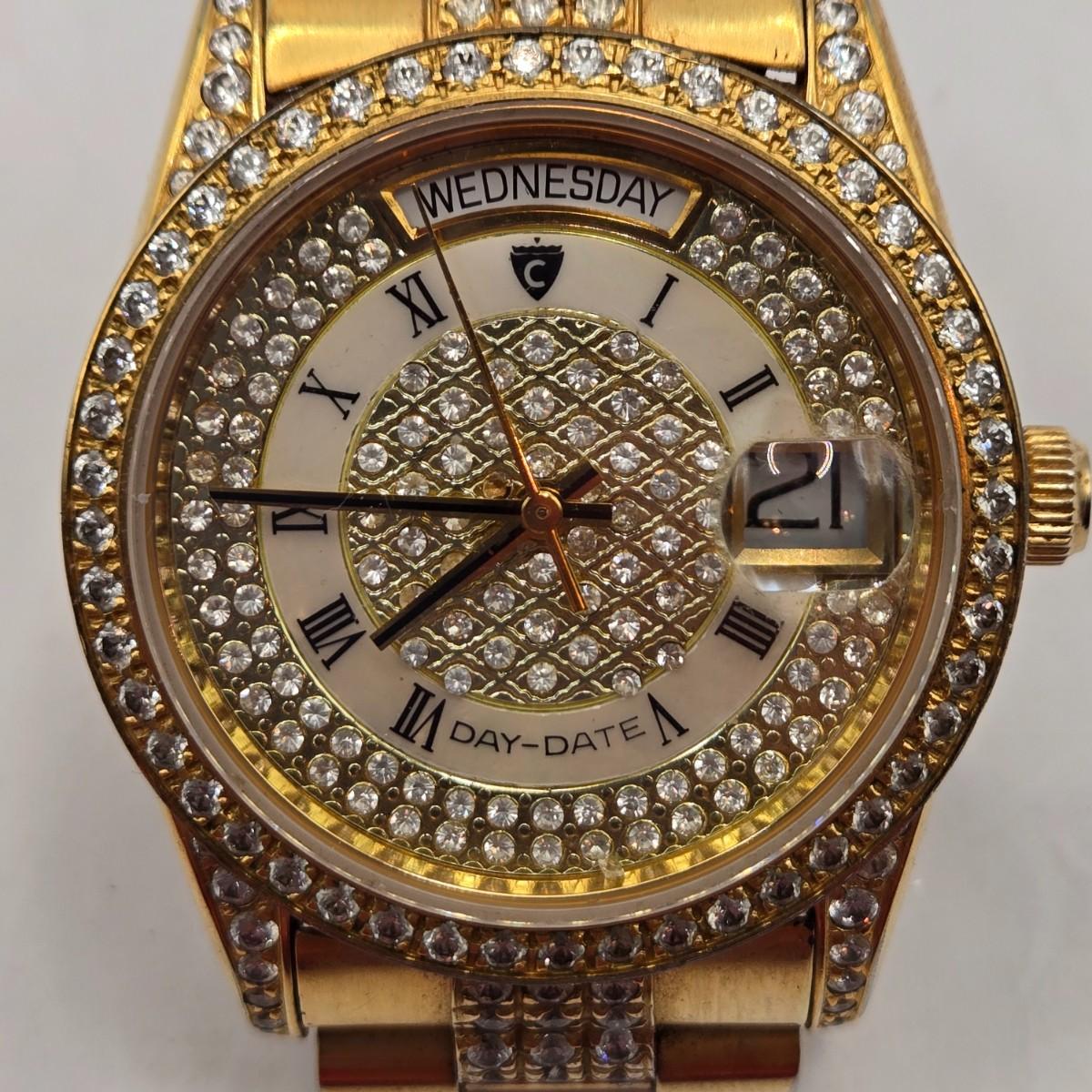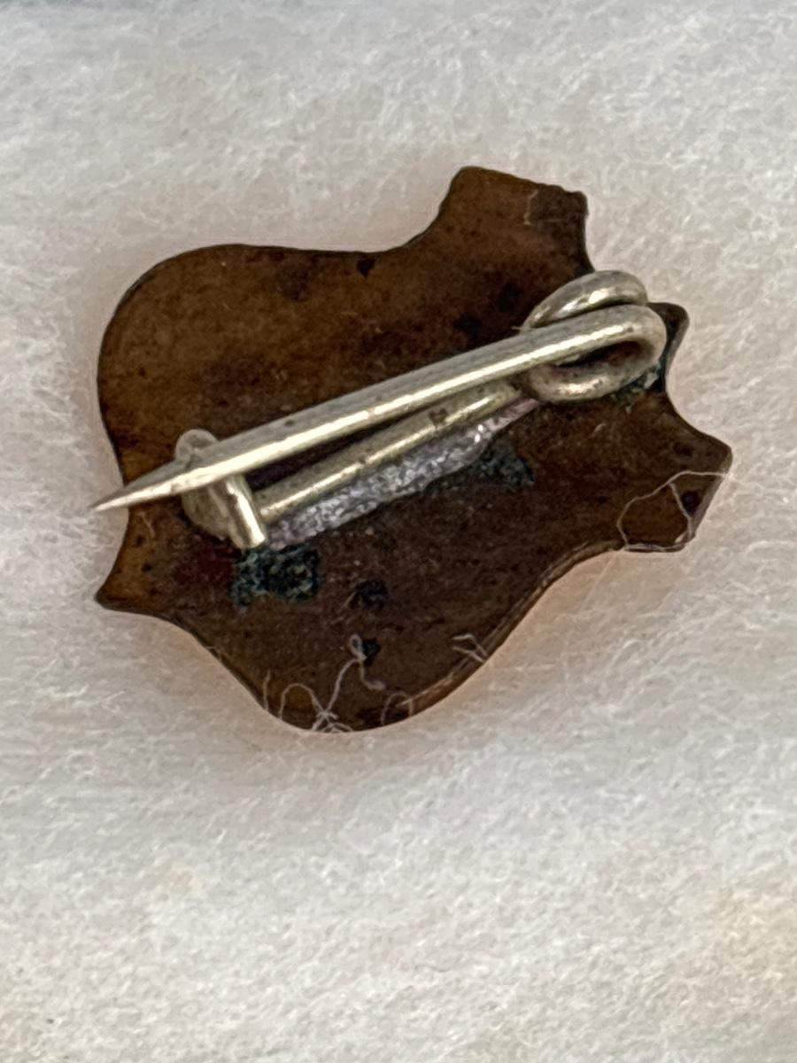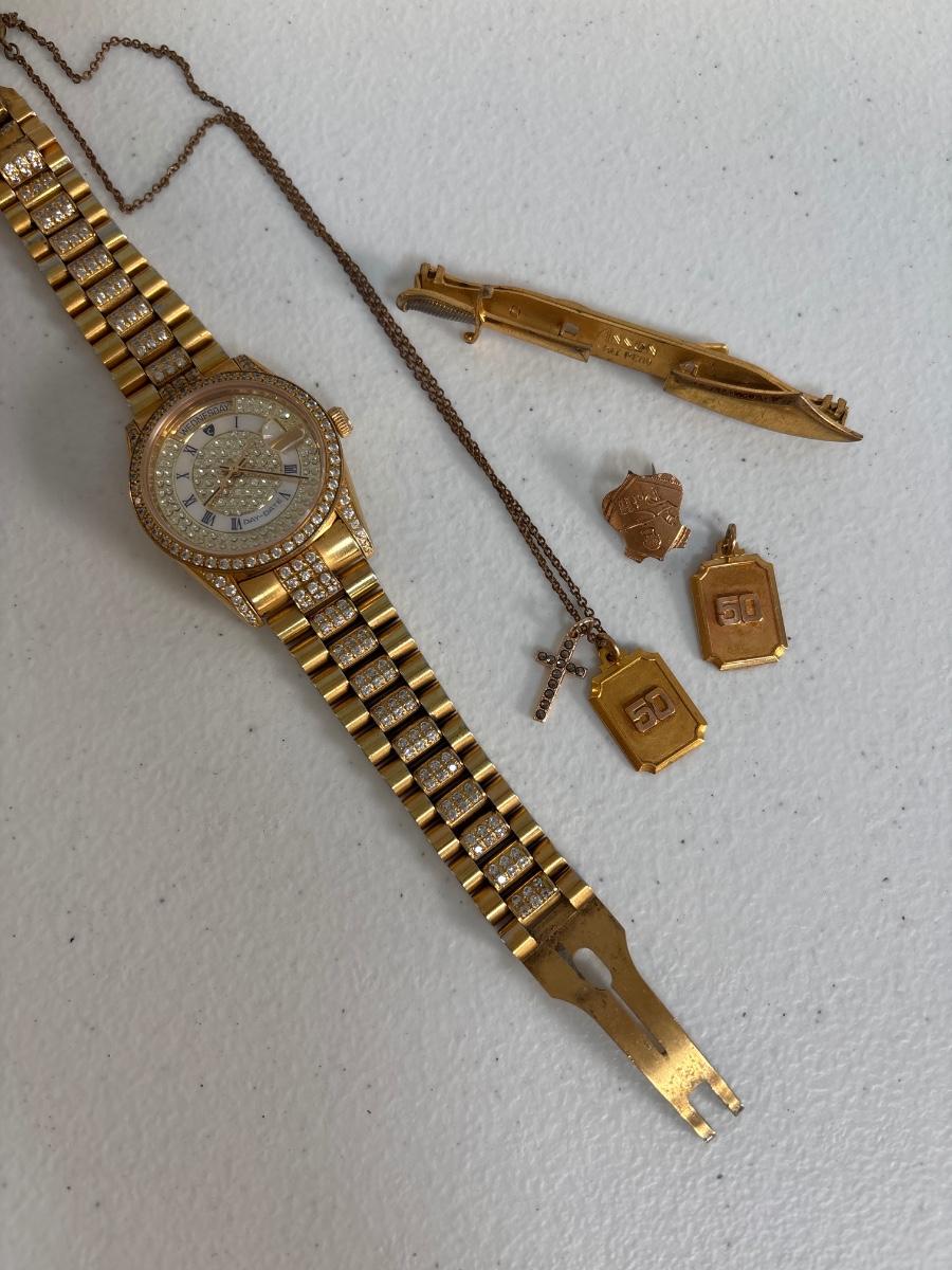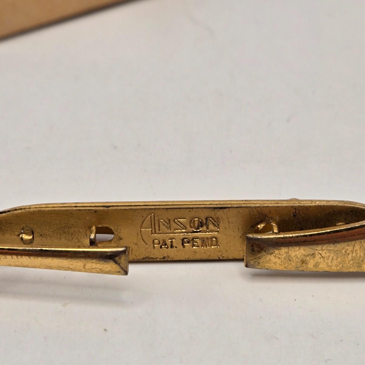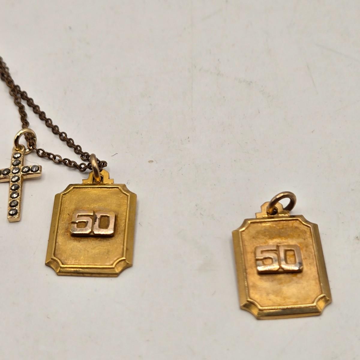 LOT: 702: Gold Tone Croton Watch, Anson Pt. Pending Tie Bar, Chain with Cross Charm, Two Gold Tone "50" Charms, & "Patrons of Husbandry" Lapel Pin