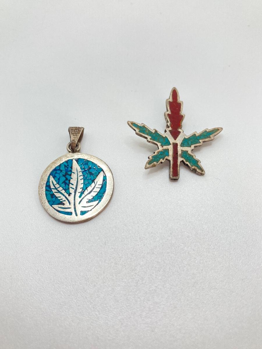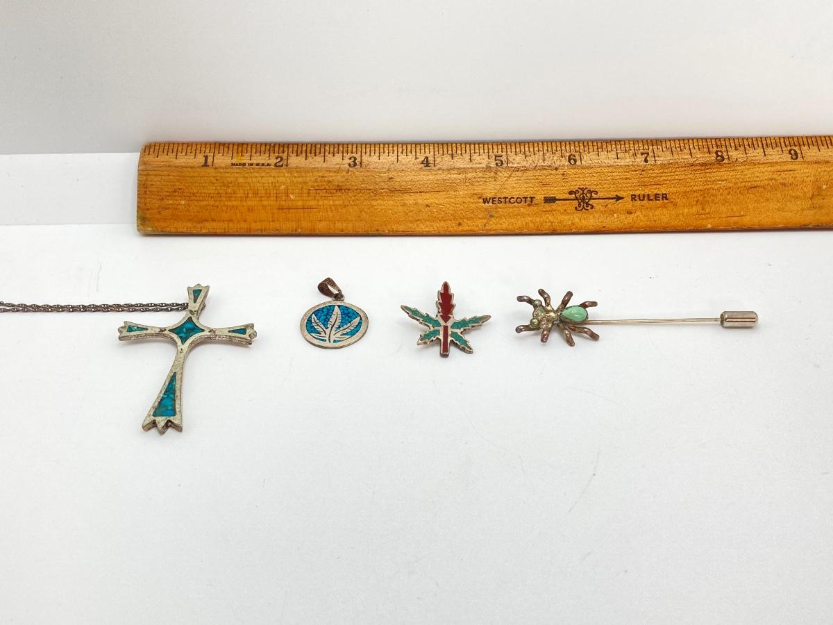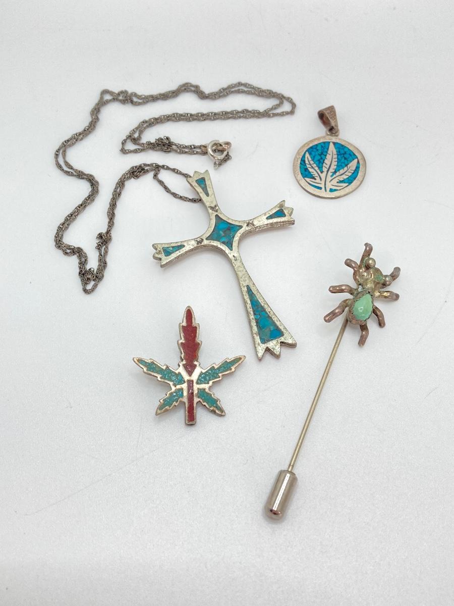LOT 710: Turquoise and Unmarked Silver Tone Hand Crafted Jewelry - Cross, Marijuana Leaf Pendants and Spider Stick Pin