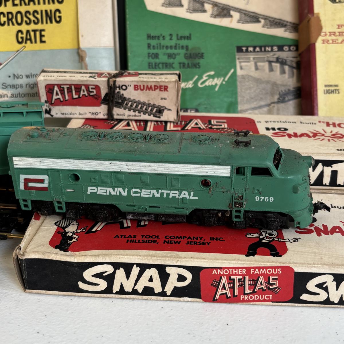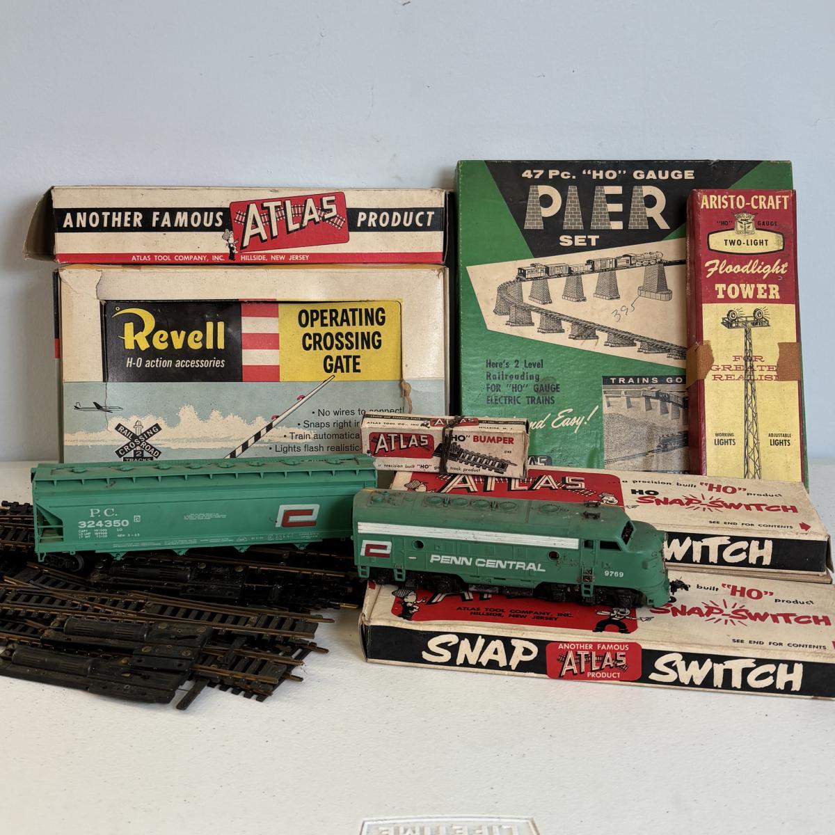 LOT 726: Vintage Train Accessories: Atlas HO Scale Track, Atlas Set, Revell HO Accessories & Aristo-Craft along with a Tyco Penn Line Locomotive 9769 P.C. Car 324350
