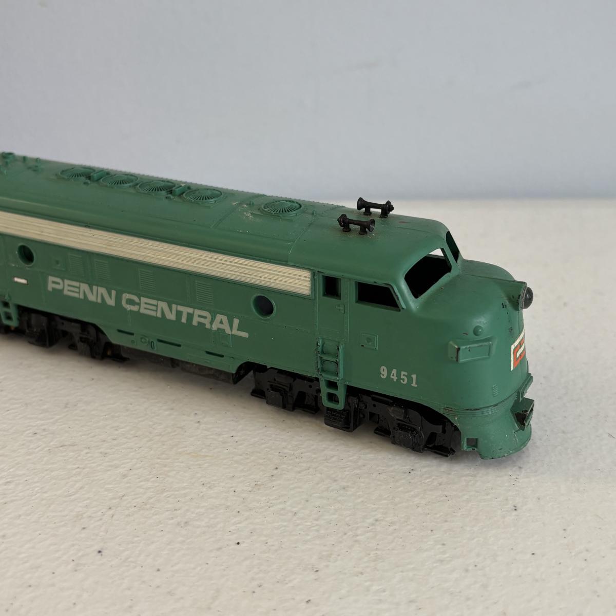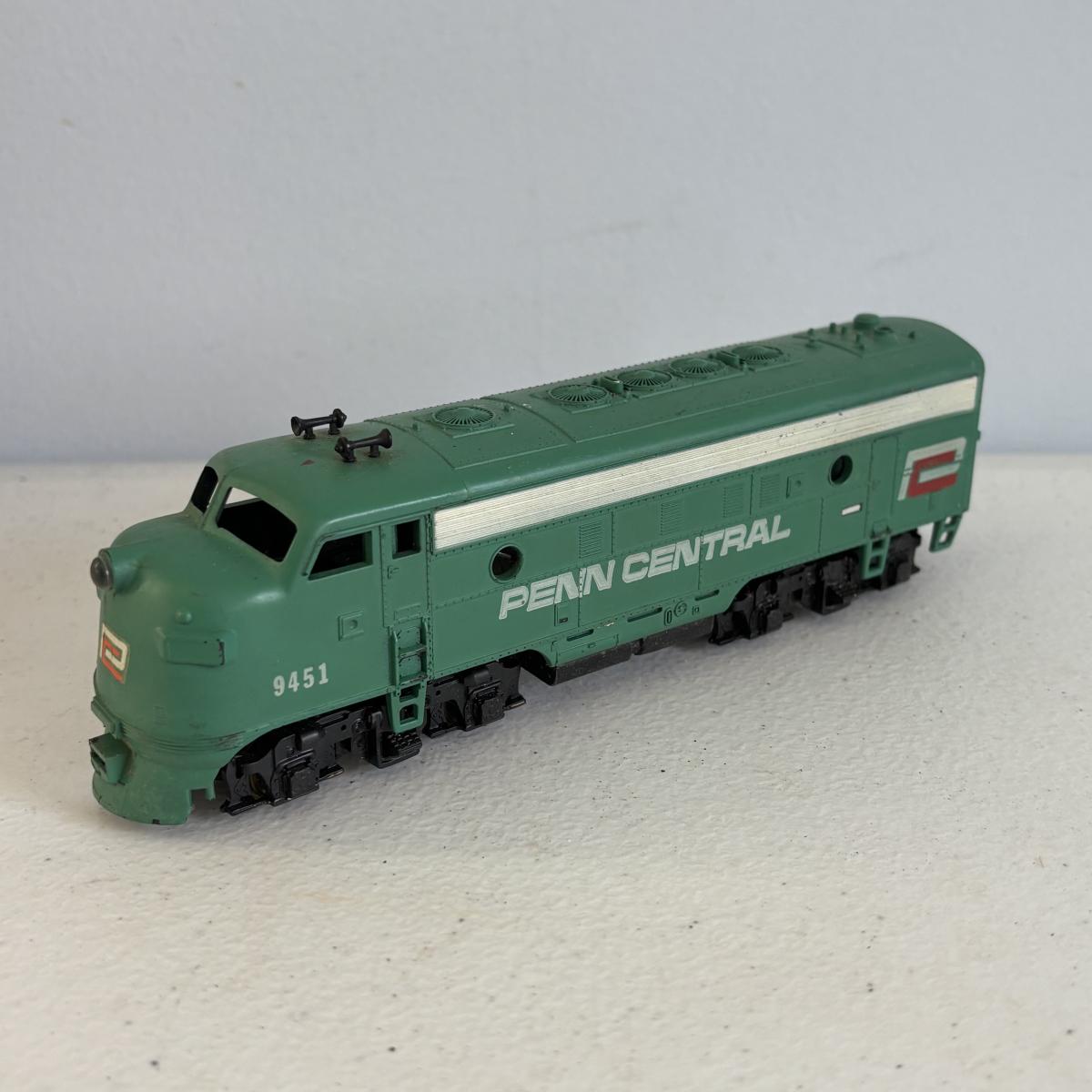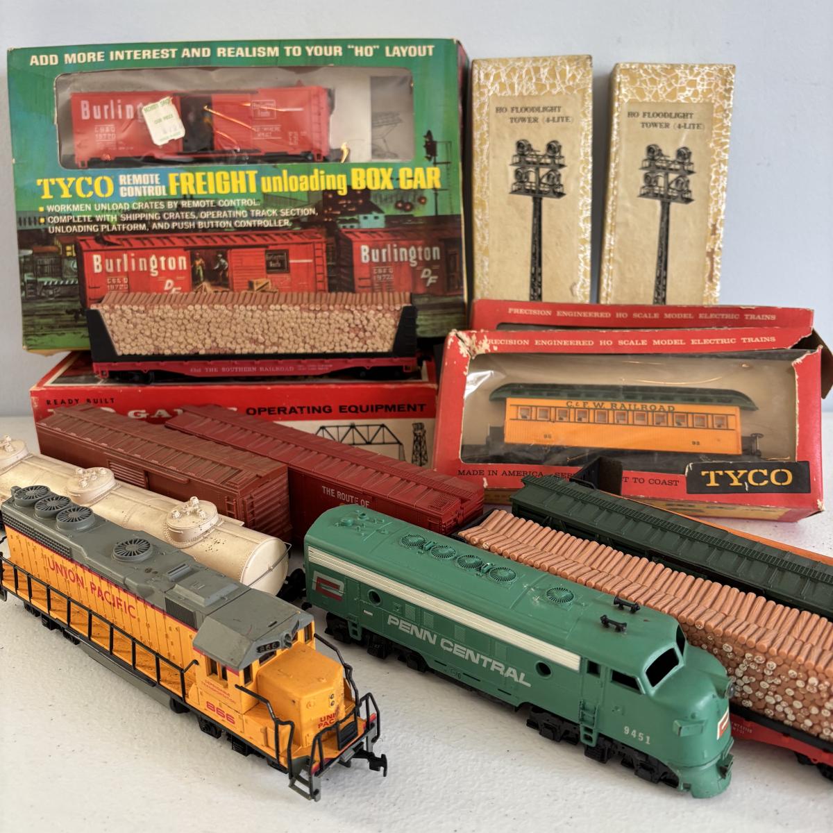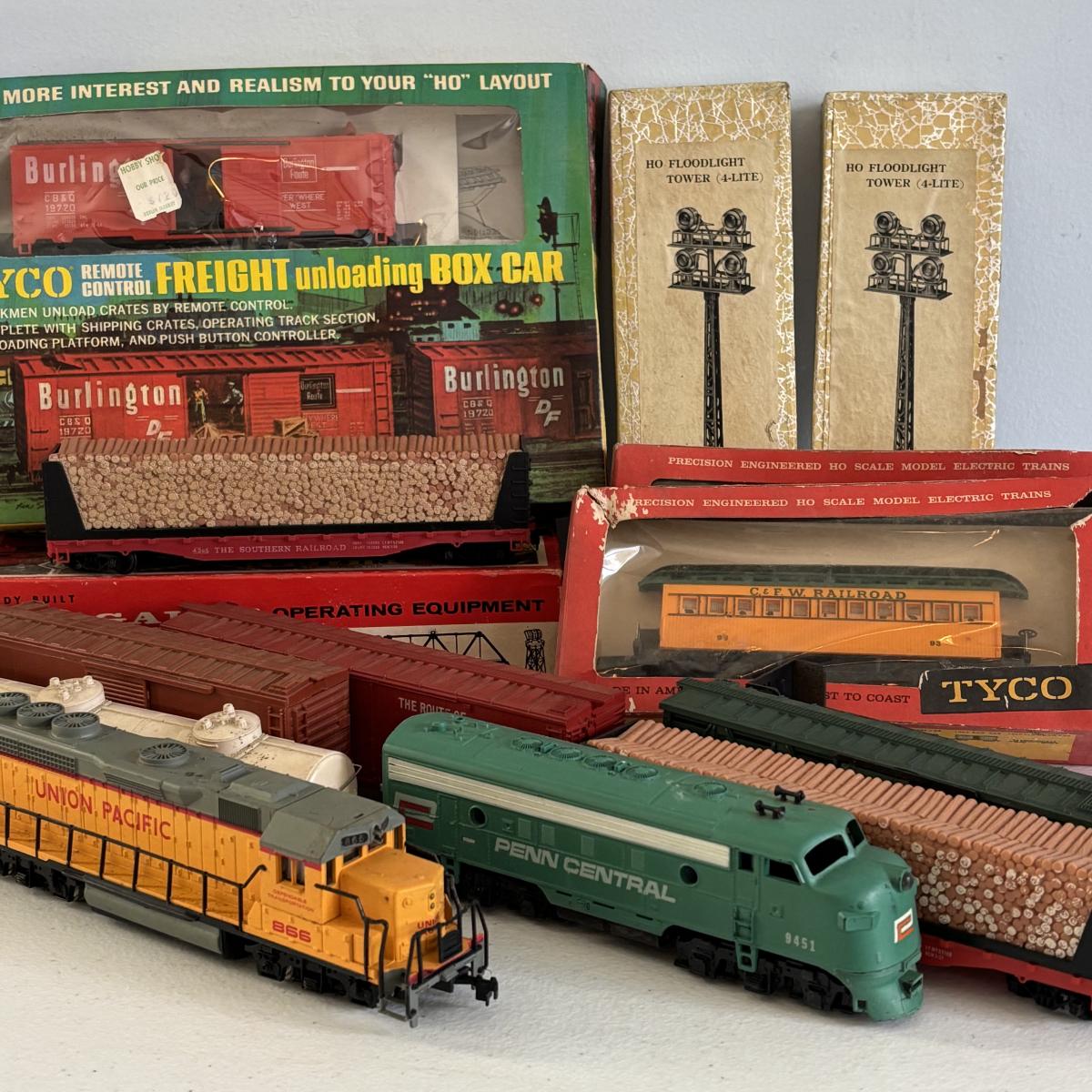 LOT 727: Tyco Car HO Scale Cars, HO Flood Light Towers. Bachman HO Union Pacific 866 Locomotive, Bachman HO Penn Central 9451, Ideal Model Crossing Gate & More