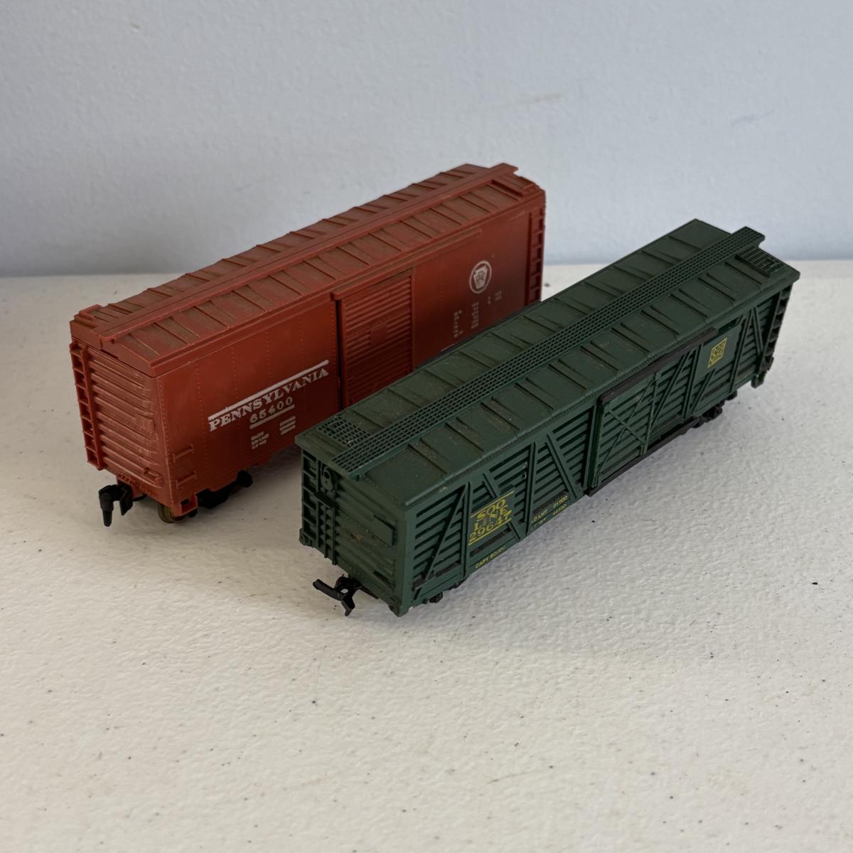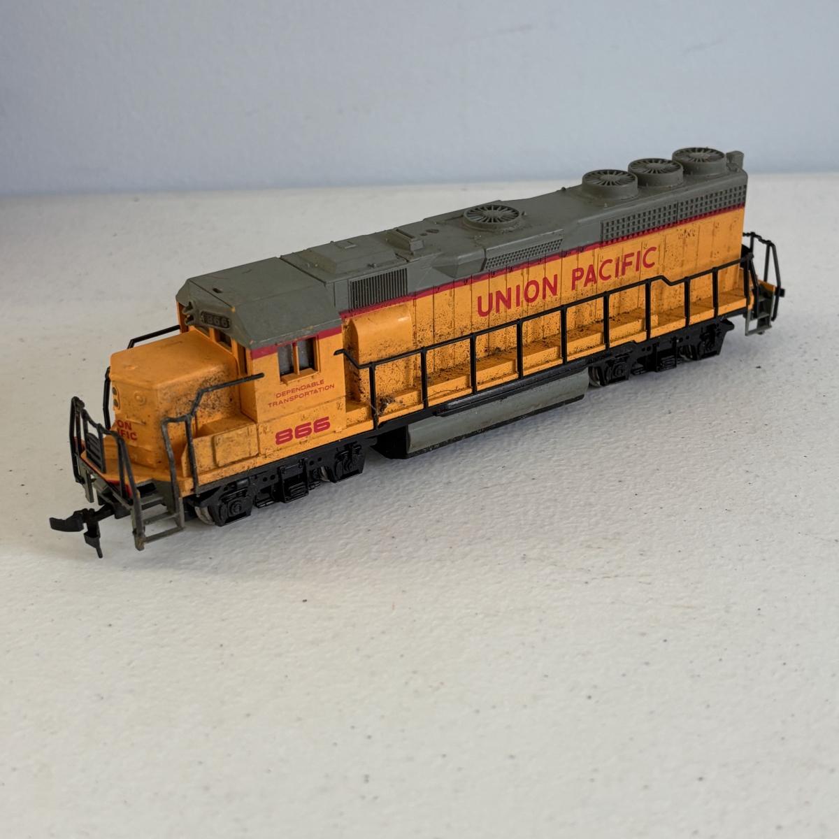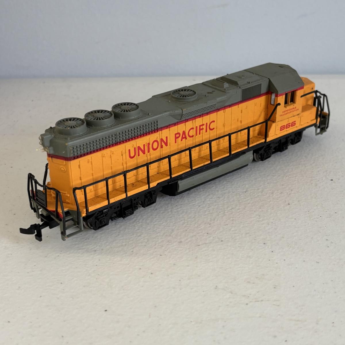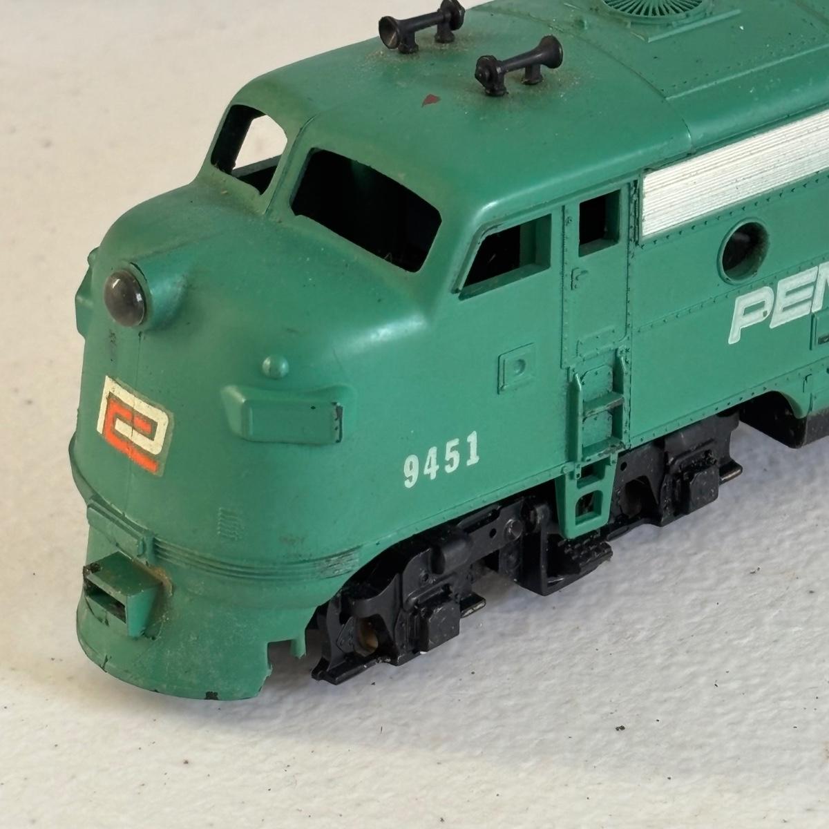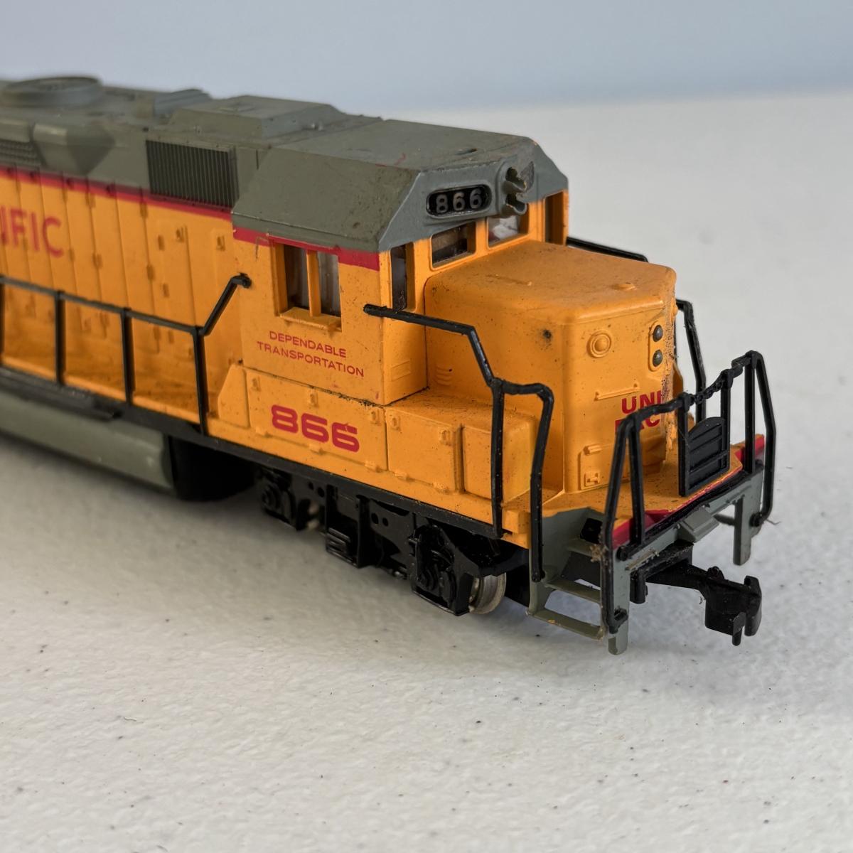 LOT 727: Tyco Car HO Scale Cars, HO Flood Light Towers. Bachman HO Union Pacific 866 Locomotive, Bachman HO Penn Central 9451, Ideal Model Crossing Gate & More