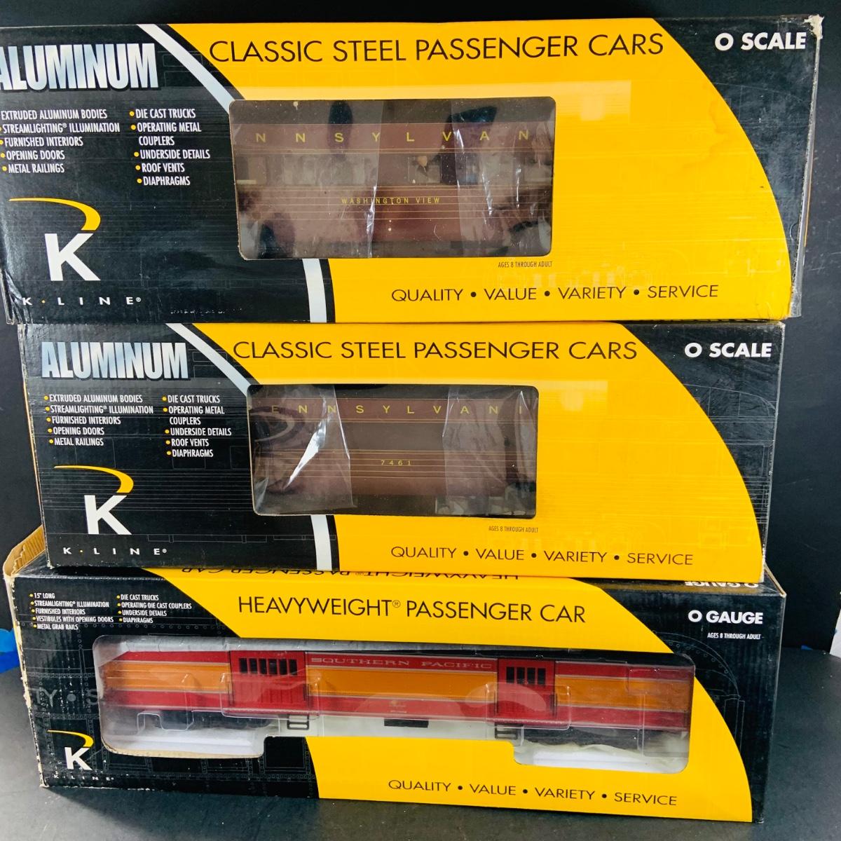 LOT 737: K-Line O Scale Passenger Cars In Boxes Including Aluminum Pennsylvania Baggage 7461, and Washington View Observation Car K 4680-1004 and Southern Pacific Baggage Car