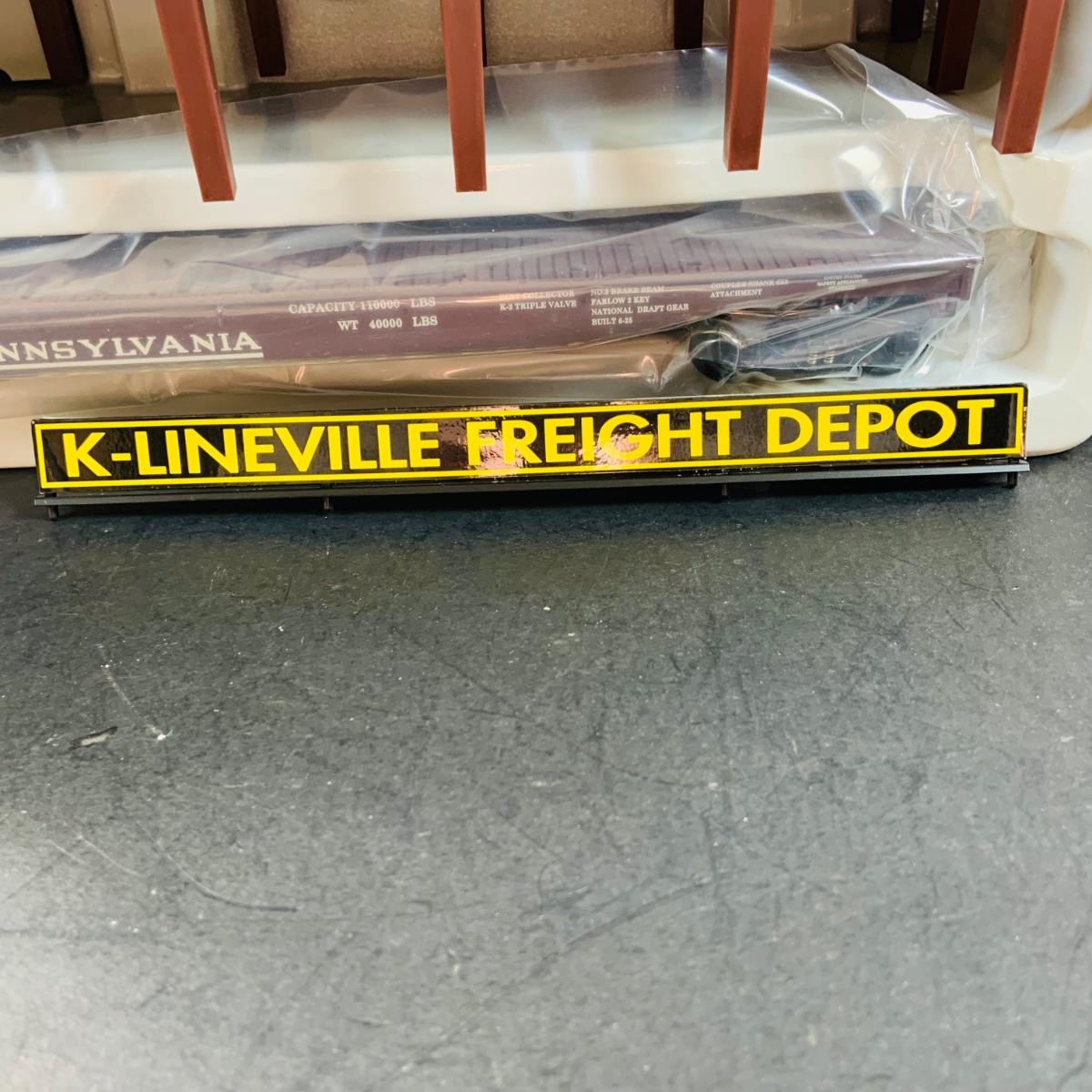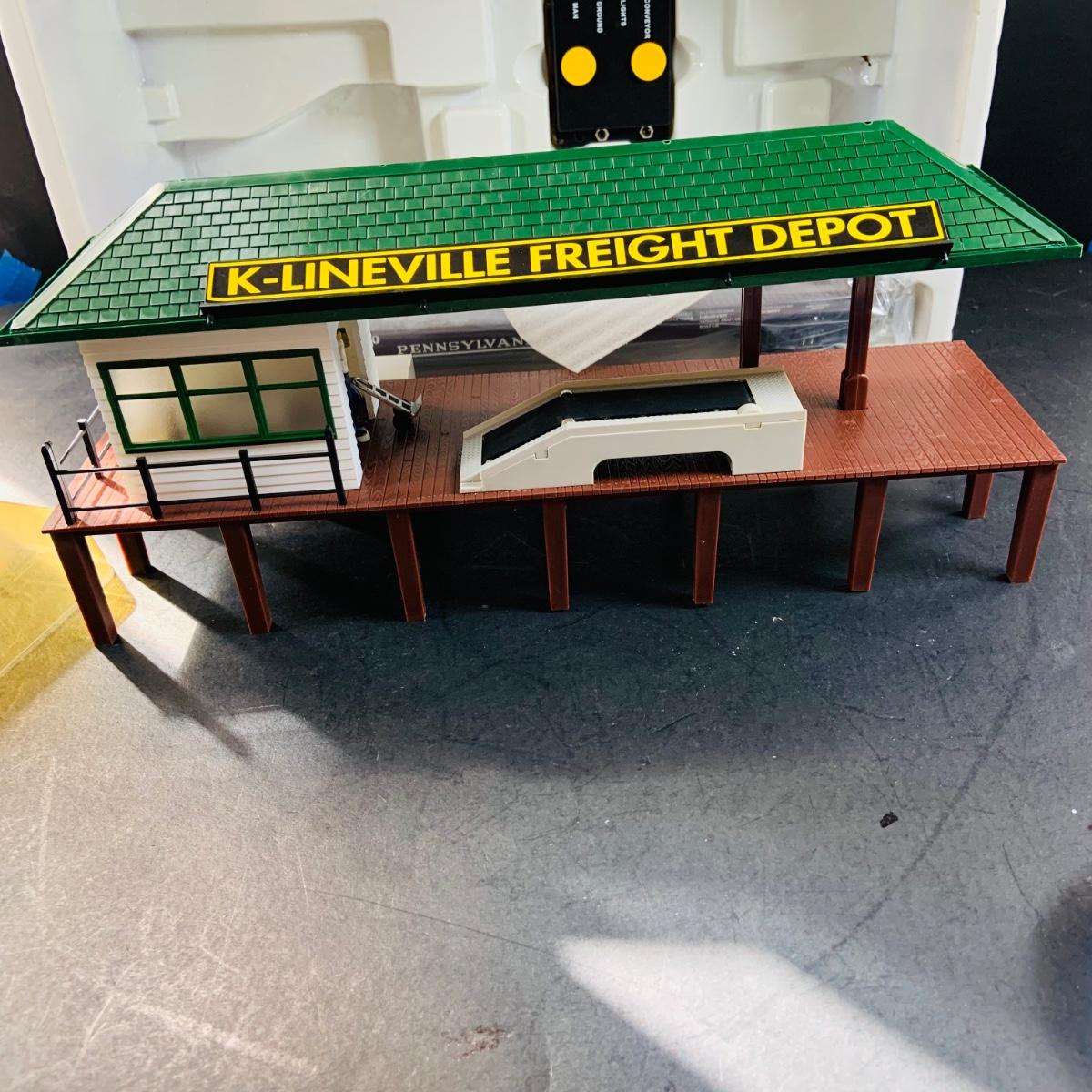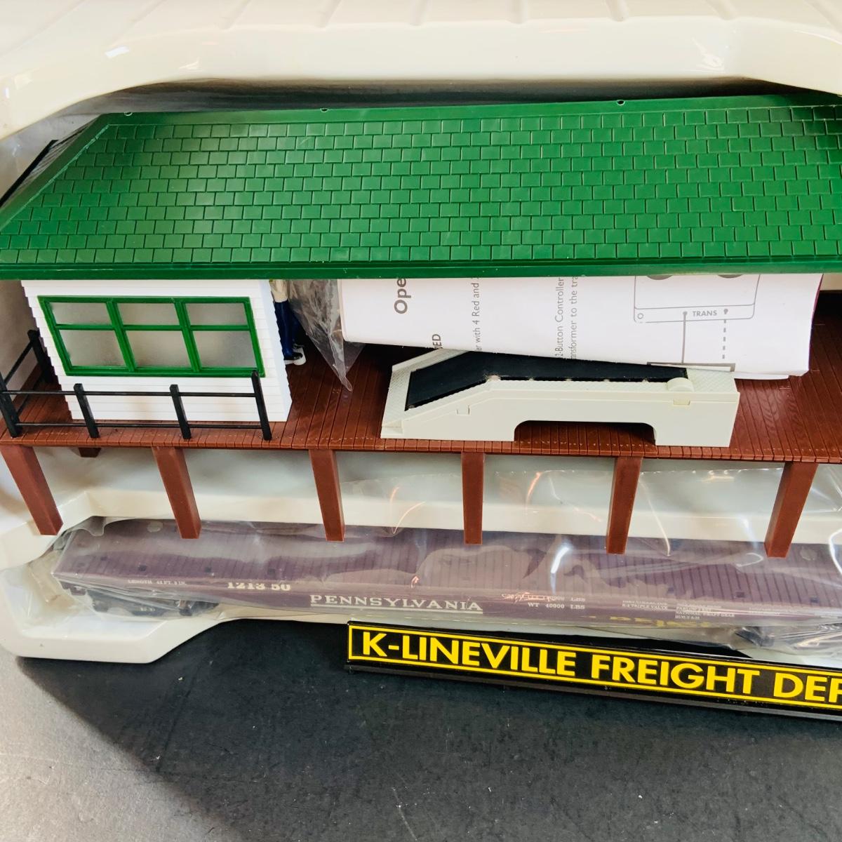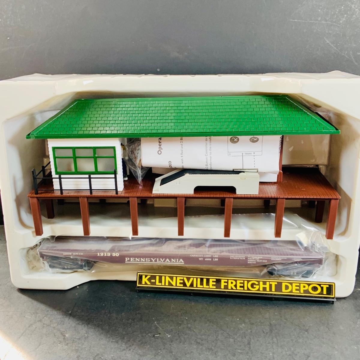 LOT 738: K-Line Action Accessory - K-Lineville Freight Depot Operating Loading Platform with Freight Car