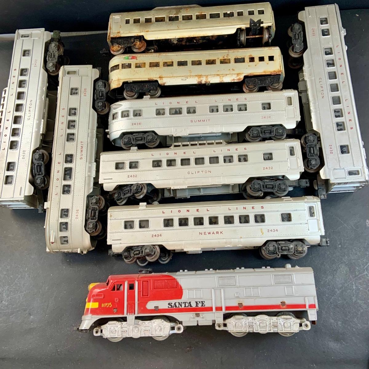 LOT 741: Large Assortment of Lionel and Marx O/24 Gage Lionel Line Passinger Cars and Santa Fe Diesel Engine