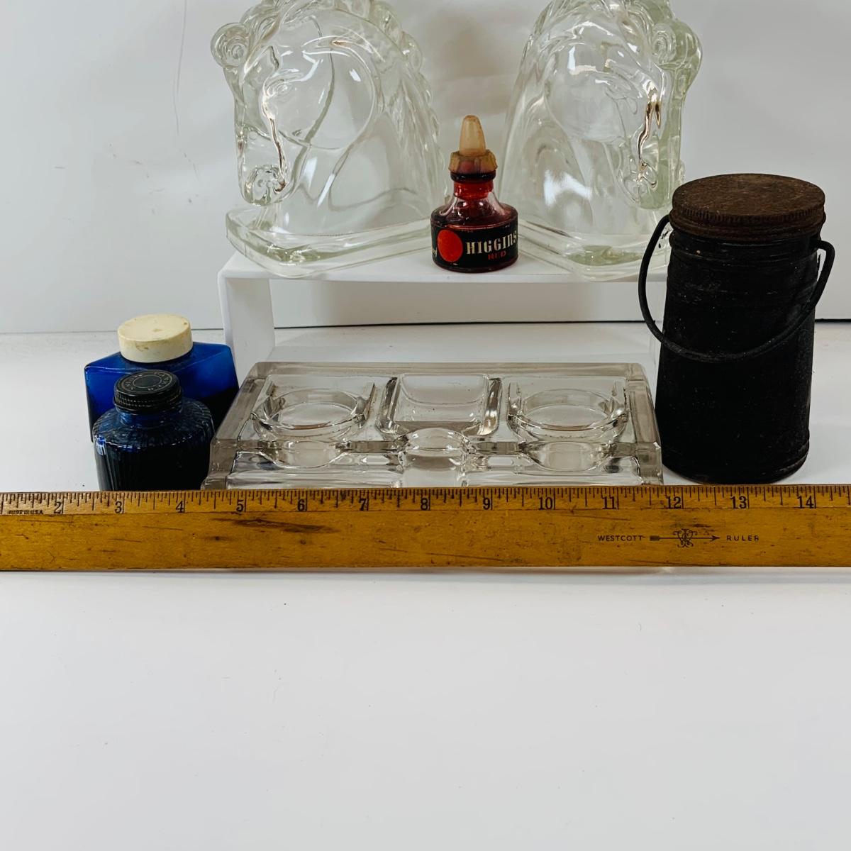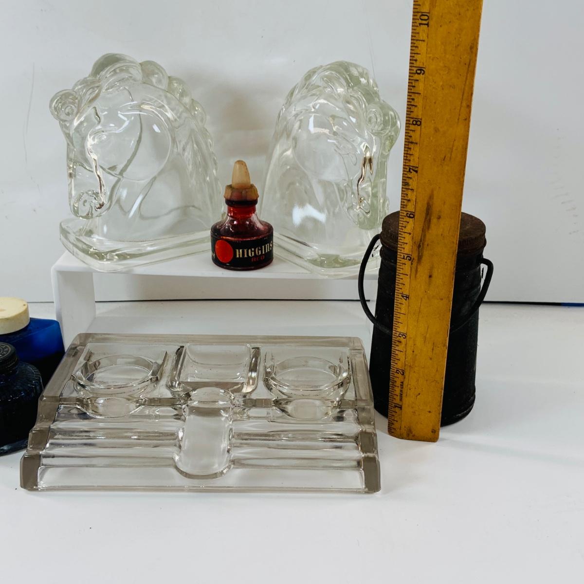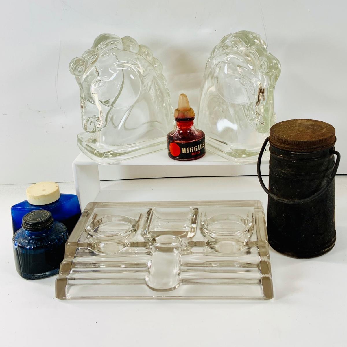 LOT 516: Vintage/Antique Glass Inkwell and Horse Head Book Ends, Ink an More