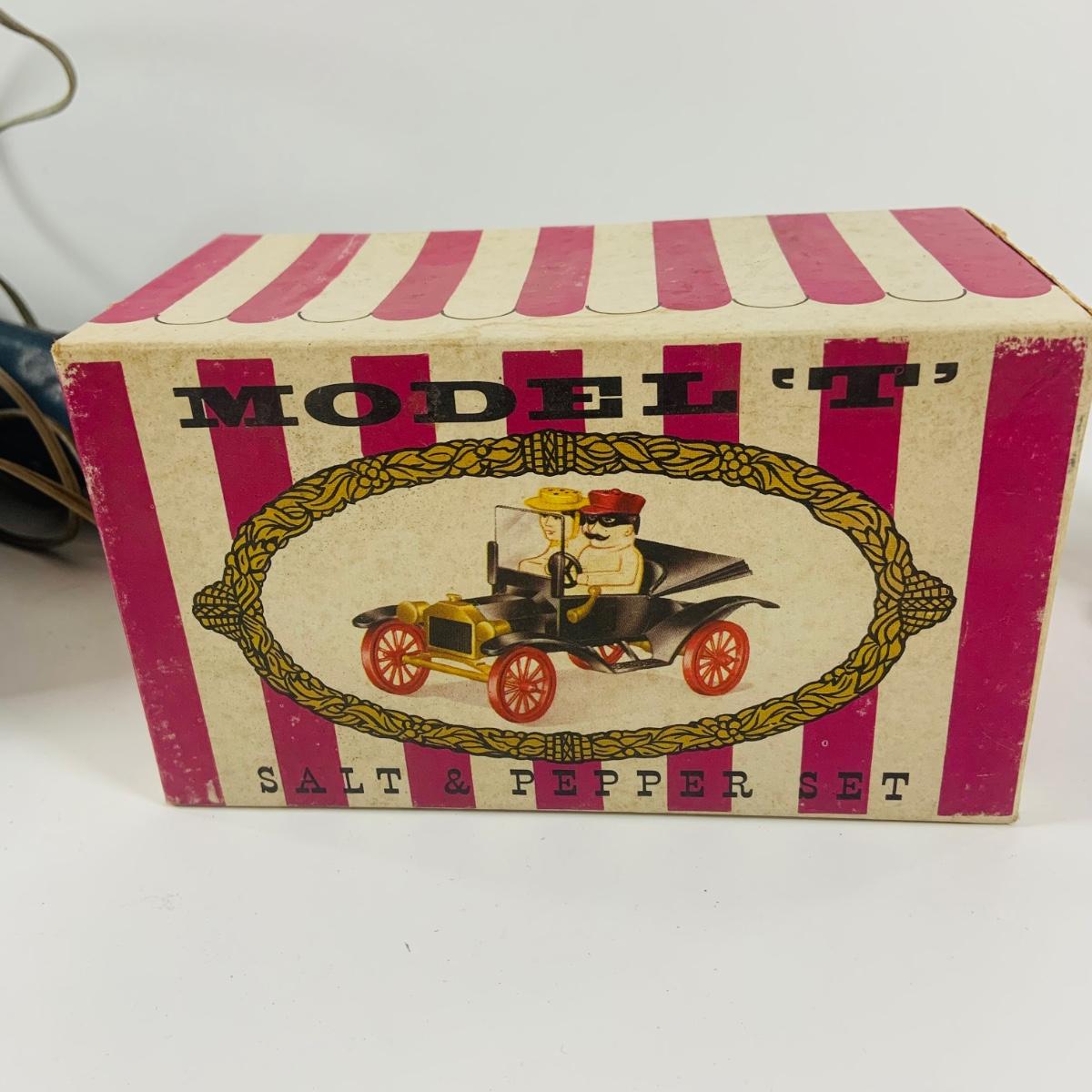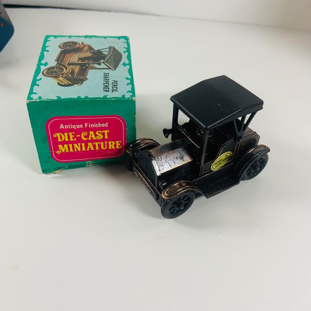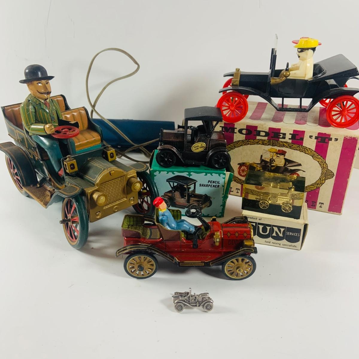 LOT 521:Vintage Collection Tin Toy Cars, Model T Plastic Salt and Pepper Shake Set, Pencil Shapener and Paperweight