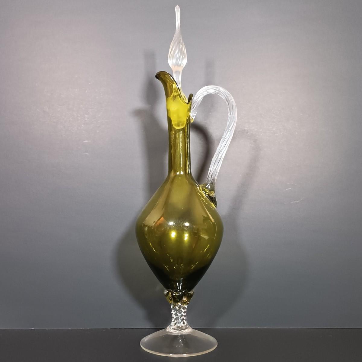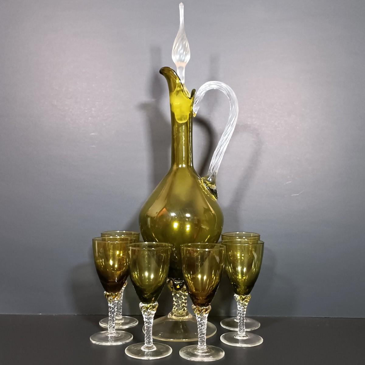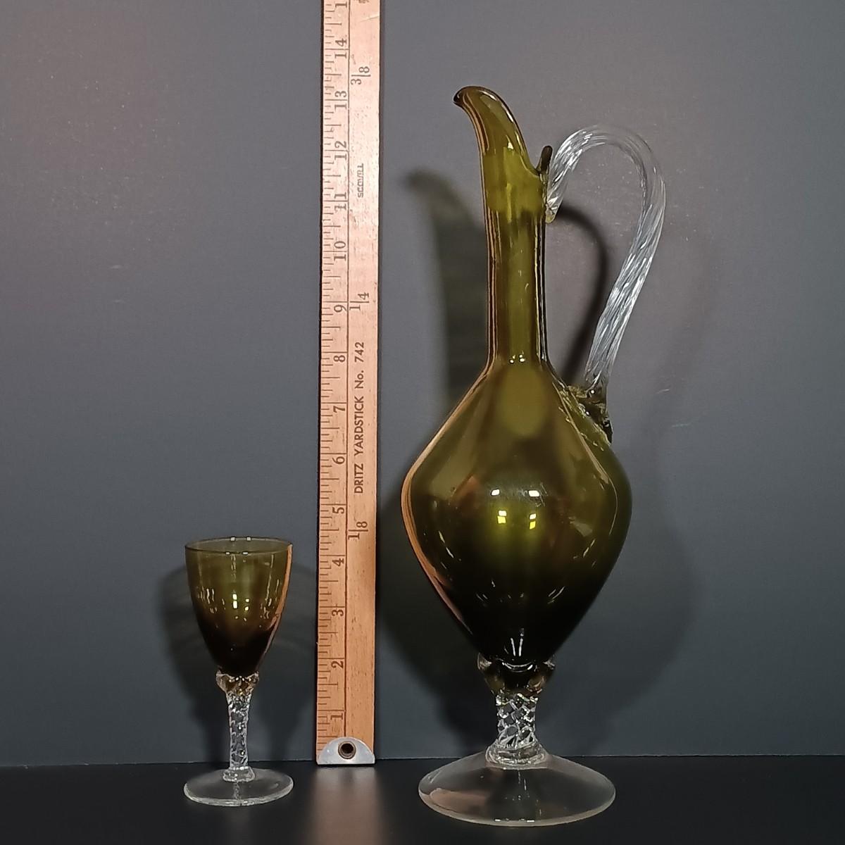 LOT 18: MCM Green Glass Decanter with Cordial Glasses