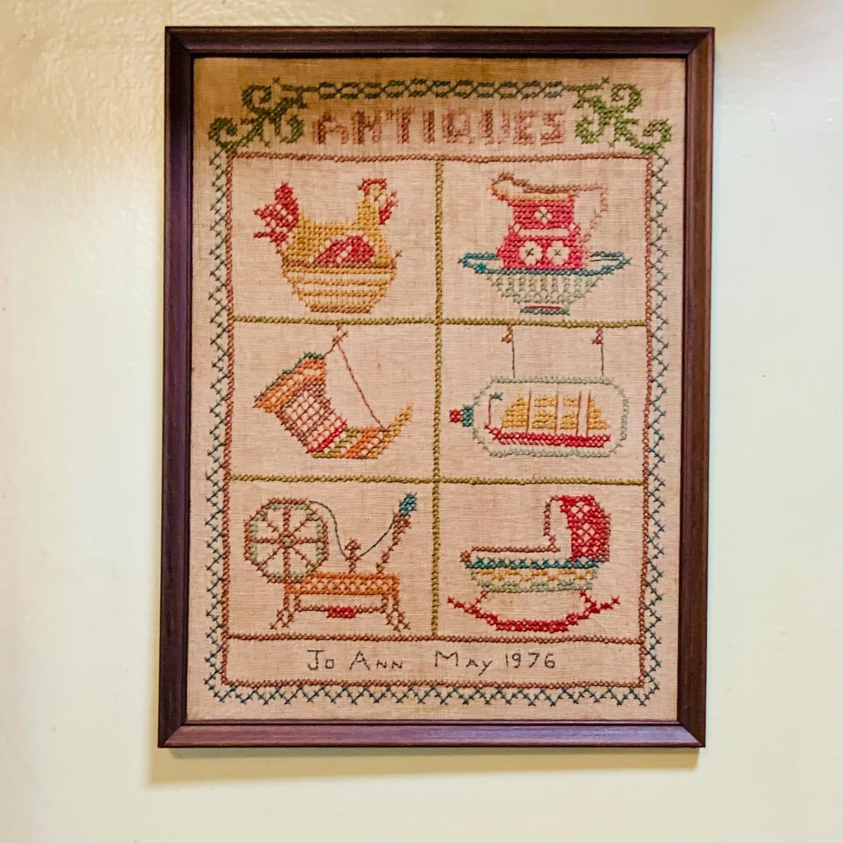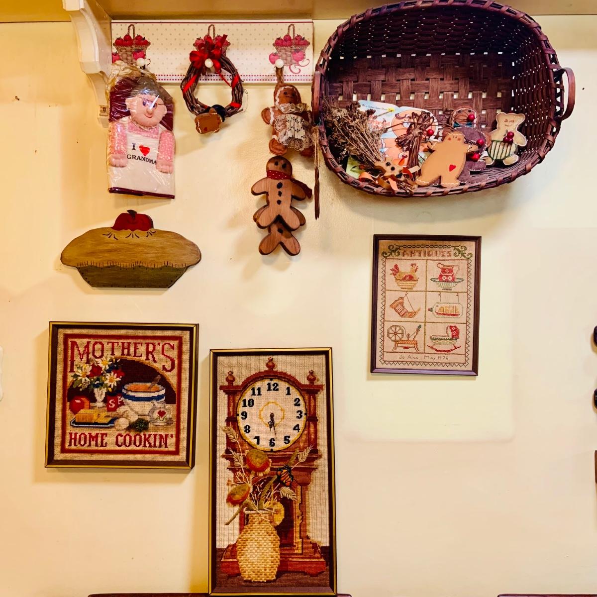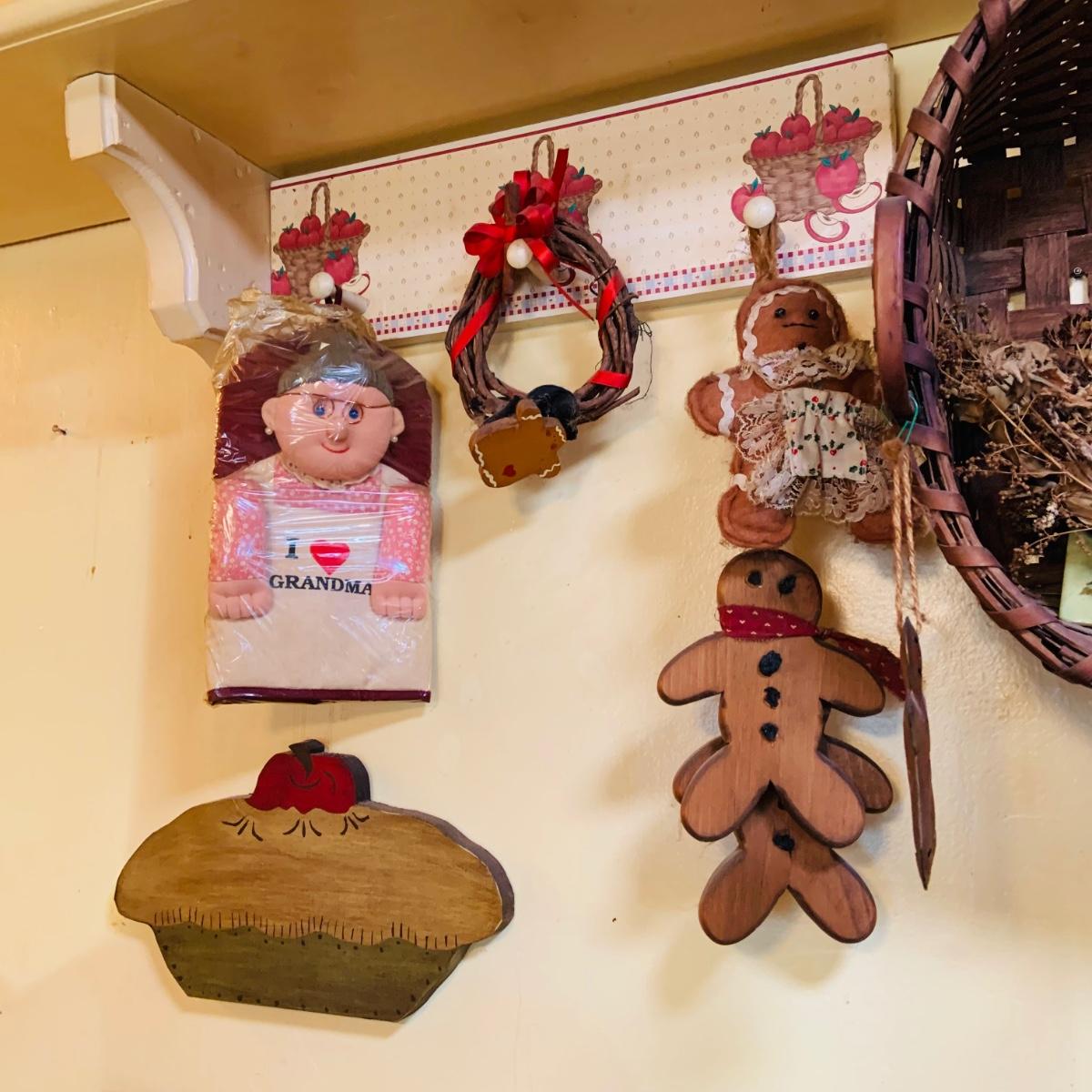 LOT 32: Grandma's Country Kitchen Decor Collection Including Needlework Wall Art, Gingerbread Men Ornaments Basket and Much More