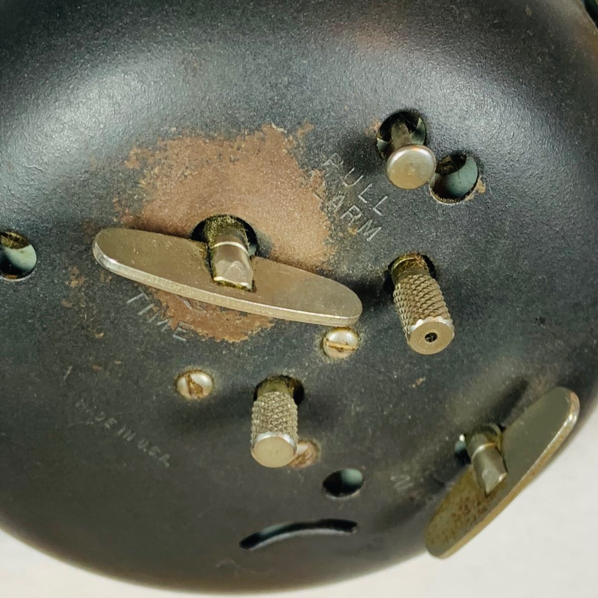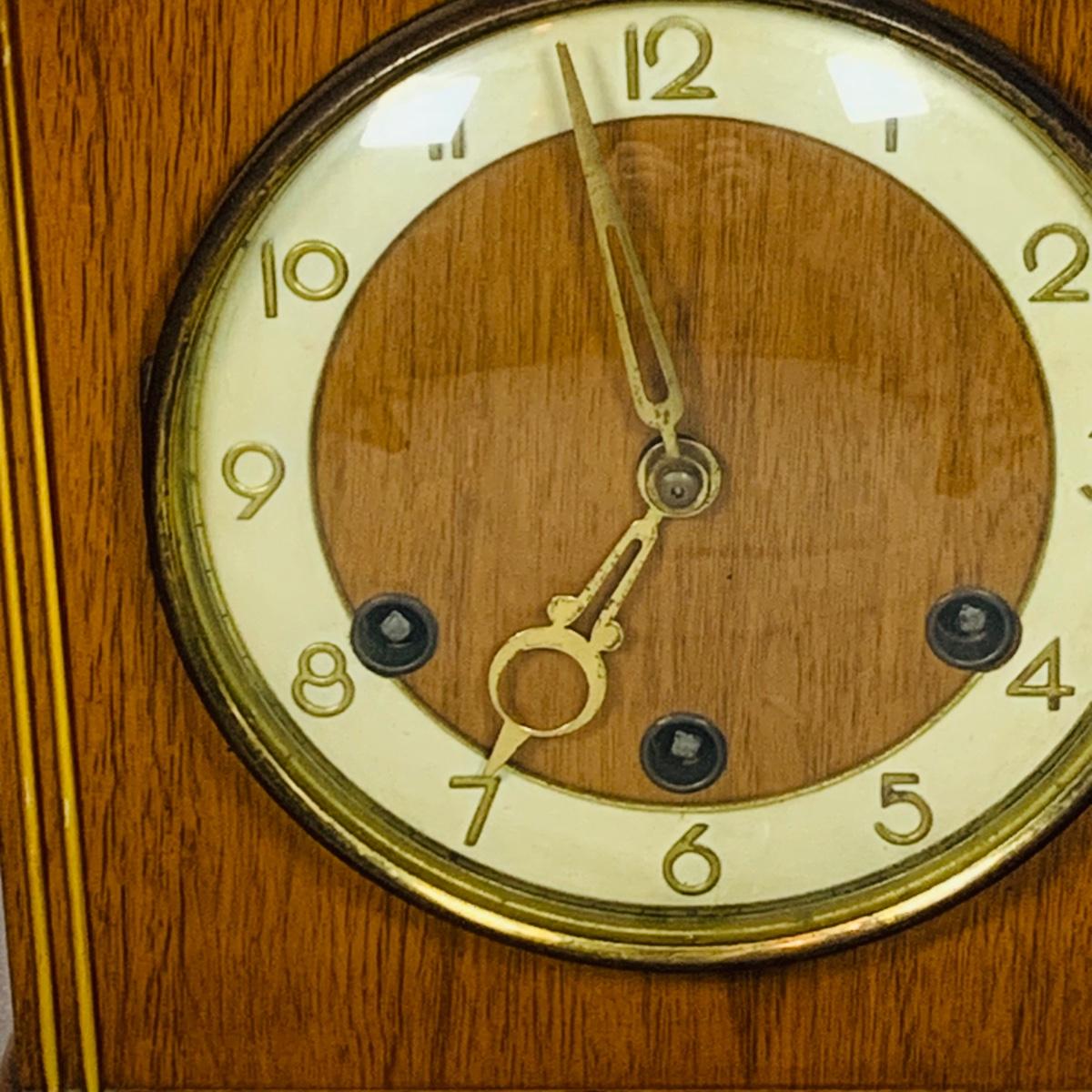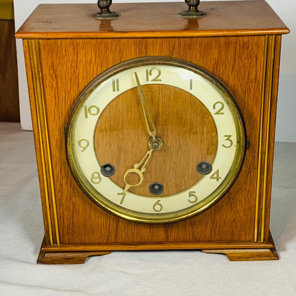 LOT 50: Art Deco/MCM Clocks - Suevia Wood Box Clock with Key and Wesclock Mechanical Alarm Clock