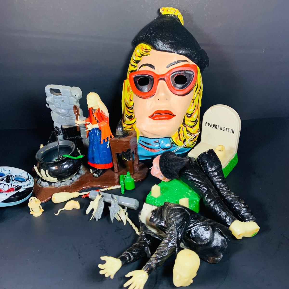LOT: Vintage Aurora Plastics Universal Monster Toy Models/Kits "The Witch" and Boris Karloff's "Frankinstein;" Vintage Children's Halloween Mask and Mo
